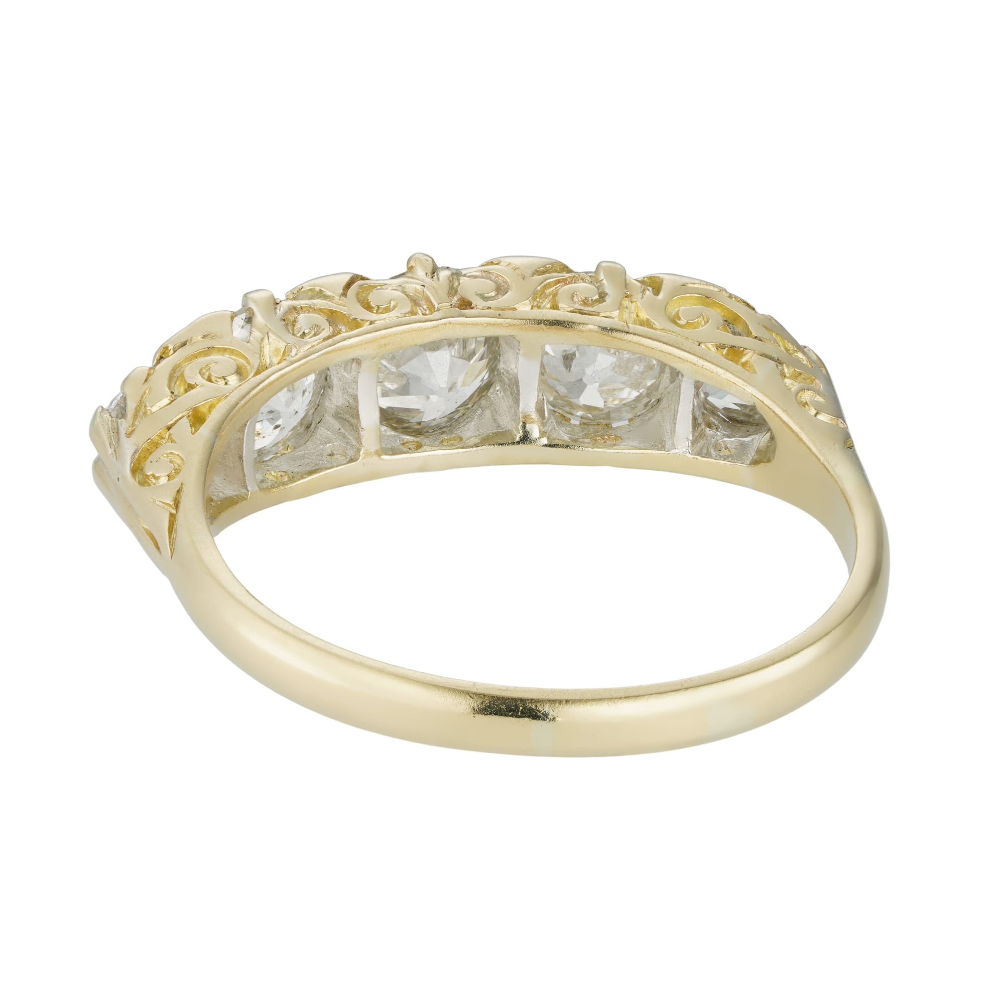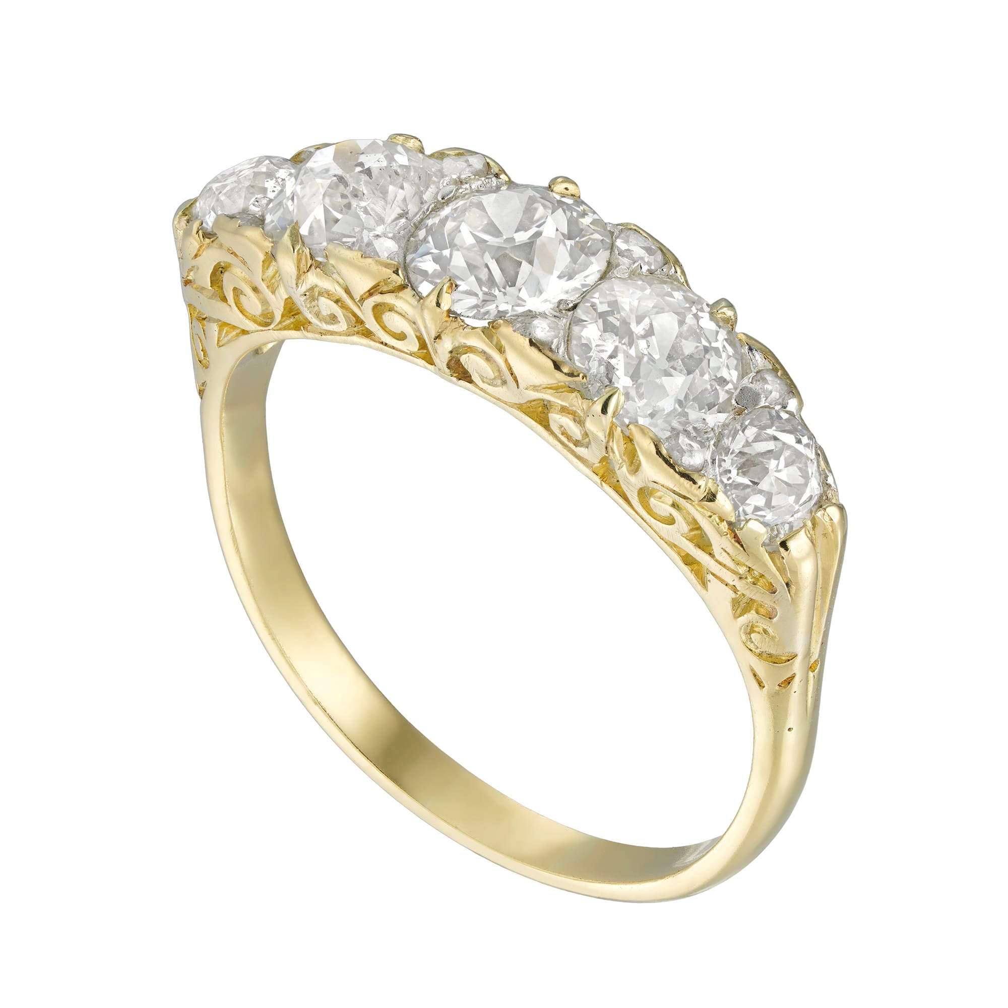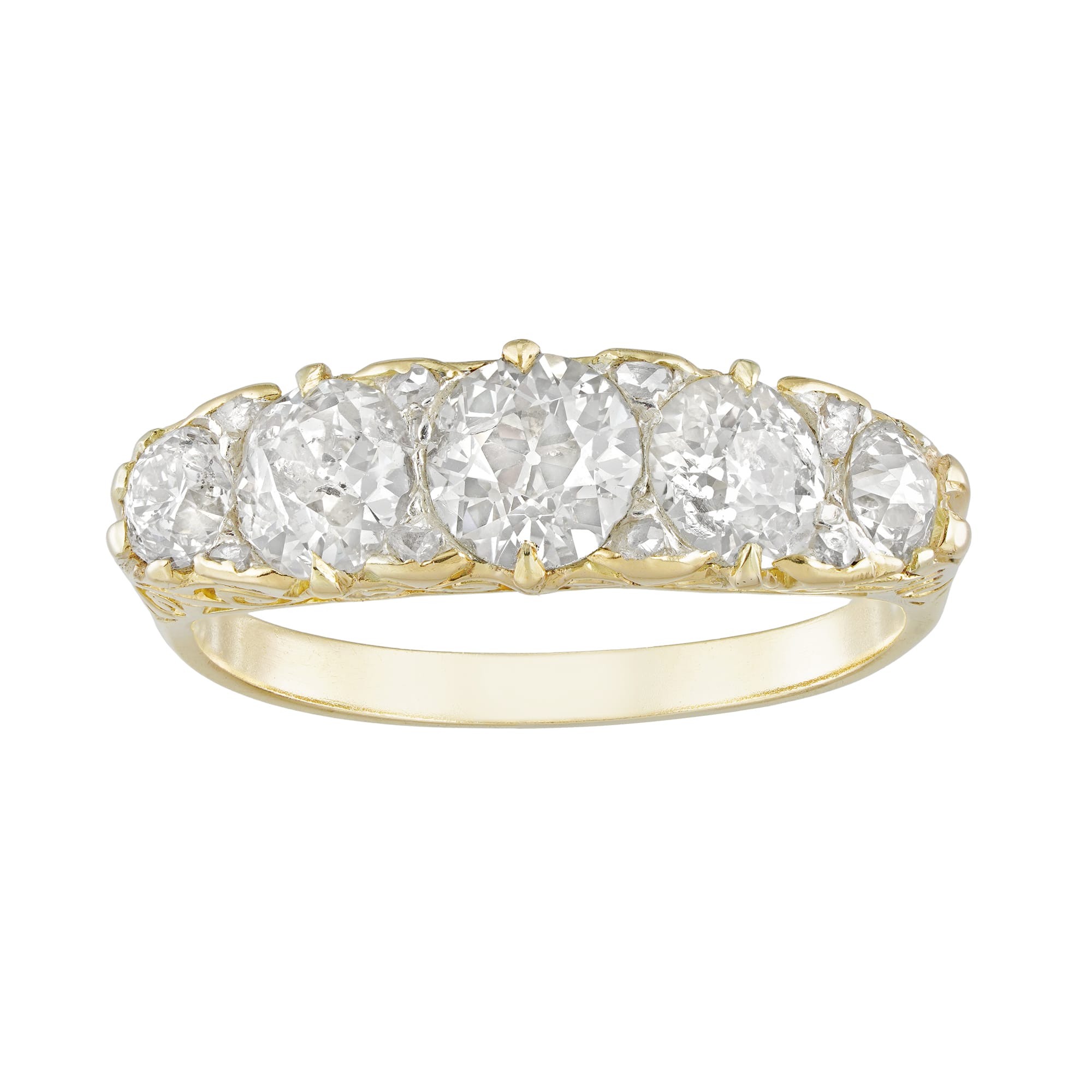 A Victorian five stone diamond ring, the five old European-cut diamonds graduating in size from the centre and weighing 2.20 carats in total, accented by small rose-cut diamonds in-between, all mounted in yellow gold mount with fine engraved scroll decorations ...