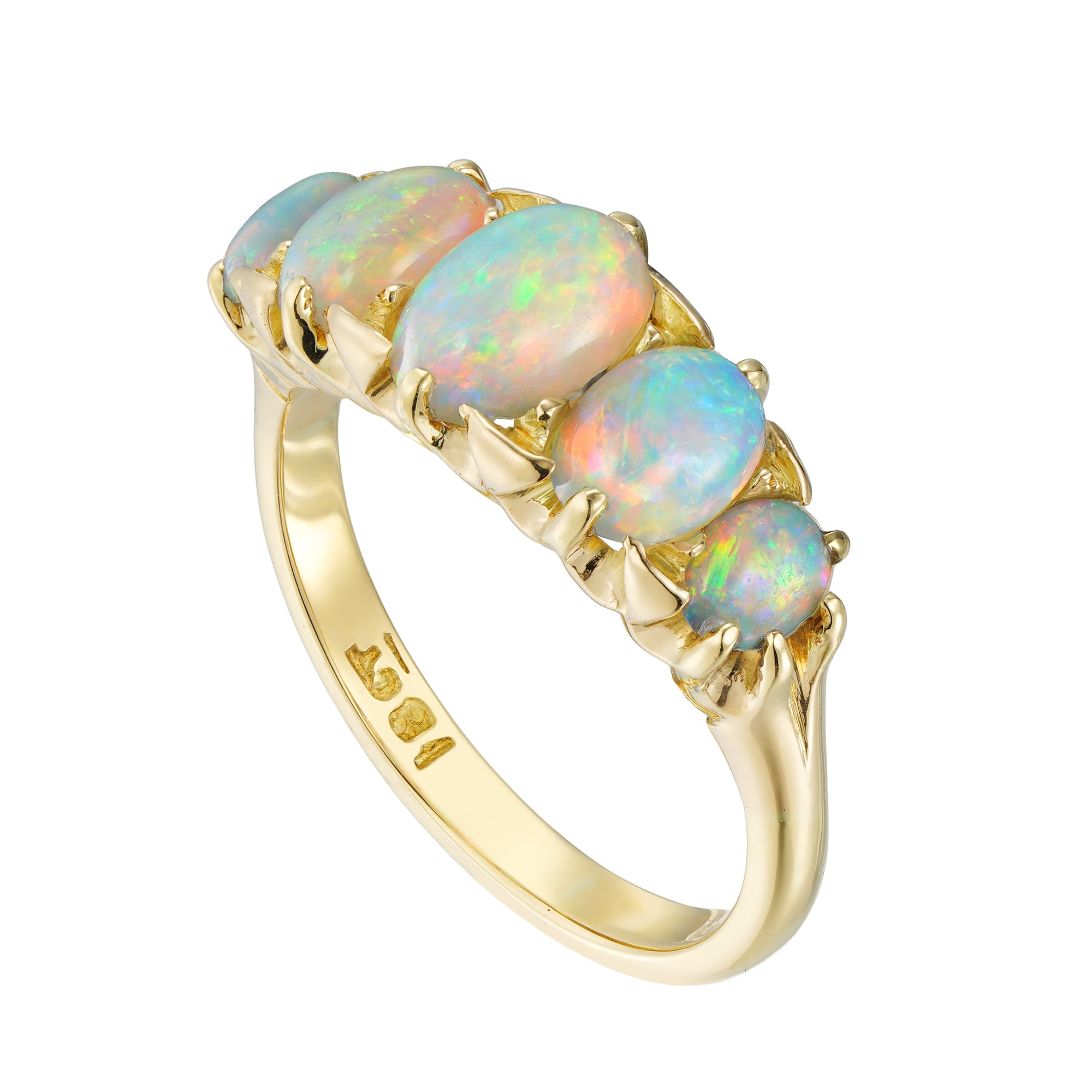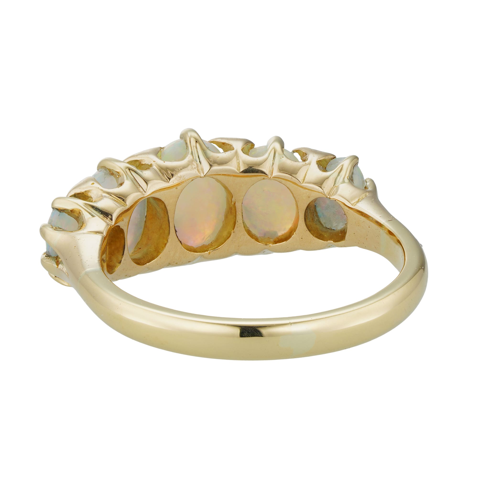 An elegant and colourful early 20th century ring. Gracing this ring are five vibrant oval opals, elegantly arranged in graduating sizes from the centre, and embraced by the warm glow of yellow gold. This exquisite piece stands as a testament to the impeccable craftsmanship and timeless elegance of the year 1910, making it a radiant and sophisticated addition to any discerning jewellery collection.