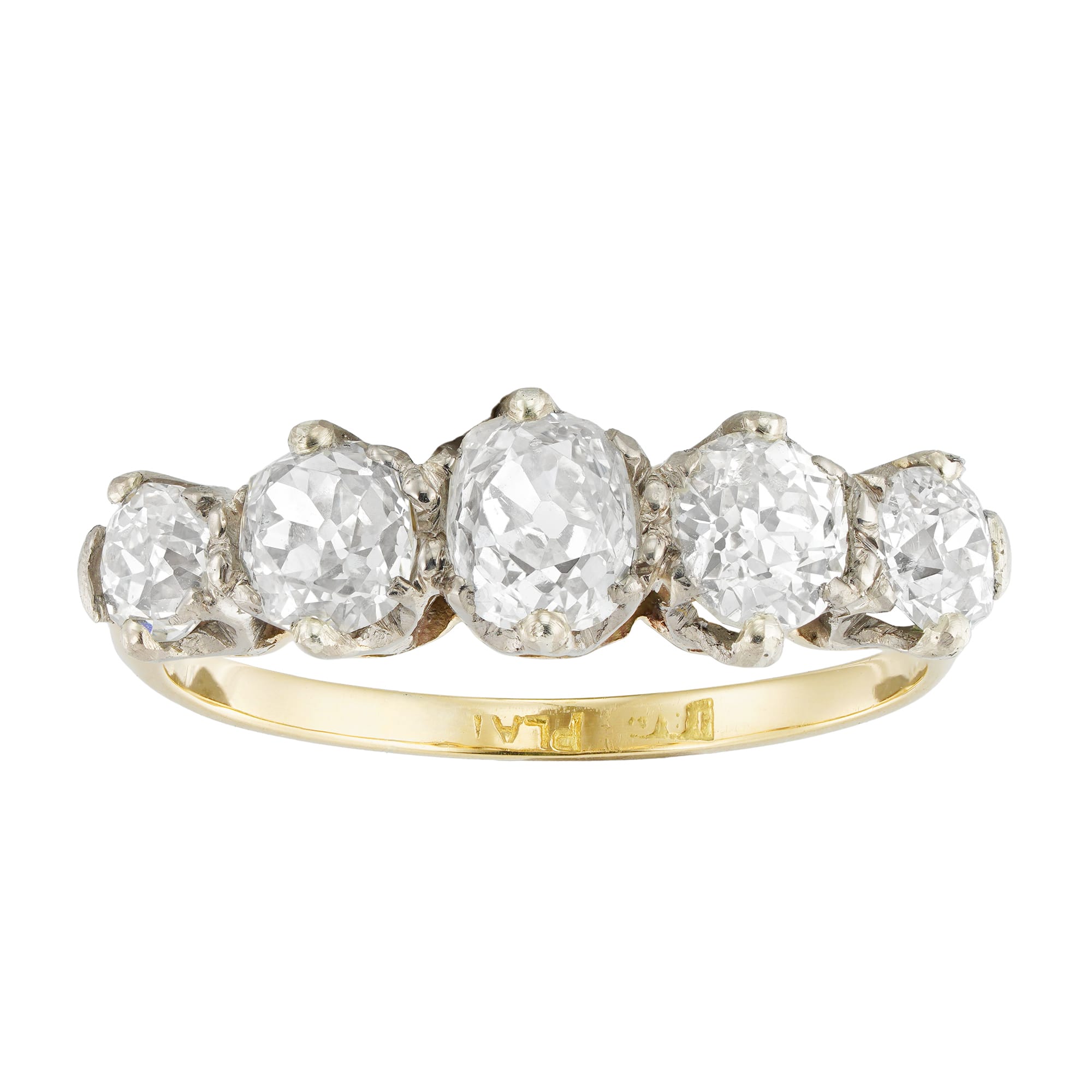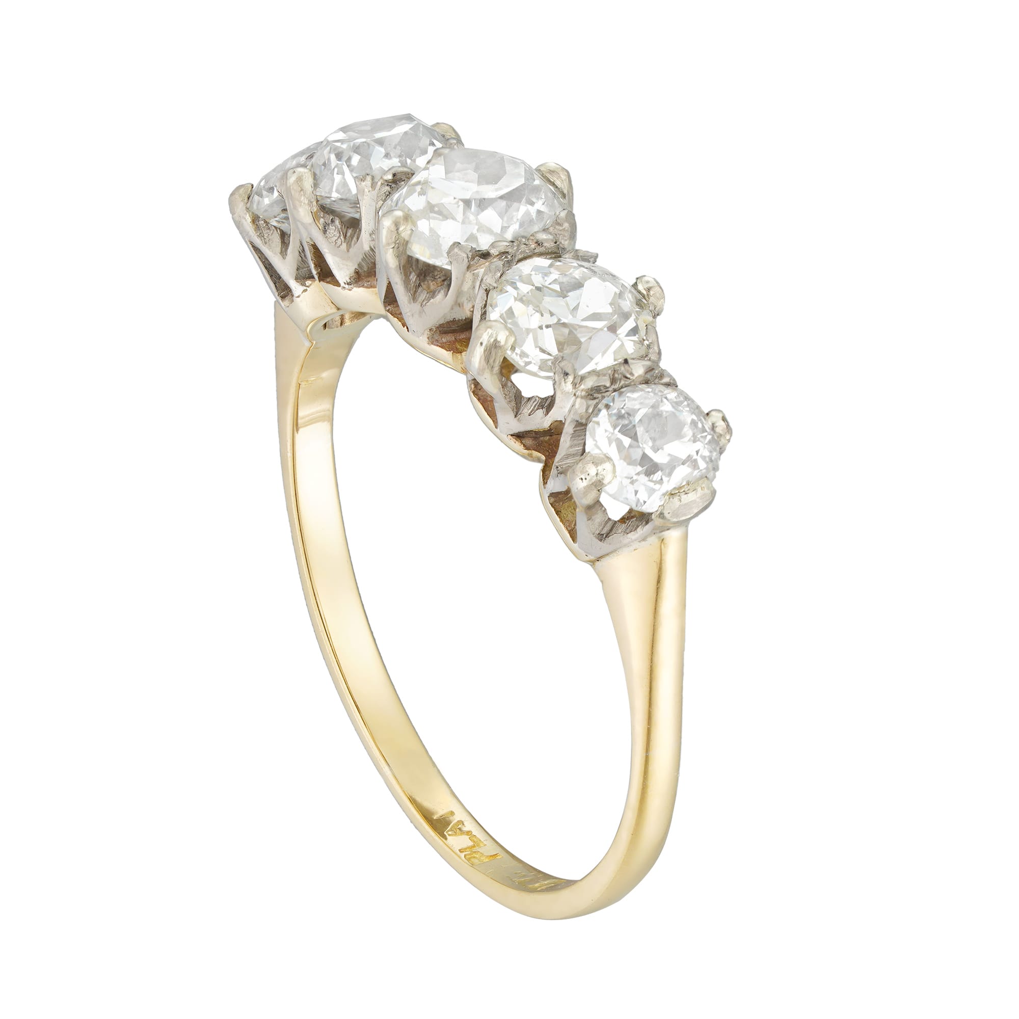 An Edwardian five stone diamond ring, the five old mine cut diamonds weighing a total of 1.92 carats, assessed to be of H-I colour and SI-I clarity, all claw-set in platinum to a yellow gold shank, circa 1910, measuring 2 ...