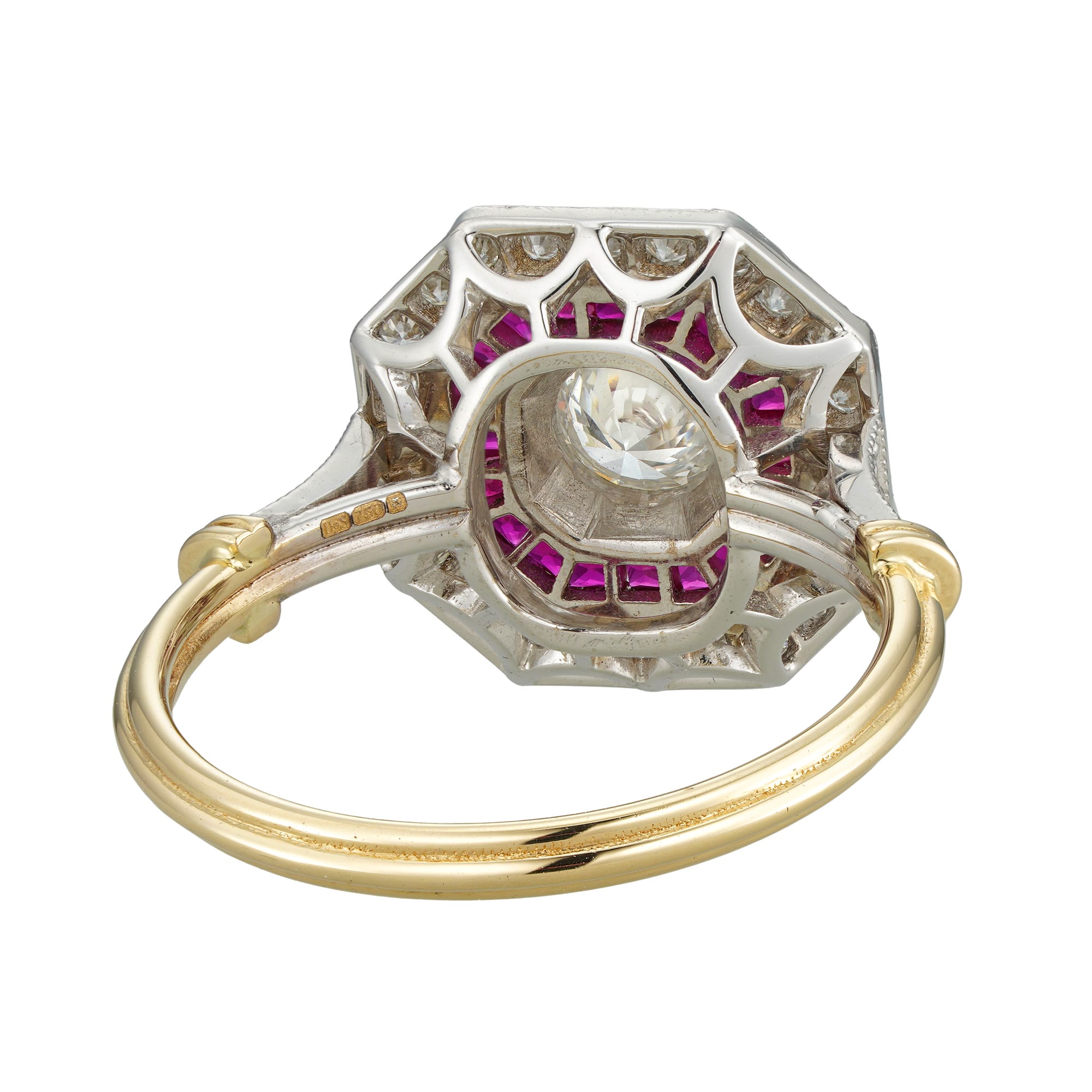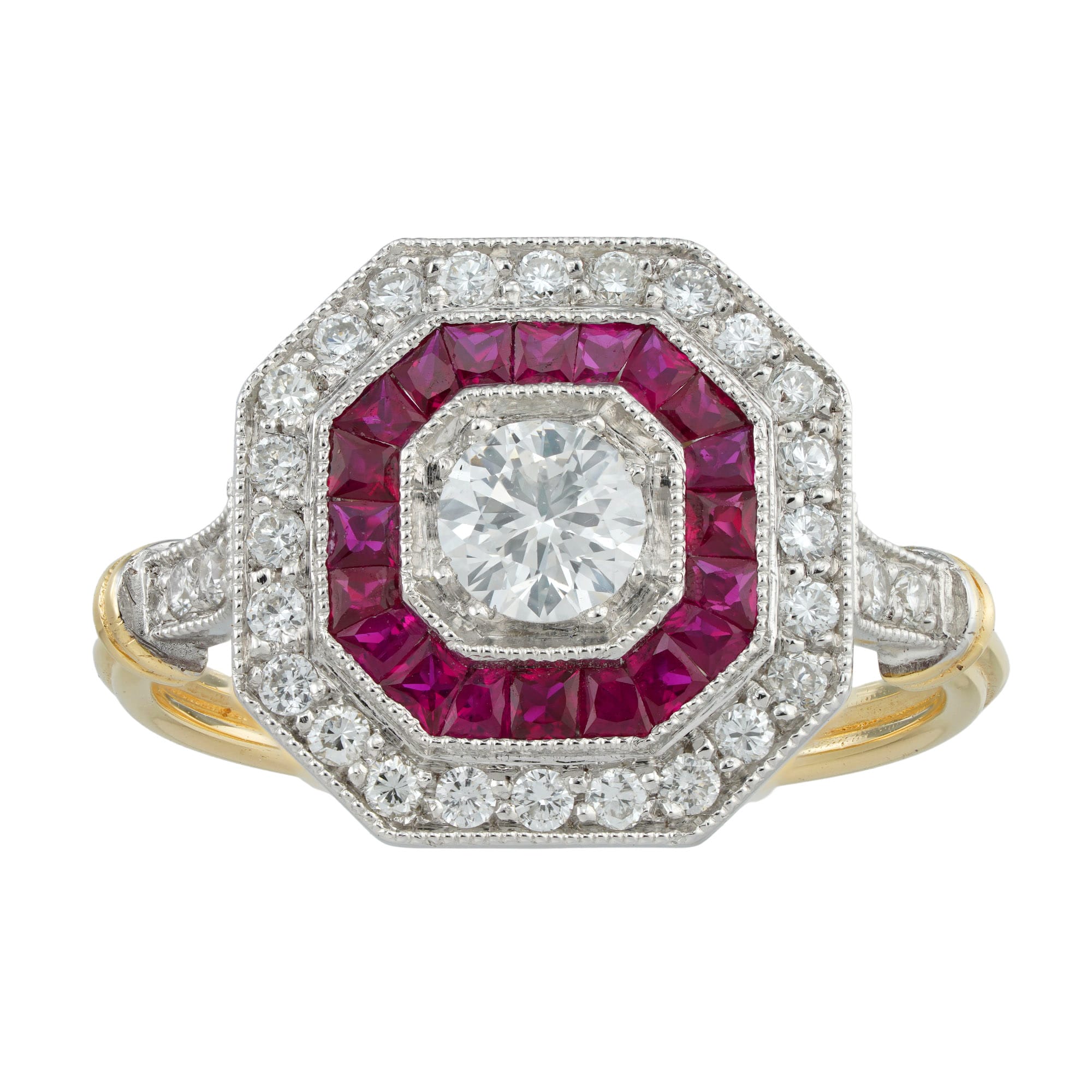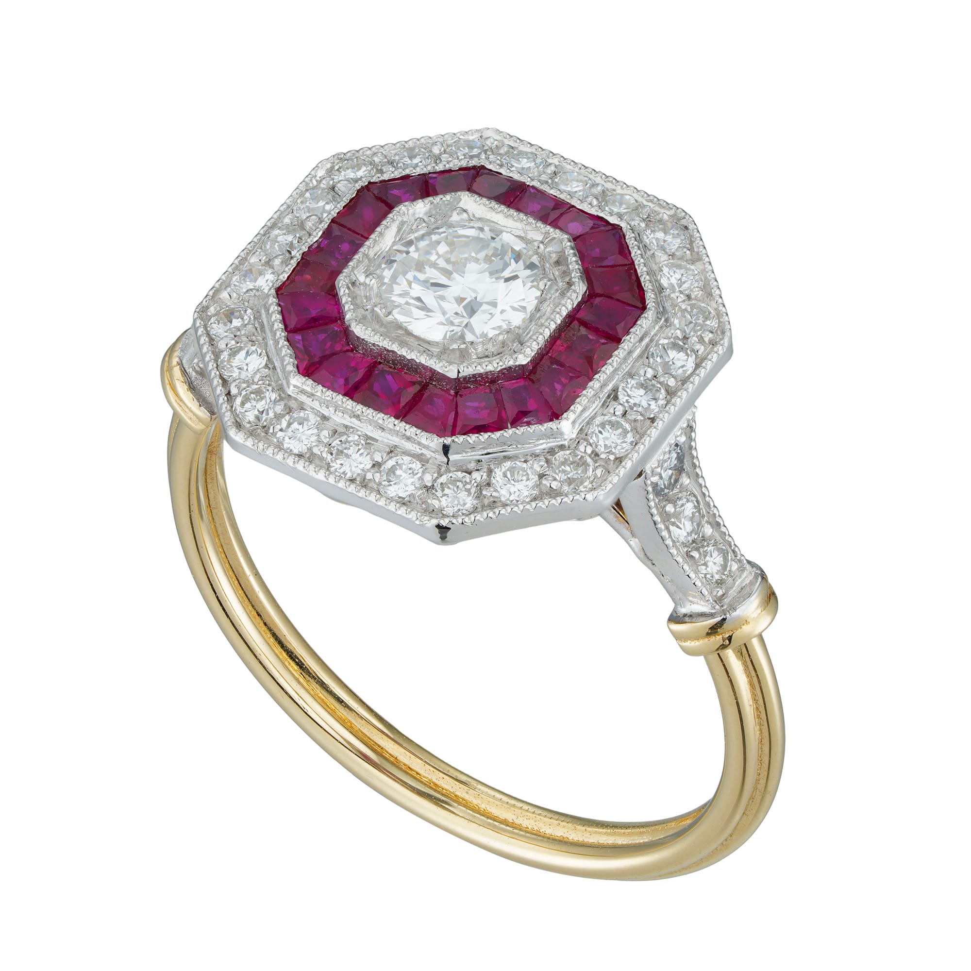 A stylish octagonal cluster ring featuring a round brilliant-cut diamond at its heart, surrounded by a halo of exquisite rubies that provide a vibrant contrast to its brilliance. Encircling the rubies is a shimmer of diamonds extending onto the ring’s shoulders. The enchanting interplay between the white and yellow gold mount adds a touch of warmth and sophistication to this piece. This ring’s harmonious composition evokes the timeless allure of Art Deco style.