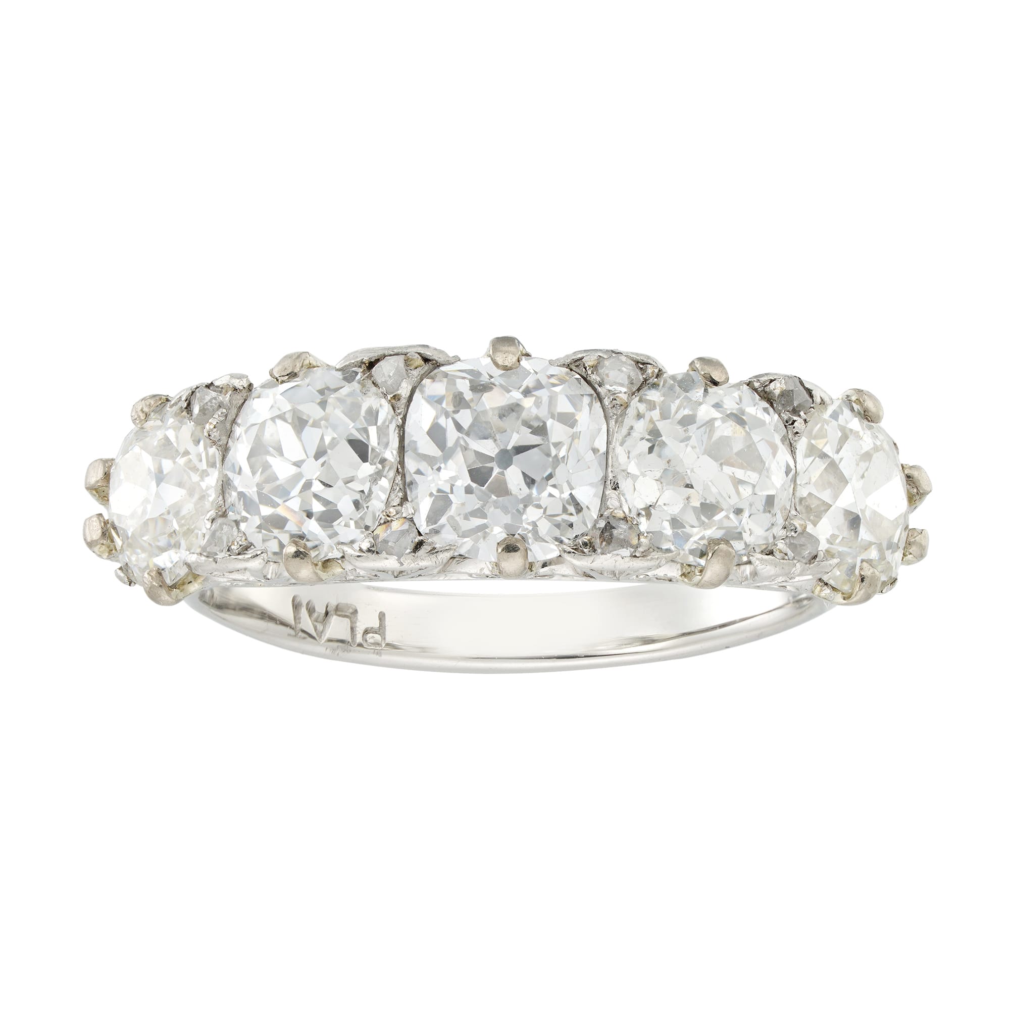 An early 20th century five stone diamond ring, the five old-cut diamonds graduating in size from the centre, weighing 3.50 carats in total, assessed to be of G-H colour and VS-SI clarity, claw-set and embellished with eight small rose-cut diamonds set in-between, all to a platinum mount with scroll engraved decorations and tapering D-section shank, circa 1915, measuring 2.3×0.6cm, finger size K, gross weight 5.2 grams.