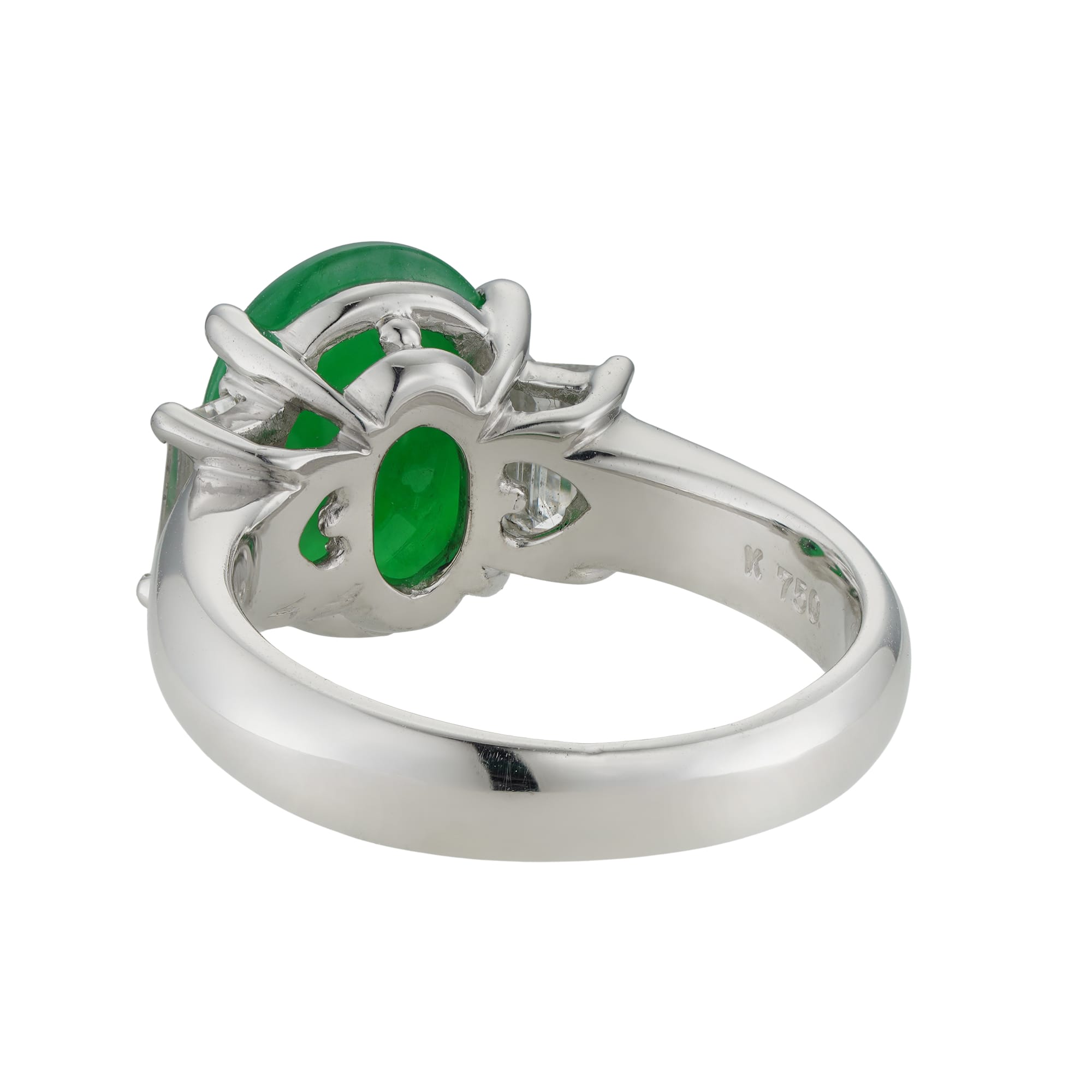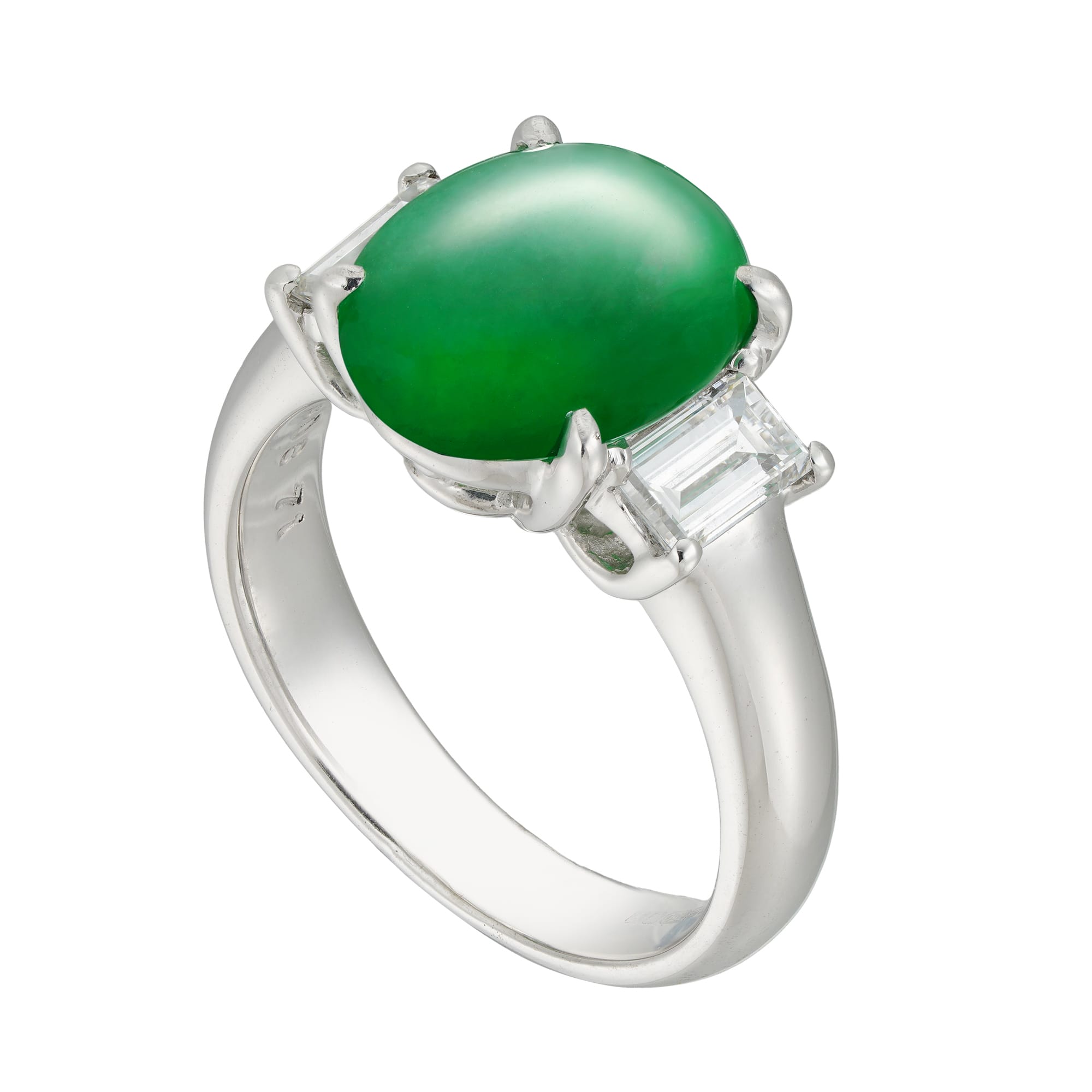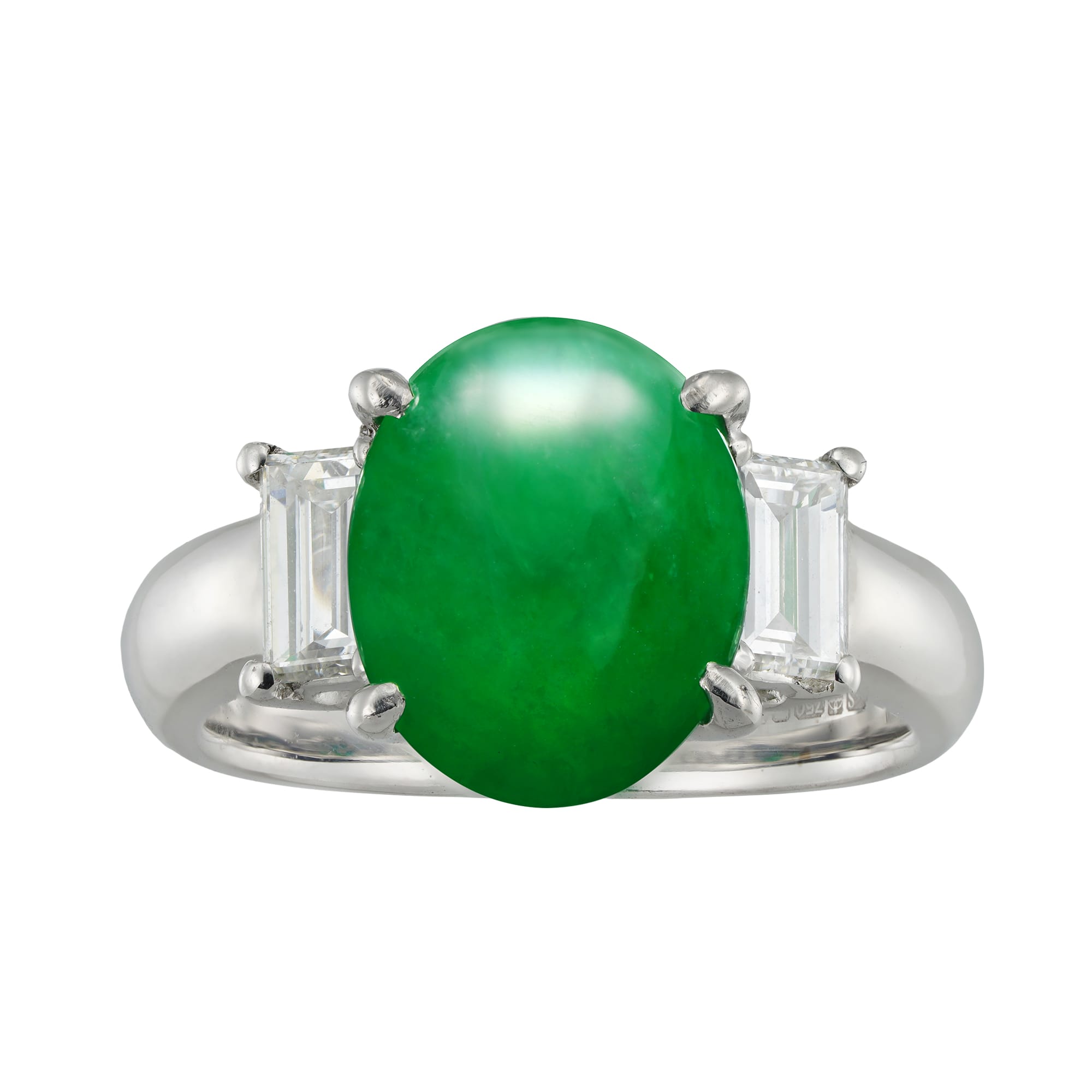 A jade and diamond three stone ring, the oval cabochon-cut jade weighing 3.81 carats and accompanied by GCS report statin to be natural with no indications of impregnation, four-claw set between two baguette-cut diamonds, the one weighing 0.35 carats and the other 0.36 carats, assessed to be of F-G colour and VS clarity, each claw-set to openwork gallery, with D-section shank, mounted in white gold, hallmarked 18ct gold, London, 2023, bearing the Bentley & Skinner sponsormark, measuring 2×1.1cm, finger size M½, gross weight 7.7 grams.