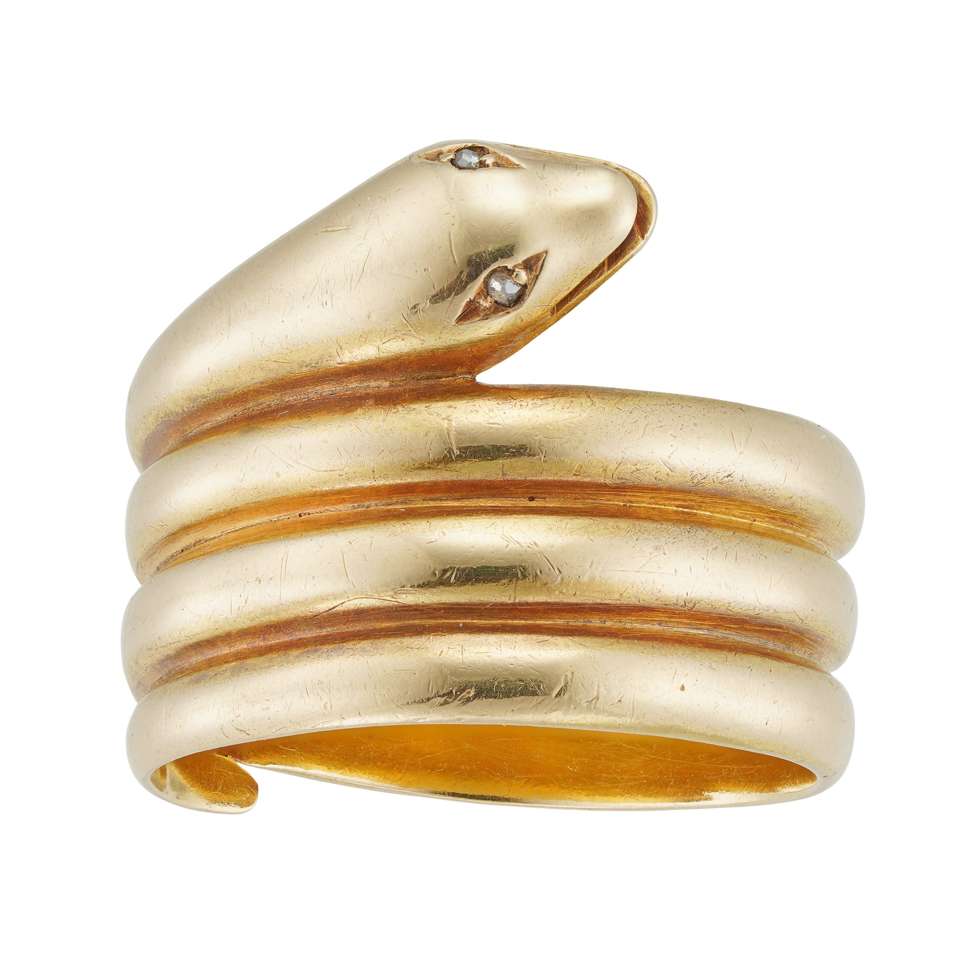 A Late Victorian yellow gold serpent ring, the ring in the form of a coiled snake, the eyes set with two faceted diamond points, all made in yellow gold testing as 18ct, bearing BH & Co mark, circa 1890, measuring approximately 1.6 to 1.7cm, finger size S, gross weight 11.3 grams.