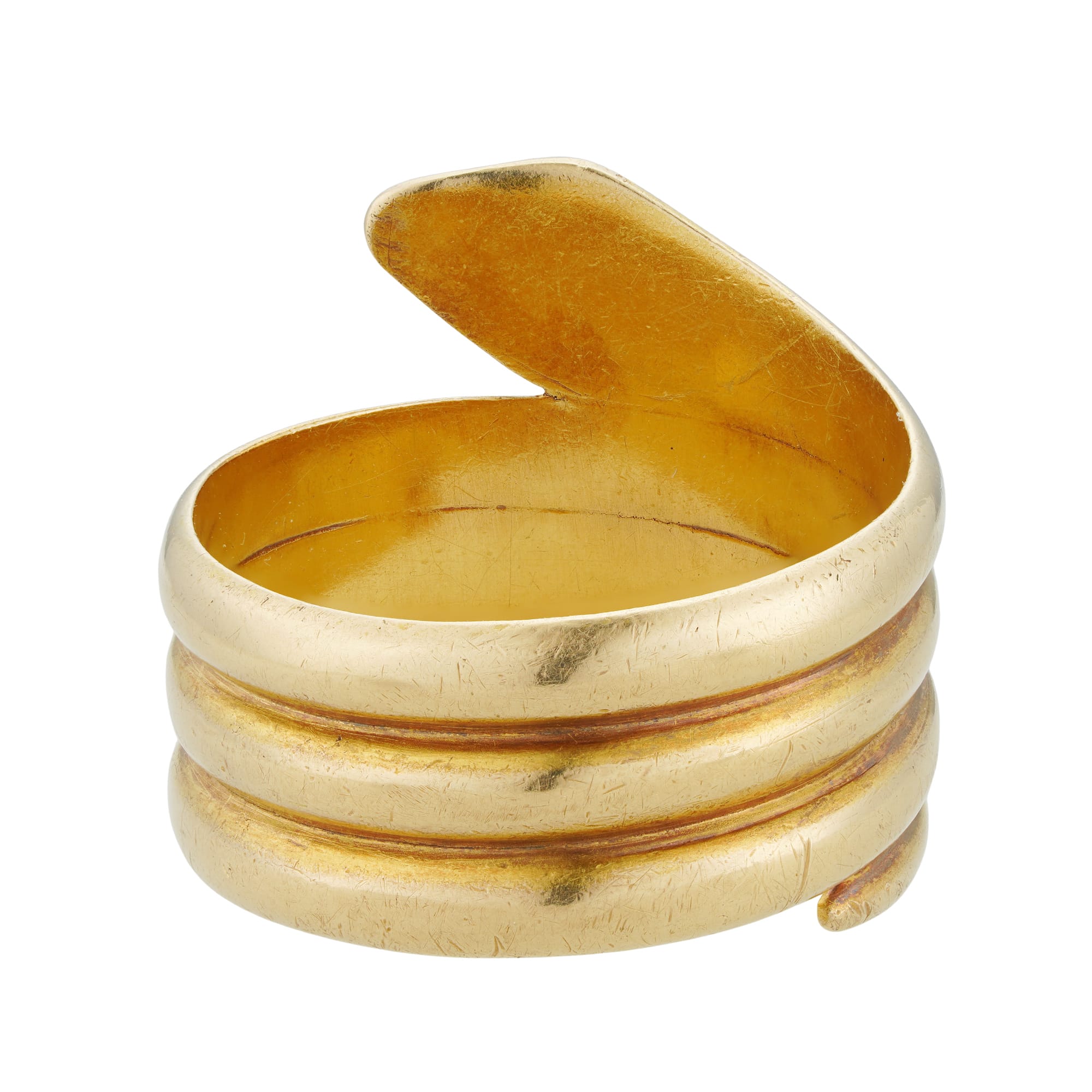 A Late Victorian yellow gold serpent ring, the ring in the form of a coiled snake, the eyes set with two faceted diamond points, all made in yellow gold testing as 18ct, bearing BH & Co mark, circa 1890, measuring ...