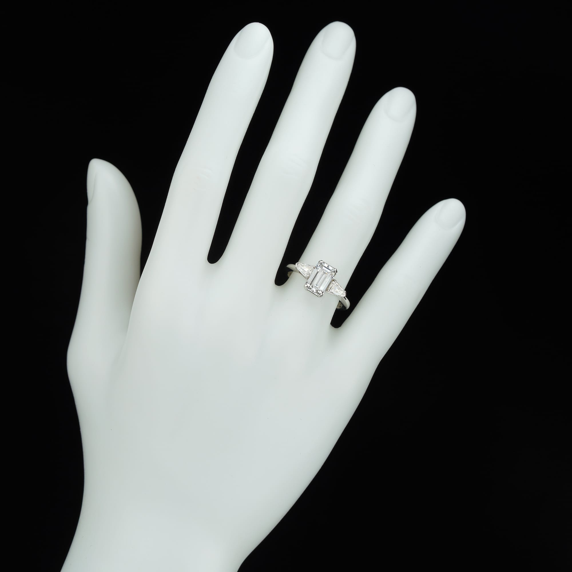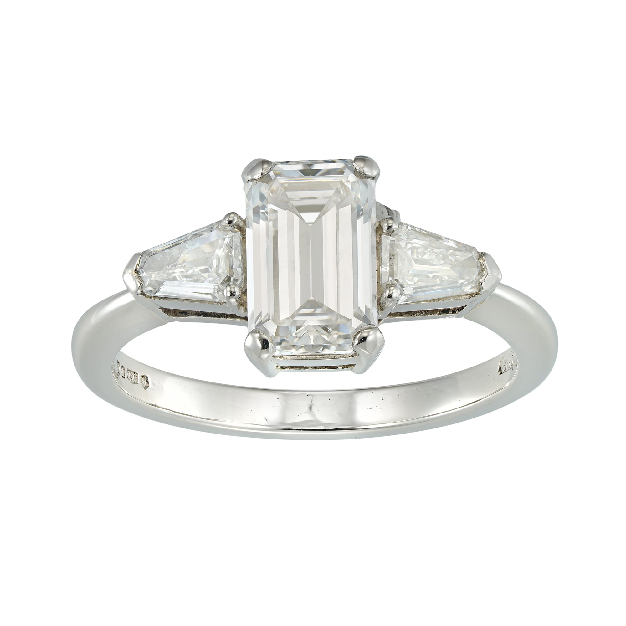 An Emerald-cut Solitaire Diamond Ring, the emerald-cut diamond weighing 1.47 carats of E colour, VS1 clarity, accompanied by GIA certificate, four claw-set to the centre of two shield shaped-cut diamonds, weighing a total of 0.32 carats, claw-set to a tapered D-section shank, hallmarked platinum, London 2006, bearing the Bentley & Skinner sponsor mark, head measuring 0.9 x 1.6 cm, finger size L, gross weight 4.8 grams.