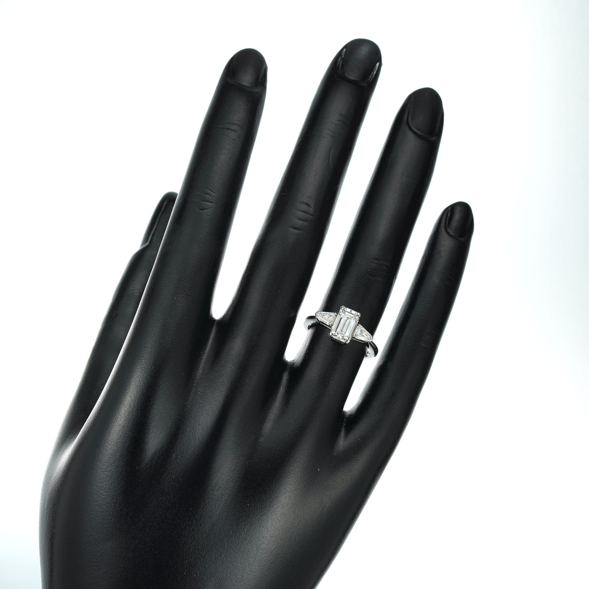An elegant and timeless diamond and platinum ring. This ring features a sparkling emerald-cut diamond weighing just shy of one and a half carats, which catches and reflects the light beautifully. The central diamond is surrounded on either side by two lovely, tapered baguette-cut diamonds, which add interest to this piece. This chic ring would make a wonderful engagement ring.