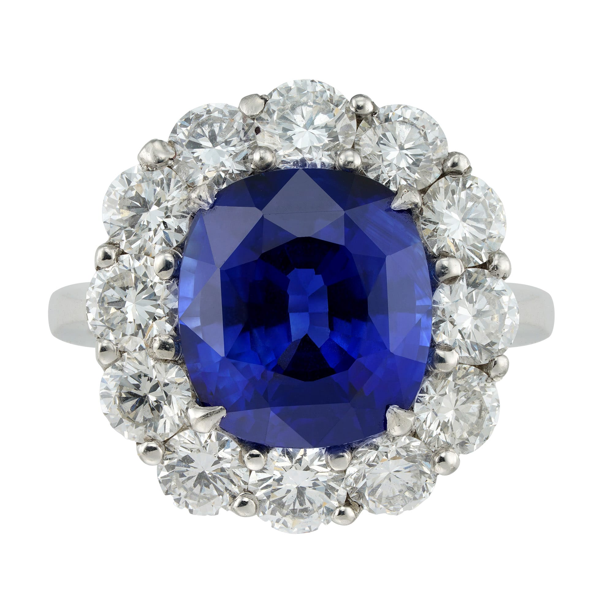 A classic sapphire ring. This platinum ring features an impressive central sapphire surrounded by twelve dazzling diamonds. Sapphire and diamond cluster rings are a popular choice for engagement rings, and this piece is a resplendent example of this type of ring.