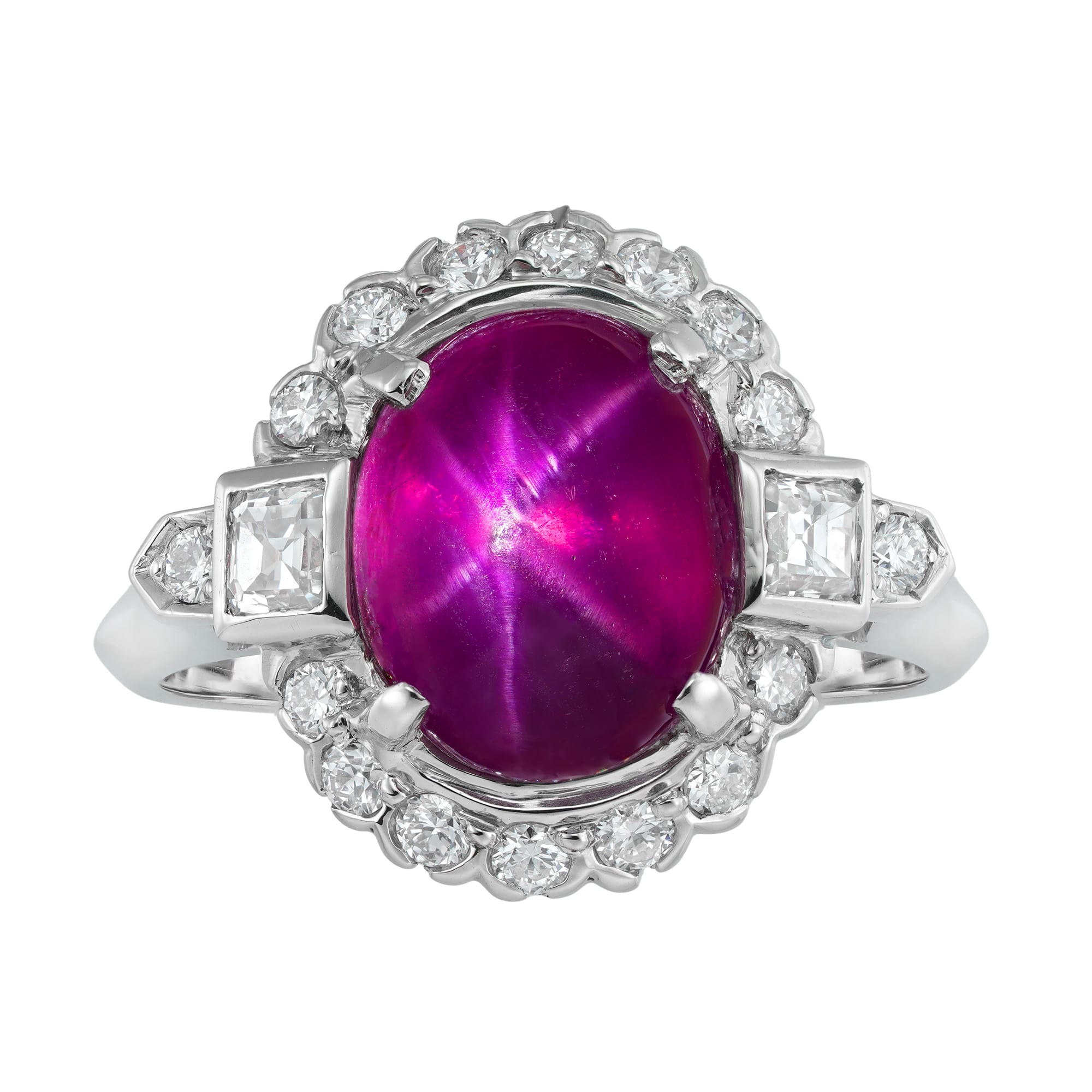 A Burmese star ruby and diamond cluster ring, the oval cabochon star ruby weighing 4.67cts accompanied by Gemlab certificate stating to be untreated and of Burmese origin, with brilliant and carré-cut diamond cluster surround, the diamonds estimated to weigh ½ carat in total, all set to a platinum mount with D-section shank, stamped platinum, circa 1950, the head measuring approximately 1.4×1.9cm, finger size J, gross weight 6.6 grams.