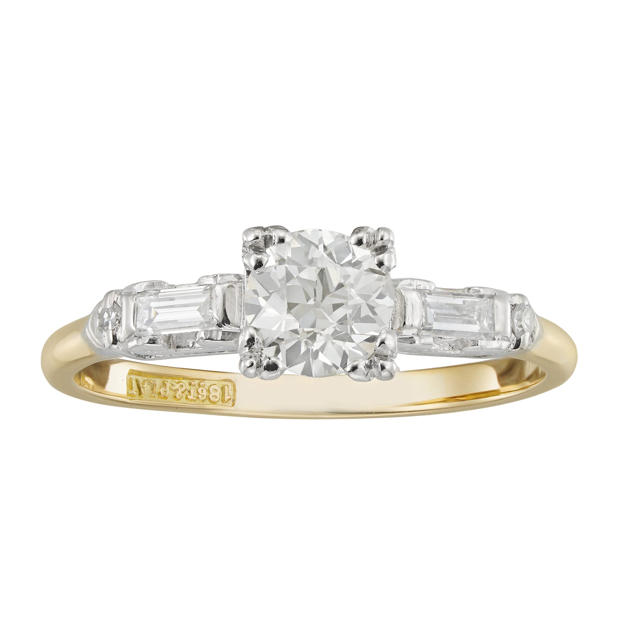 More informationA vintage diamond solitaire ring, the old brilliant-cut diamond weighing 0.78 carats and assessed as L colour and SI1 clarity, each shoulder set with a baguette and a small eight-cut diamond estimated to weigh a further total of 0.2 carat, all claw-set in platinum mount with openwork gallery with scroll decorations, to a gold D-section shank, marked 18ct gold & plat, circa 1950, measuring 2.2×0.6cm finger size R, gross weight 3.5 grams.
