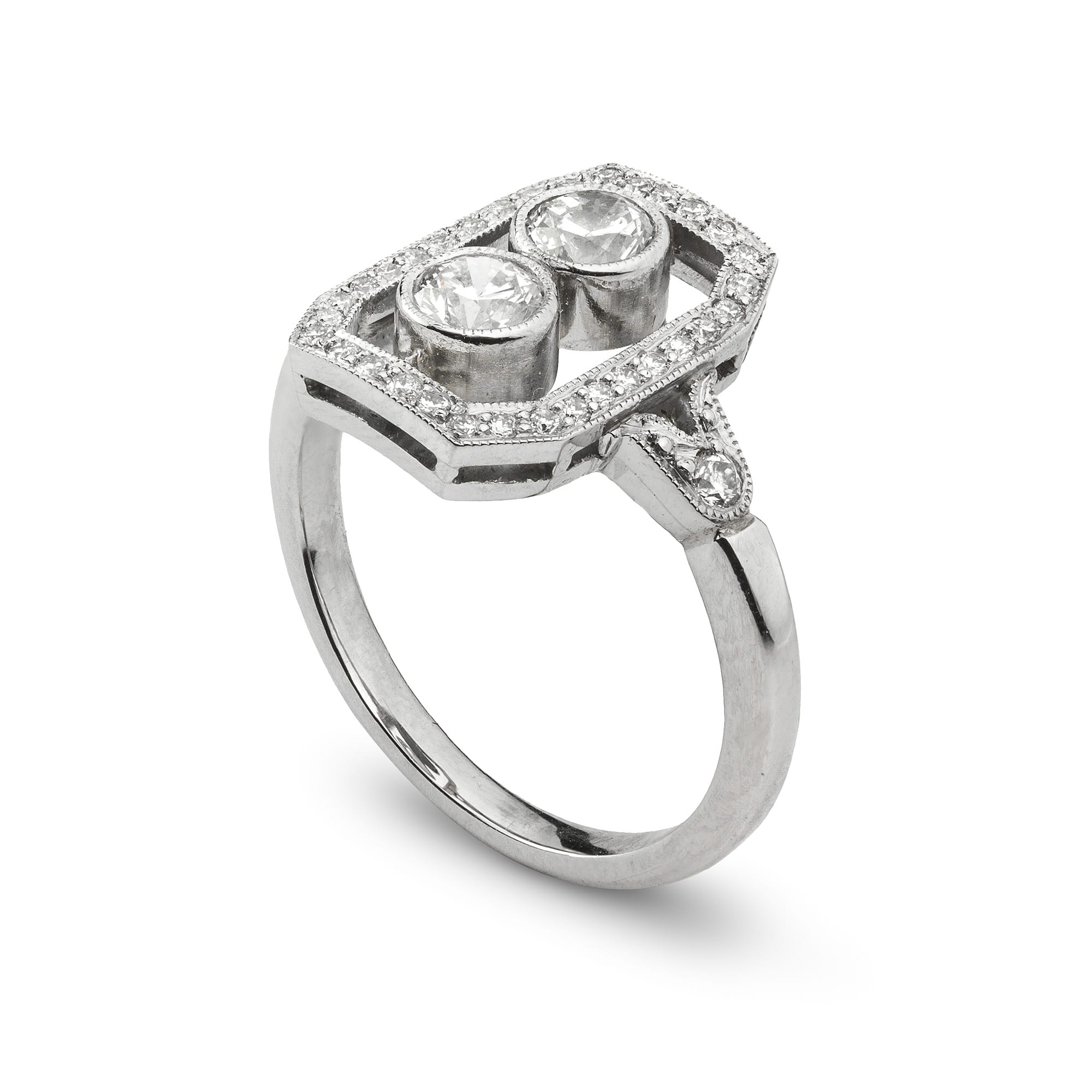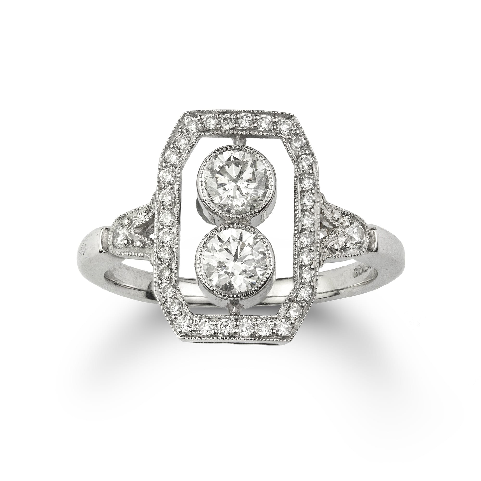 An Art Deco style diamond ring, the central two old brilliant-cut diamonds weighing 0.52 carats in total, vertically set within diamond-set rectangular frame, all milligrain-set in platinum mount with openwork foliate diamond set shoulders, and a D-section shank, hallmarked platinum London 2015, bearing the Bentley and Skinner sponsor mark, measuring 2 x 1.9cm, finger size L, gross weight 5.3 grams.
