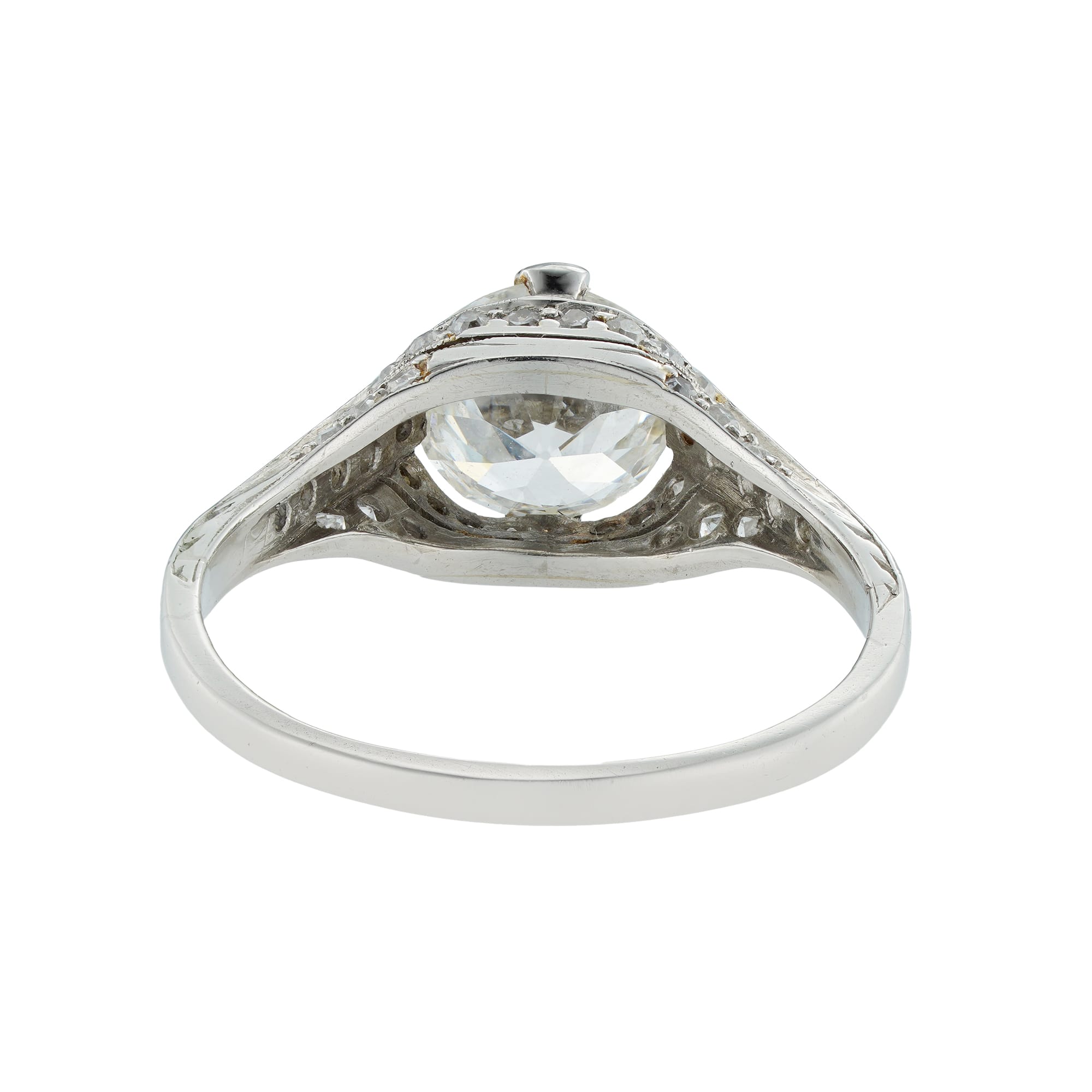 An Art Deco diamond solitaire ring, the round transition-cut diamond weighing 1.24 carats of I colour and VS2 clarity, accompanied by De Beers Grading Report, four claw-set to a platinum mount encrusted with old-cut diamonds and finely engraved shoulders, circa ...