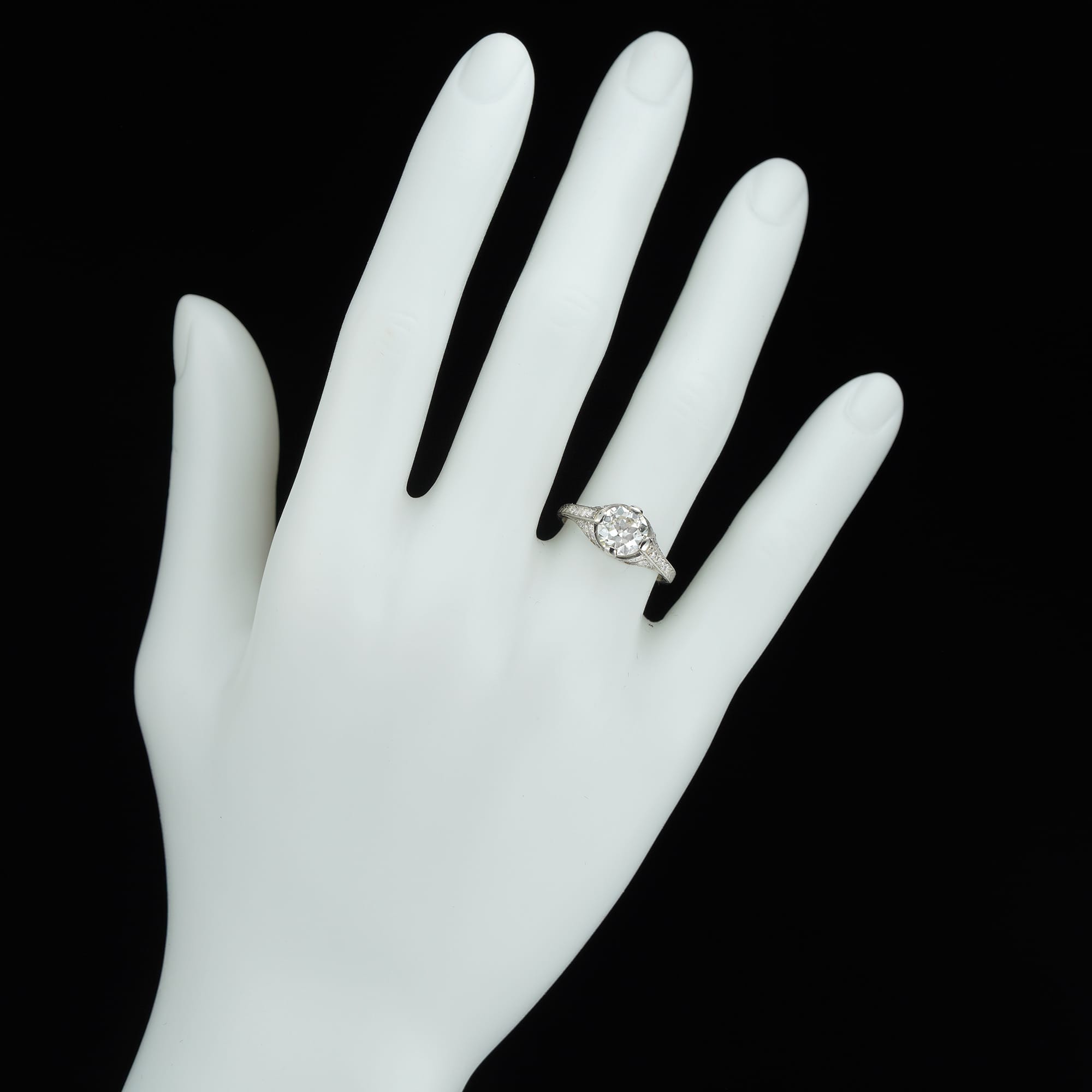 A dazzling Art Deco ring. It was made in around 1920 and features a scintillating central diamond elegantly set in a platinum mount set throughout with further diamonds. The shoulders and mount are intricately carved, giving this gorgeous piece antique character. This piece would make an ideal antique engagement ring.