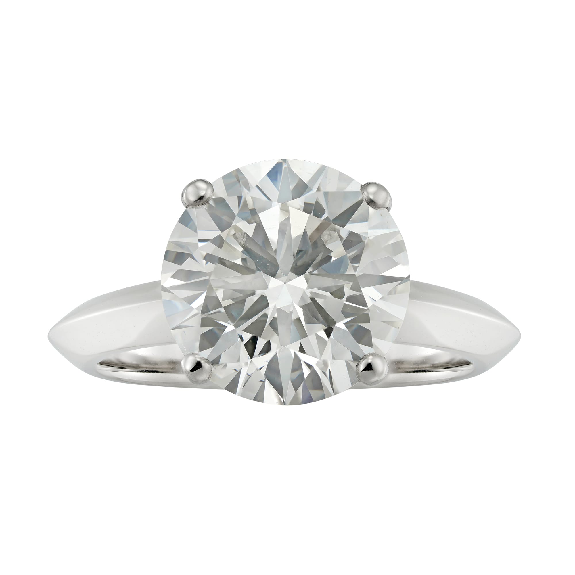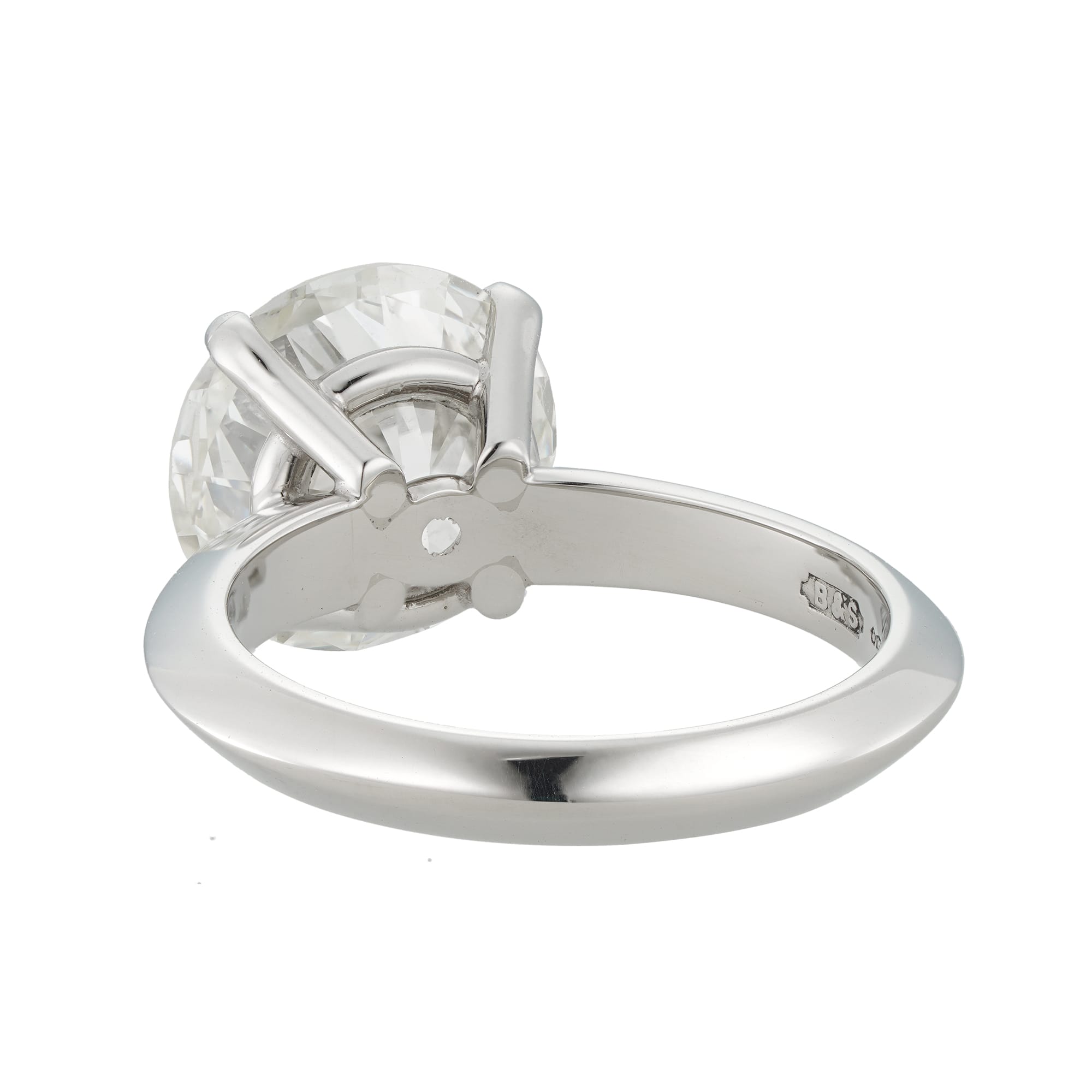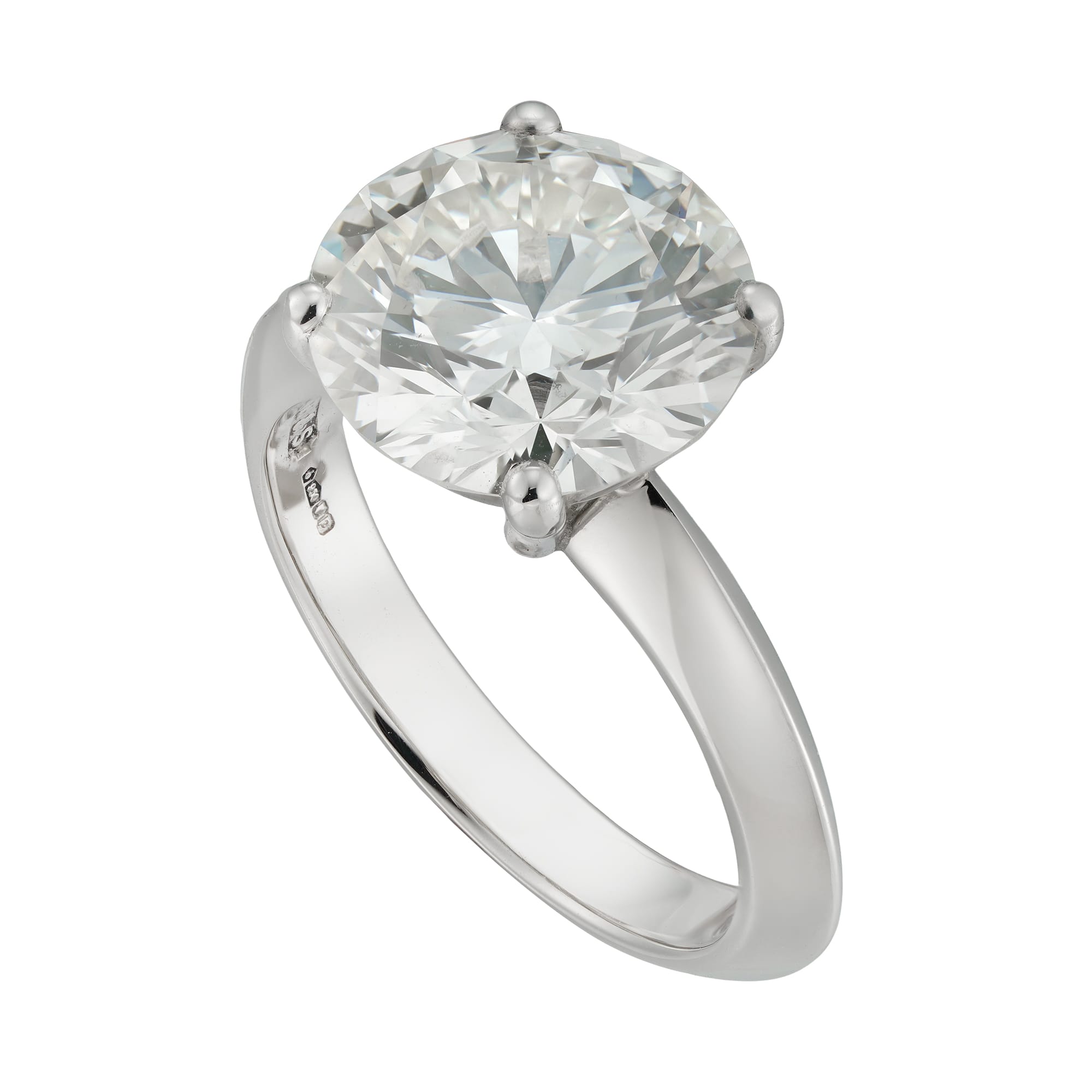 A diamond solitaire ring, the round brilliant-cut diamond weighing 4.06 carats and accompanied by GIA report stating to be of K colour and VS2 clarity, four claw set in a double-gallery collet, mounted in platinum with knife-edge tapering shank, hallmarked 950 platinum, London, 2014, bearing the Bentley & Skinner sponsormark, measuring 2×1.1cm, finger size J½, gross weight 6.4 grams.
