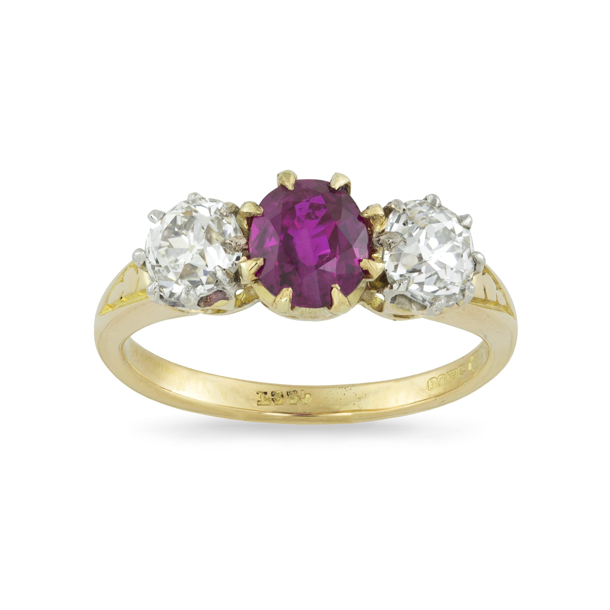 An Edwardian three stone ruby and diamond ring, the oval faceted ruby weighing 0.95 carats accompanied by GCS Report stating to be of Burmese origin with no indication of heat treatment, set between two old brilliant-cut diamonds weighing approximately a total of 1.10 carats, claw set in platinum and yellow gold mount, to a gold tapered D-section shank, circa 1910, later hallmarked London 18ct gold, head measuring 0.7×1.6cm, finger size L, gross weight 4 grams.
