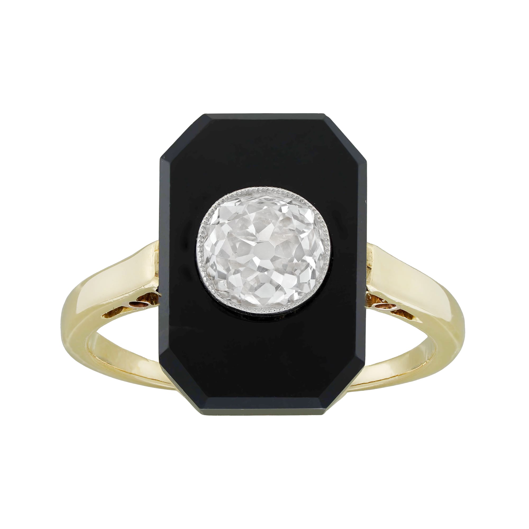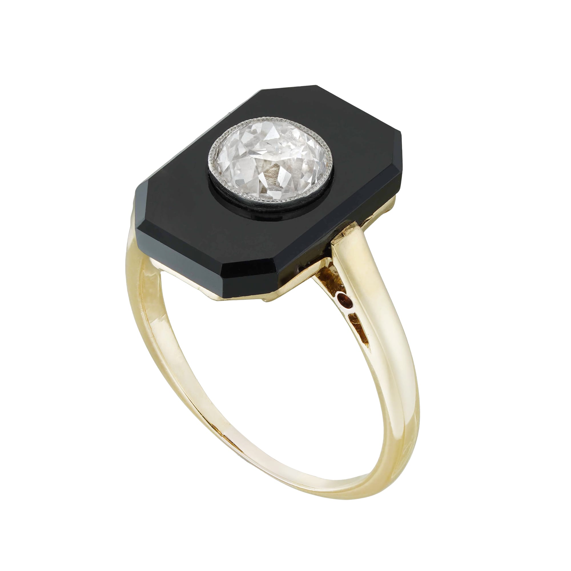 An Art Deco diamond and onyx ring, the old European-cut diamond estimated to weigh 0.6 carats assessed to be of J-K colour and SI clarity, millegrain rub-over set in an octagonal-cut onyx plaque measuring approximately 12 x 8mm, to yellow gold mount with D-section shank with chenier shoulders, circa 1920, measuring 1.7 x 1.3cm, finger size G ½, gross weight 2.7 grams.