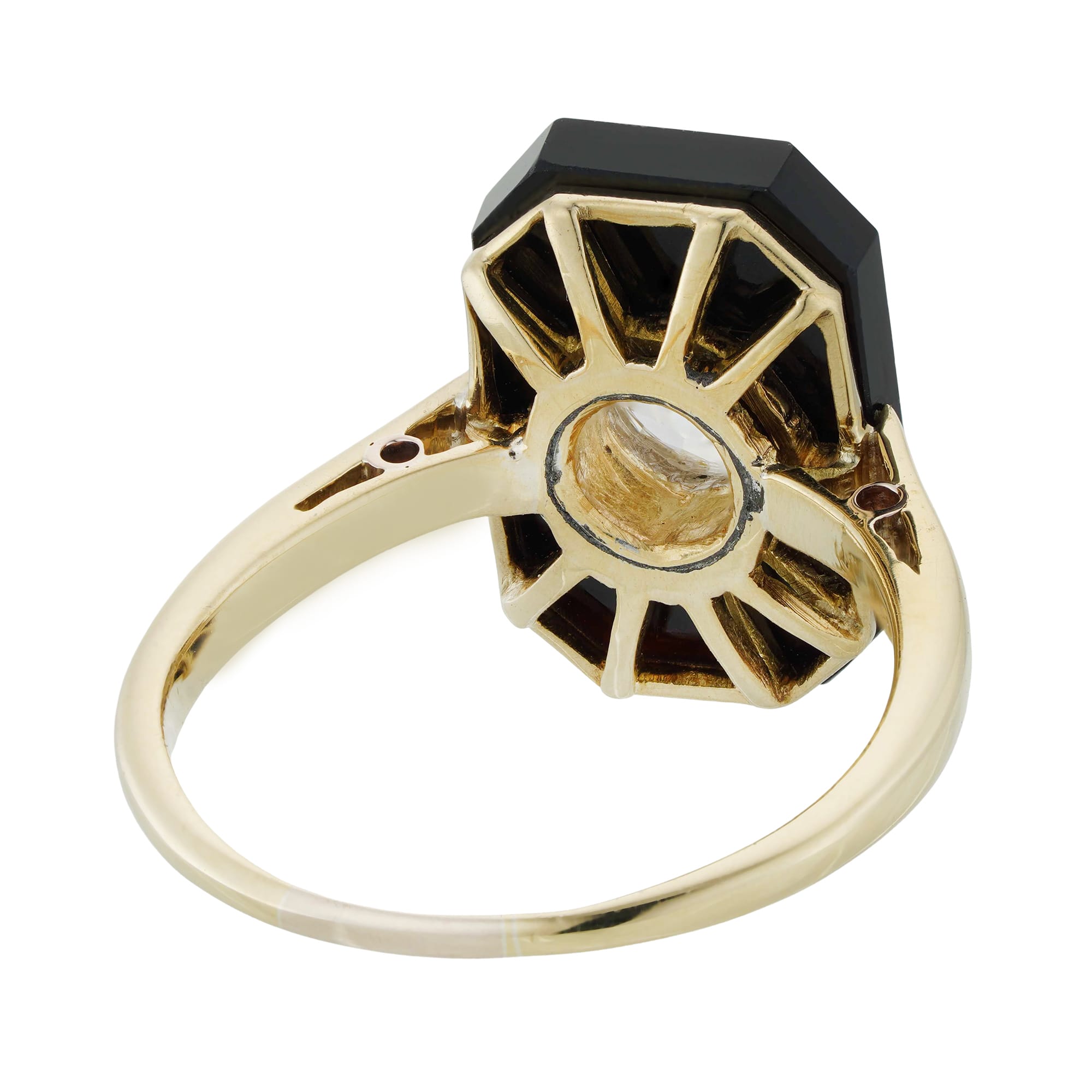 A stylish diamond and onyx ring from the 1920s features at its heart a dazzling old European-cut diamond which lies in the middle of an attractive octagonal-cut onyx, all set on warm yellow gold. This ring’s powerful contrast of colours and tonalities gives it an extremely stylish finish, typical of the 1920s.