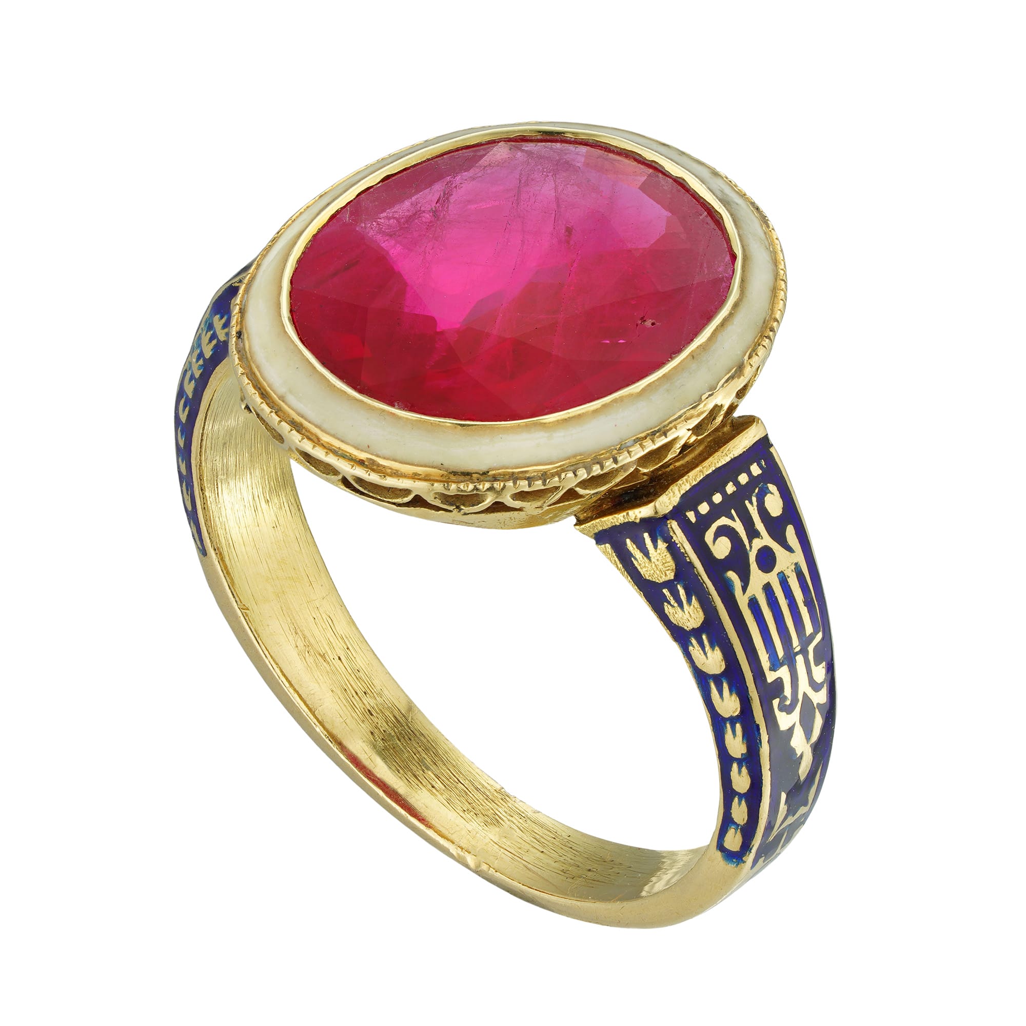 This beautiful Victorian ruby and enamel ring. At the heart of the piece lies an exquisite Burmese ruby, meticulously set within a skilfully crafted border of white enamel, accentuated by elegantly adorned blue enamel shoulders. The combination of the rare ruby and the beautiful enamel makes this ring a stylish and elegant ring that could be elegantly worn by both men and women.