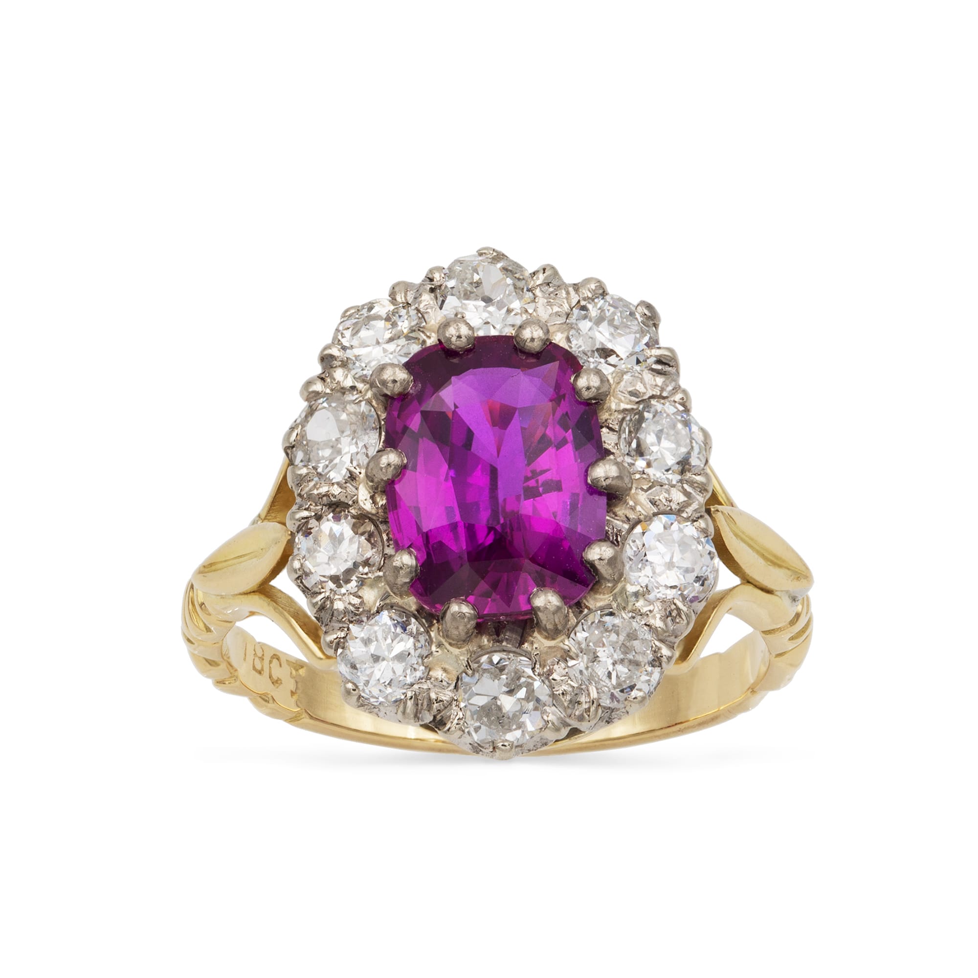 A ruby and diamond cluster ring, the cushion-cut ruby weighing 2.74 carats accompanied by the Gem & Pearl Laboratory report stating to of East African origin with no indications of heating, surrounded by ten old-cut diamonds estimated to weigh 1.5 carats in total, all claw-set in silver and gold mount, with gold triple-split shoulders and engraved decorations, circa 1950, measuring 2 x 1.7cm, finger size N ½ , gross weight 5.8 grams.