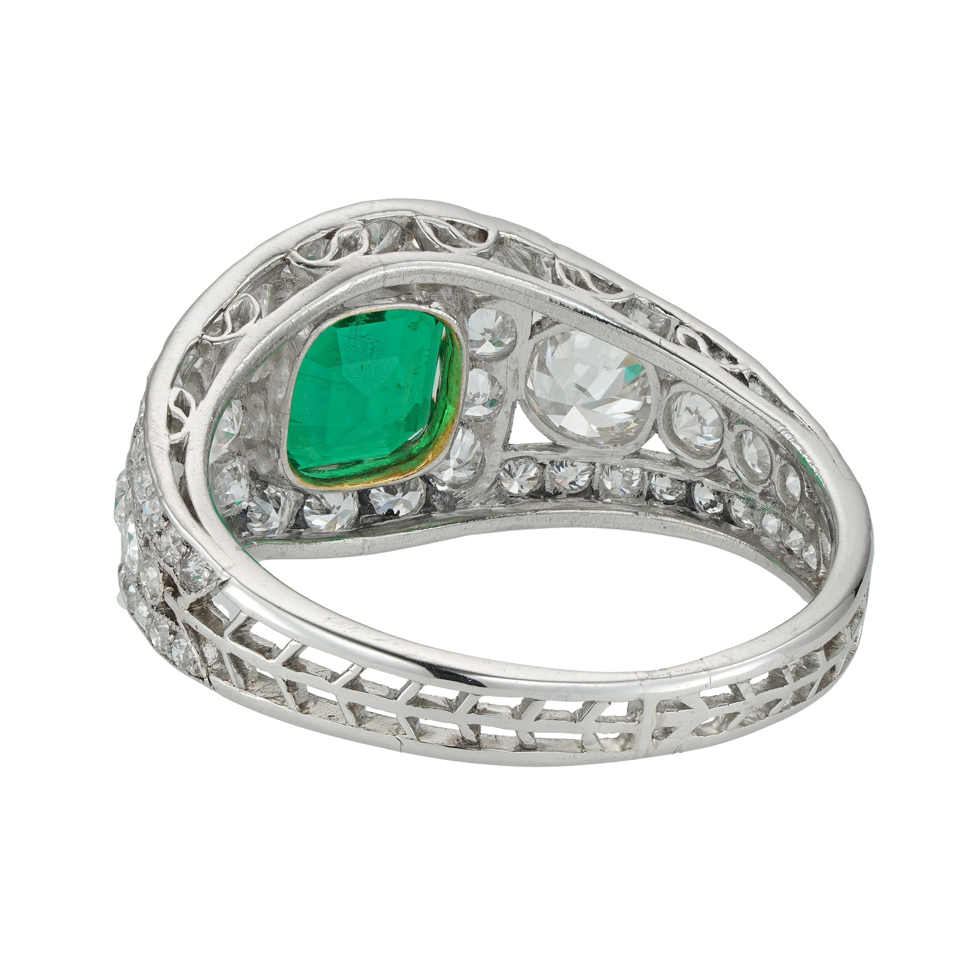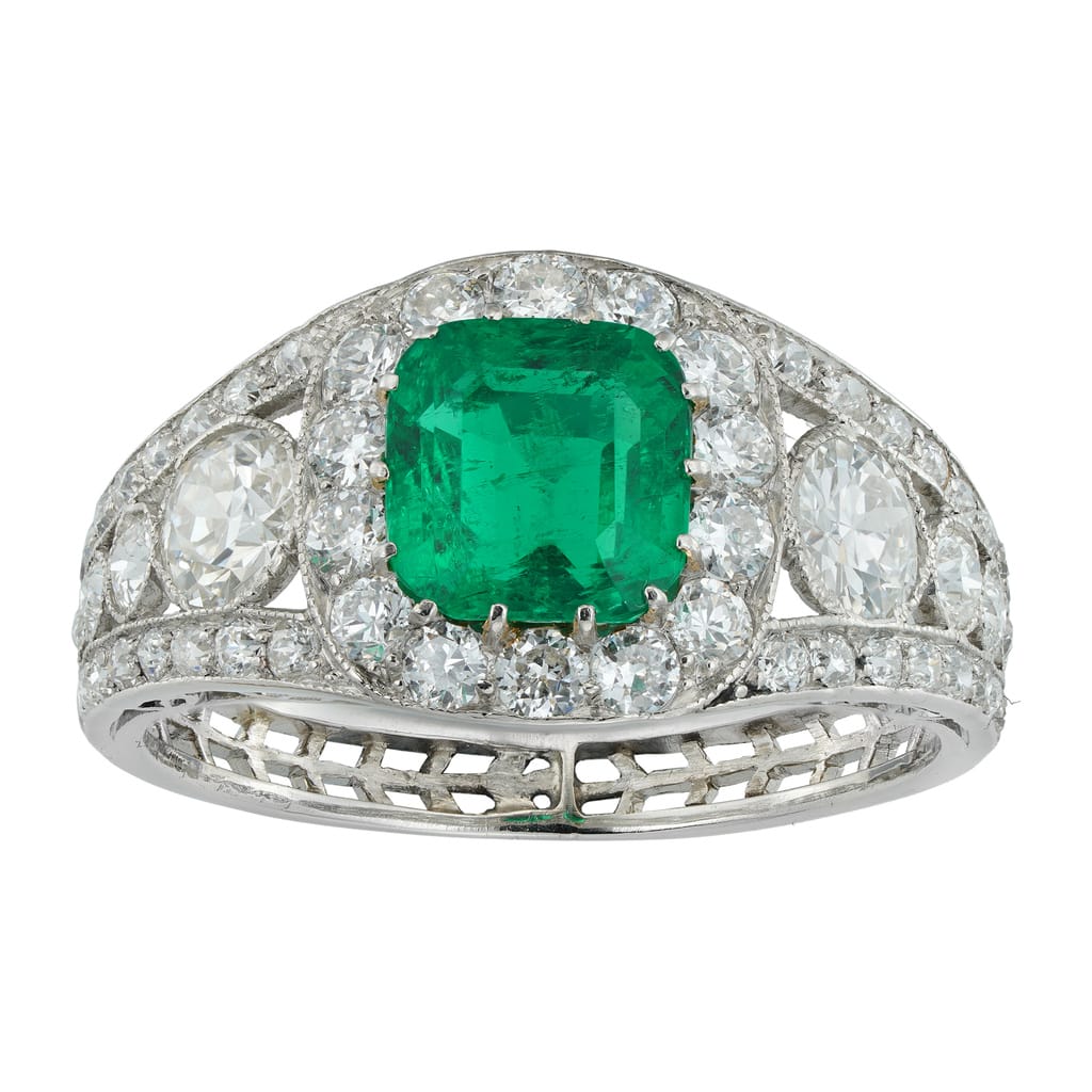 An Art-Deco emerald and diamond ring, the octagonal-cut emerald weighing 1.50 carats, accompanied by GCS report stating to be of Colombian origin, surrounded by fourteen old brilliant-cut diamonds, the openwork-design shoulders, each set with four graduating from the top old ...