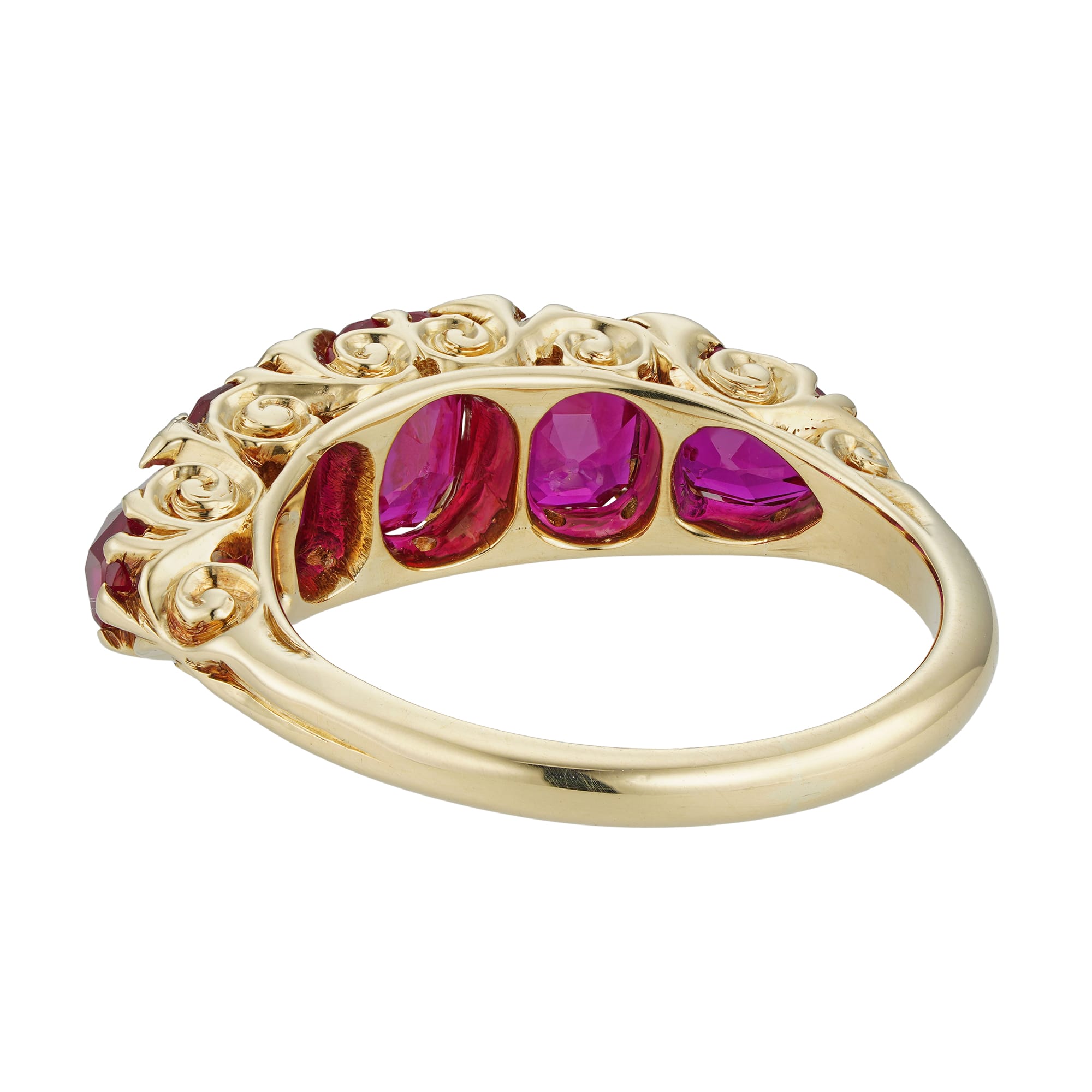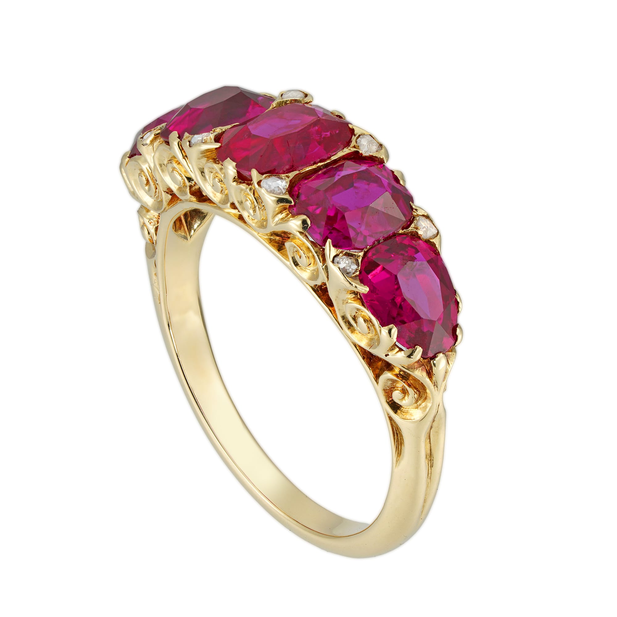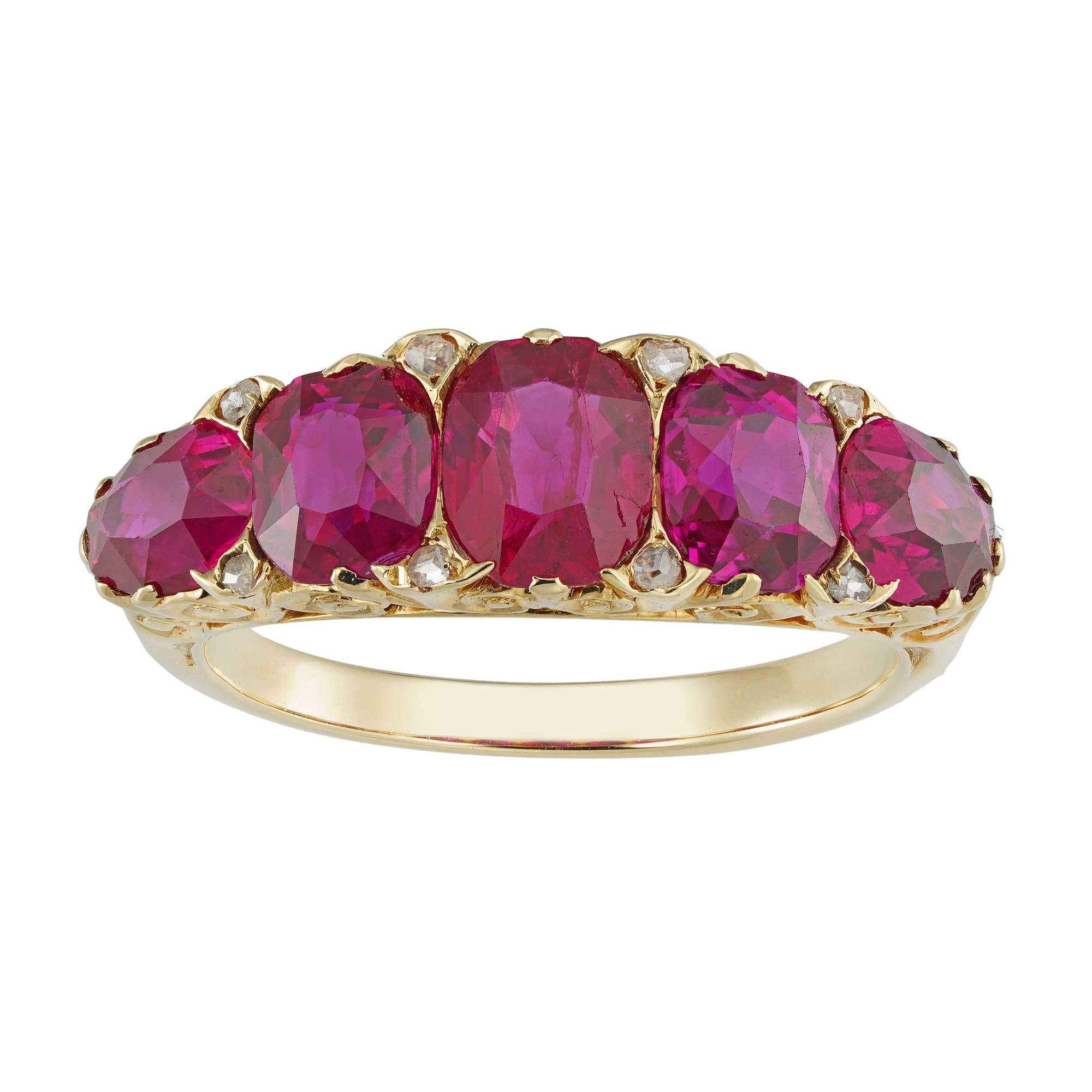 A incredible Victorian five stone Burmese ruby ring. The ring features five mesmerizing unheated Burmese rubies of deep purplish red hue gracefully graduate from the centre, complemented by two pear-shaped rubies at each end. Their vibrant hue is accentuated by delicate rose-cut diamonds interspersed between them. The intricate gold mount, adorned with scroll engravings, adds to the romantic allure of this piece. A testament to the exceptional quality of Victorian jewellery.