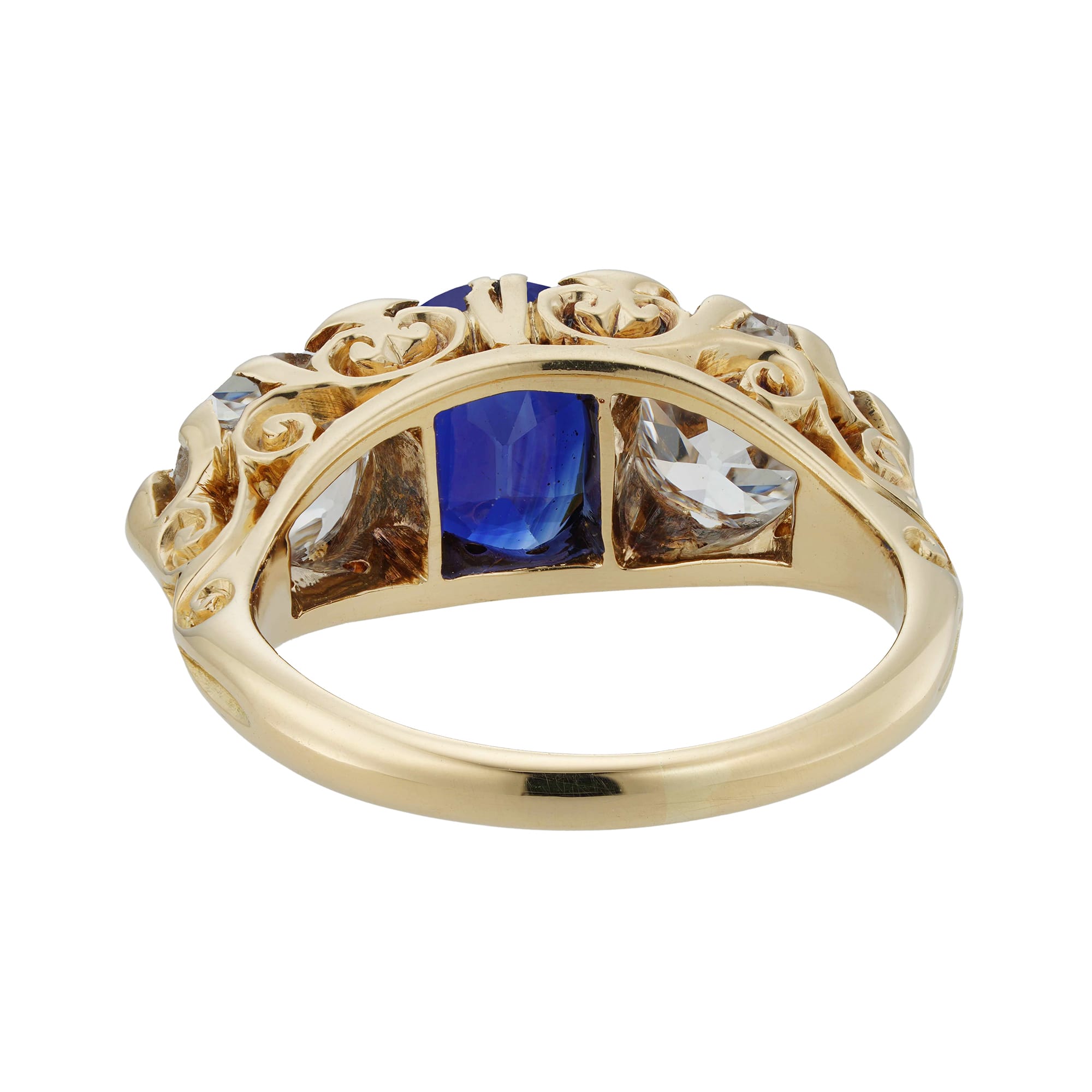 A charming and romantic late Victorian sapphire and diamond ring. At its heart is an unheated deep blue sapphire set with two dazzling old-cut diamonds at its side and four smaller ones in between. The gold mount is finely crafted with carved scroll decorations that accompany the deep hues of blue with the sparkle of the diamonds and merges them into an intricate and refined symphony of romance and elegance.