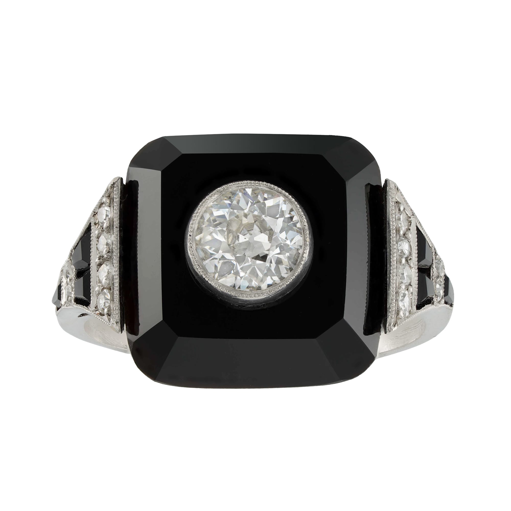 A glamourous Art Deco diamond, onyx and platinum ring. This mesmerizing ring features a brilliant round old-cut diamond as its centrepiece, delicately set within a platinum millegrain setting on an onyx plaque. The shoulders are intricately adorned with petite diamonds and inlaid onyx, all meticulously crafted in platinum. This design not only enhances the sparkle of the diamonds but also creates a striking contrast with the rich black onyx, evoking the glamorous style of the 1920s.