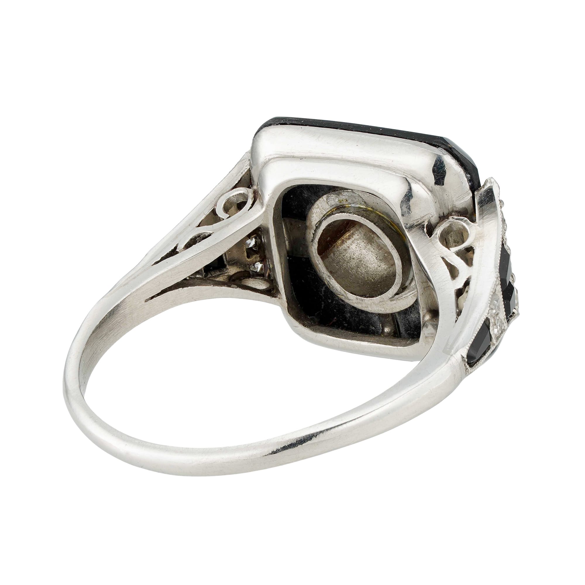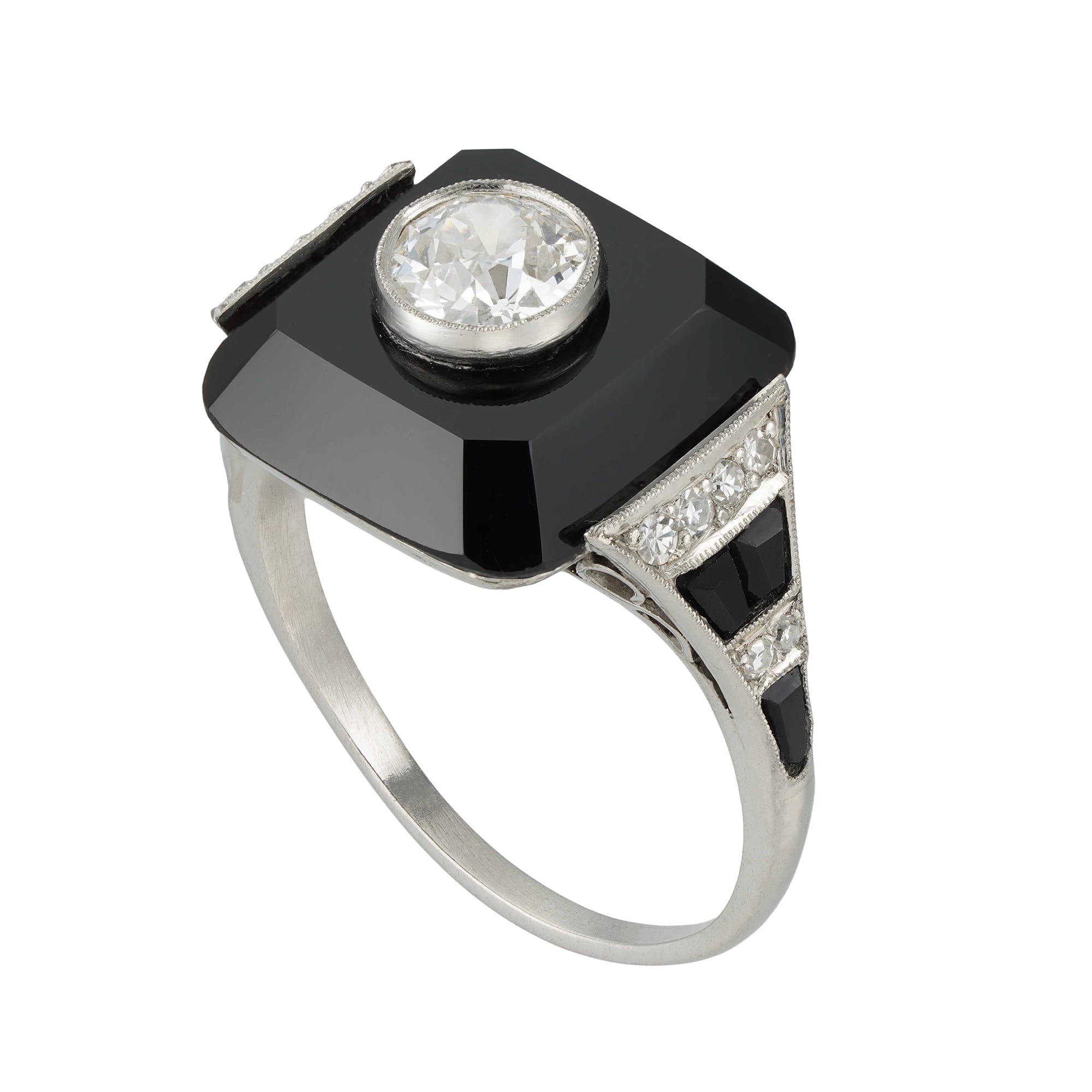 An Art Deco diamond, onyx and platinum ring, to the centre an old-cut diamond estimated to weigh 0.65 carats, assessed to be of H-I colour and VS2-SI1 clarity, millegrain set to a platinum collet on a cushion shaped onyx plaque ...