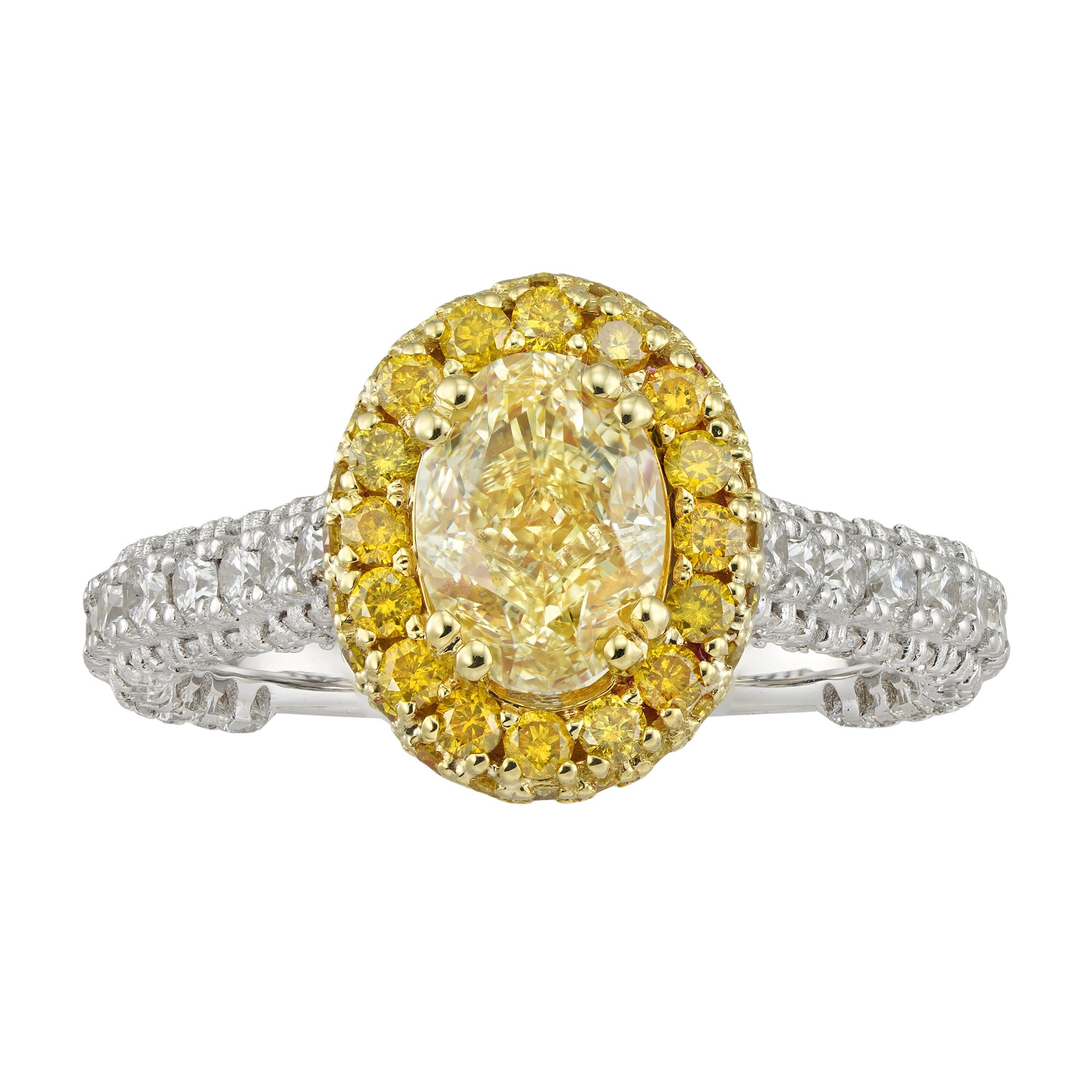 A fancy yellow colour diamond ring, the oval brilliant-cut diamond weighing 1.26 carats and accompanied by GIA report stating to be of Fancy Yellow colour and VVS2 clarity four-double claw-set to a yellow gold frame with set with fifty-six yellow colour small brilliant-cut diamonds estimated to weigh ¾ carat, to white gold shoudlers and D-section shank embellished with ninety-eight small round brilliant colourless diamonds estimated to weigh a further total of 1.9 carats, later hallmarked 18ct gold, London, bearing the Bentley & Skinner sponsormark, finger size M, measuring 2.2×1.2cm, gross weight 5.1 grams.
