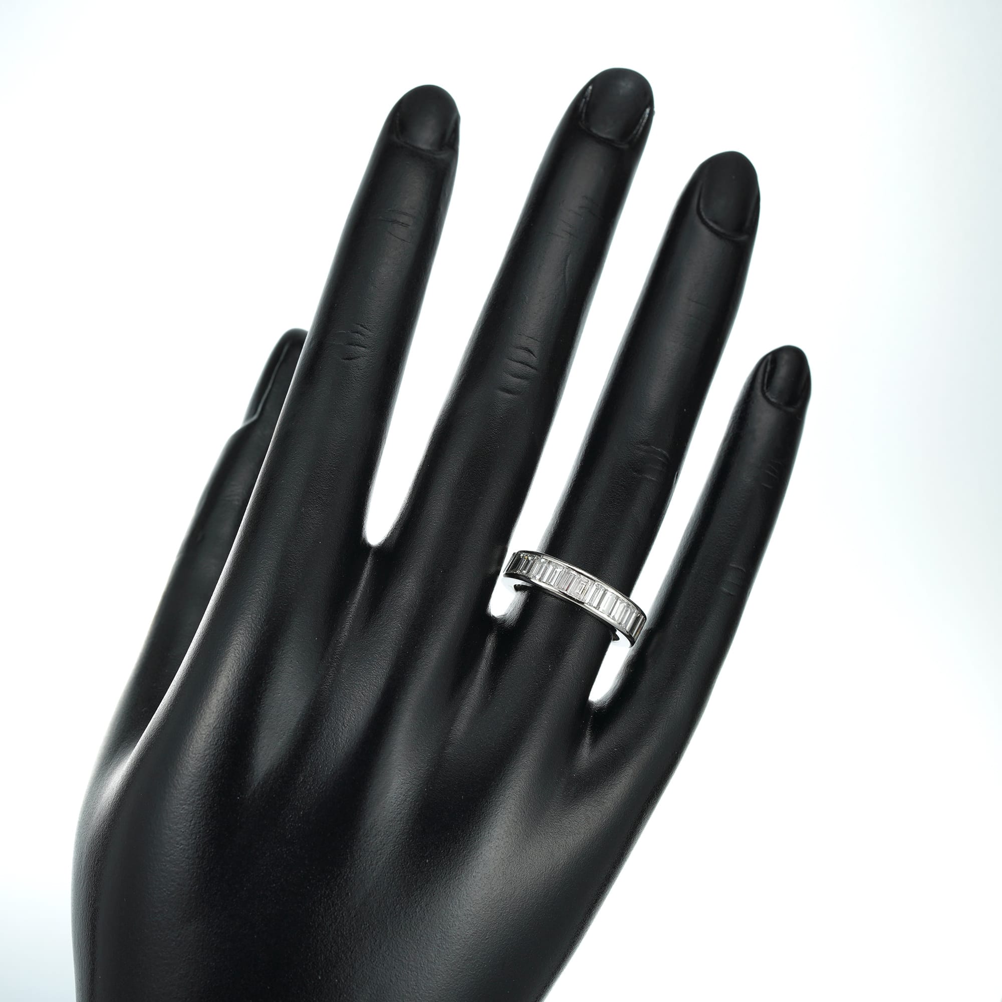 A pretty and sparkling full eternity ring. This ring features emerald cut diamonds channel set to platinum for a chic and sophisticated look. This ring would make a bold wedding band or a perfect and glittering addition to an everyday ring stack.