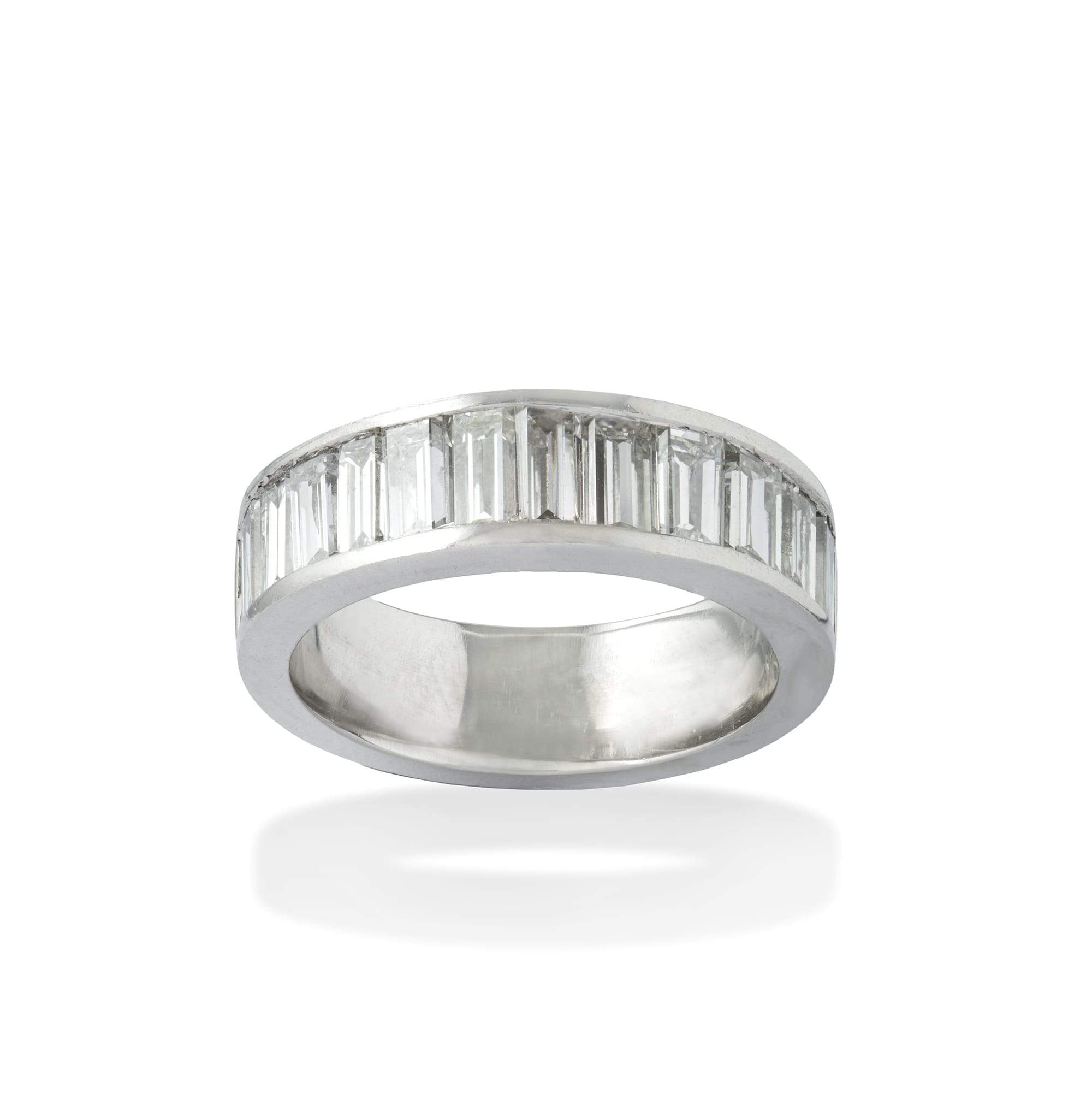 A diamond half eternity ring, set with eleven baguette-cut diamonds in a channel setting estimated total diamond weight 2.65 carats, all in platinum, bearing the Bentley and Skinner sponsor mark, hallmarked platinum 950, London 2017, measuring approximately 0.6 cm wide, finger size N, gross weight 11.9 grams.