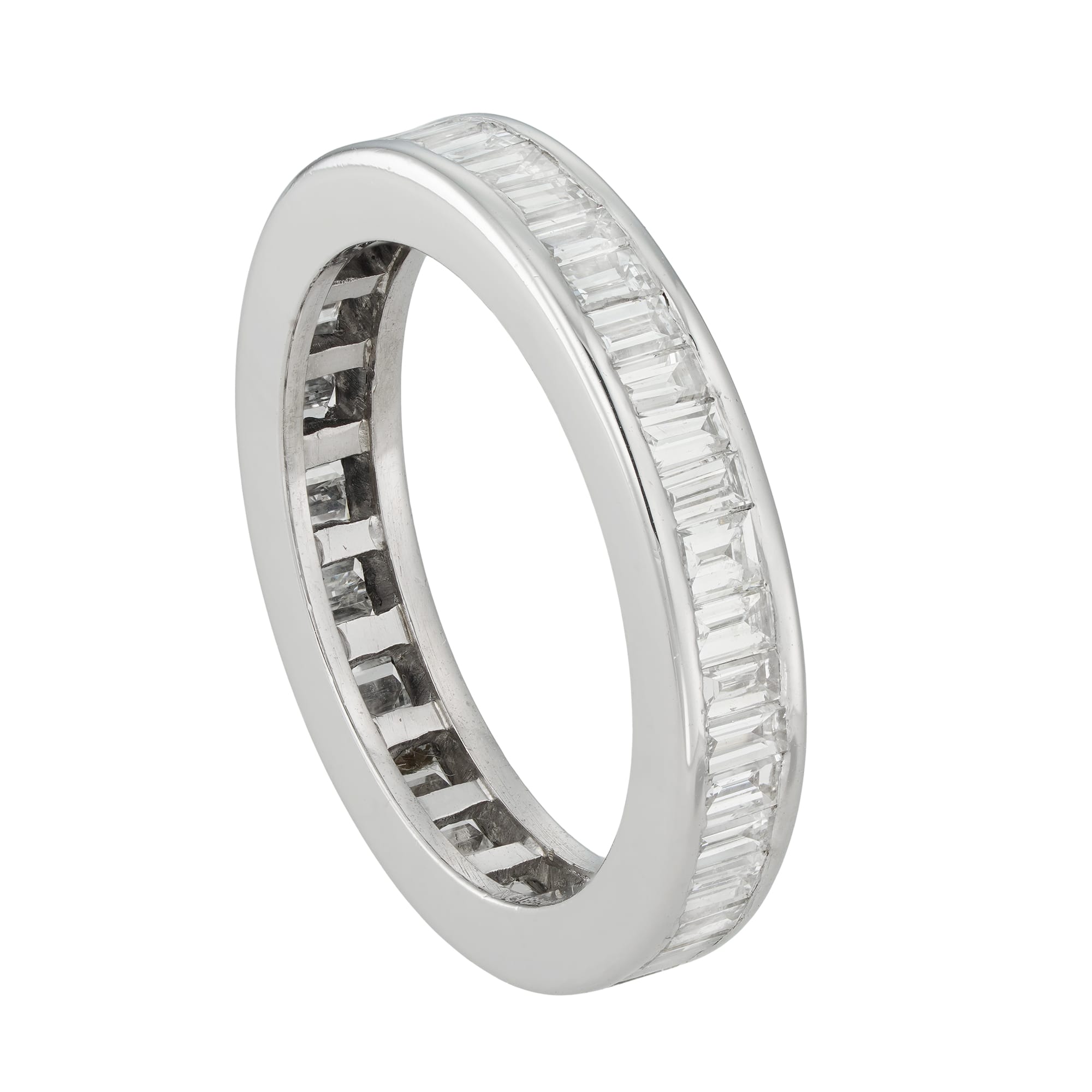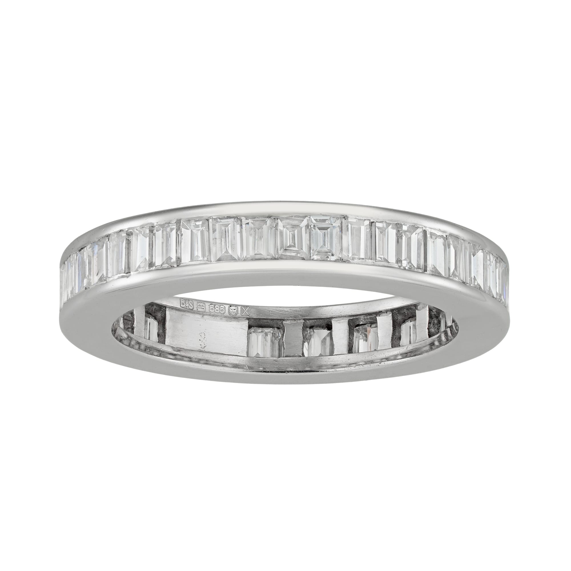 A diamond full eternity ring, the forty-two baguette-cut diamonds estimated to weigh 2.1 carats in total, all channel-set in white gold mount, later hallmarked 14ct gold, London, 2022, bearing the Bentley & Skinner sponsor mark, measuring 2 x 0.35cm, finger size J ½ , gross weight 4 grams.