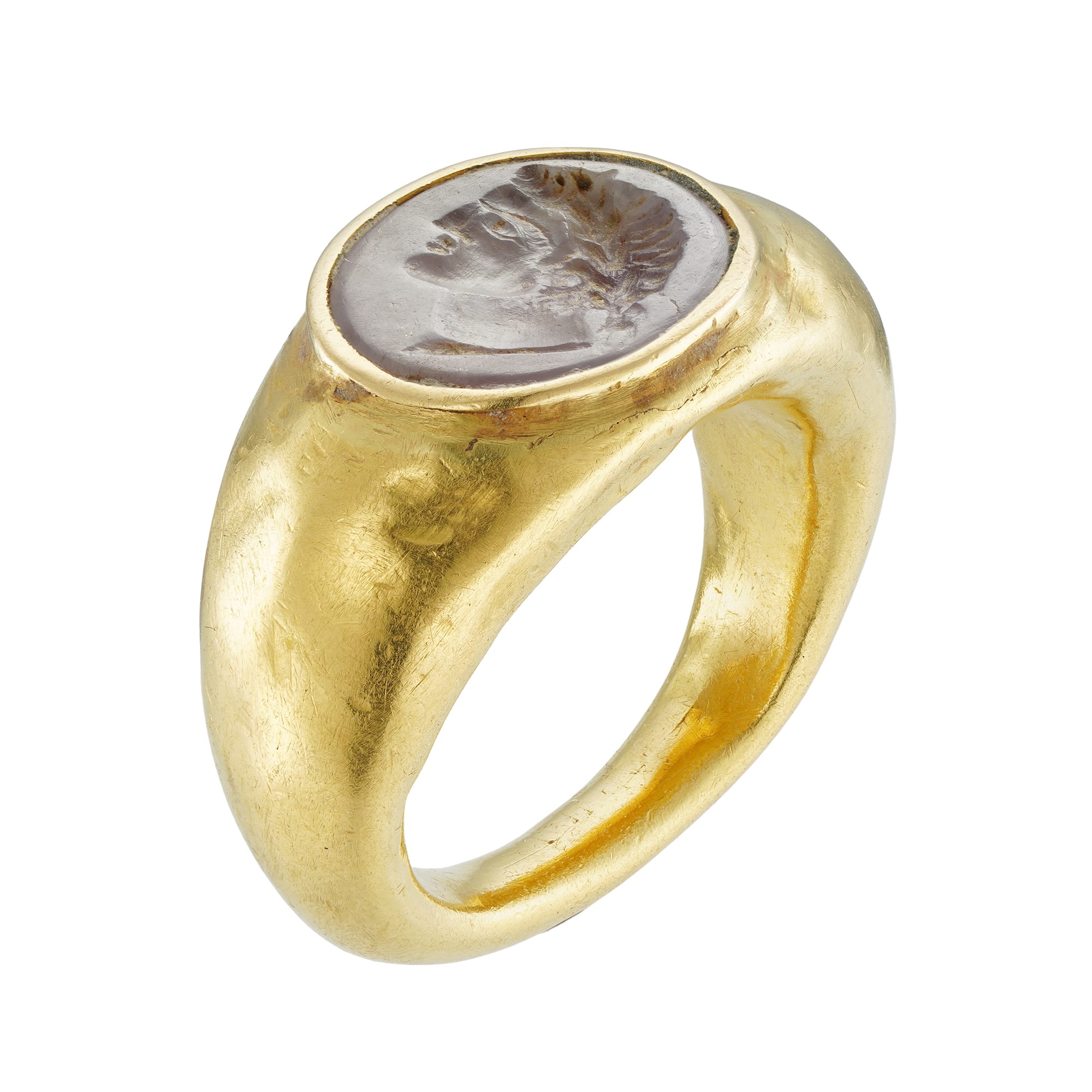 More informationA Roman intaglio gold hardstone ring, the oval shaped rose-quartz measuring 1.4 x 1.1cm, deep engraved with the profile of an Emperor wearing a laurel wreath, possibly Nero, Roman-set in landscape position to a hollow yellow gold mount with closed back, and tapering shoulders and shank, circa 1st century AD, measuring approximately 2.7 x 1.4cm, finger size L-N (the ring is not round), gross weight 10 grams.