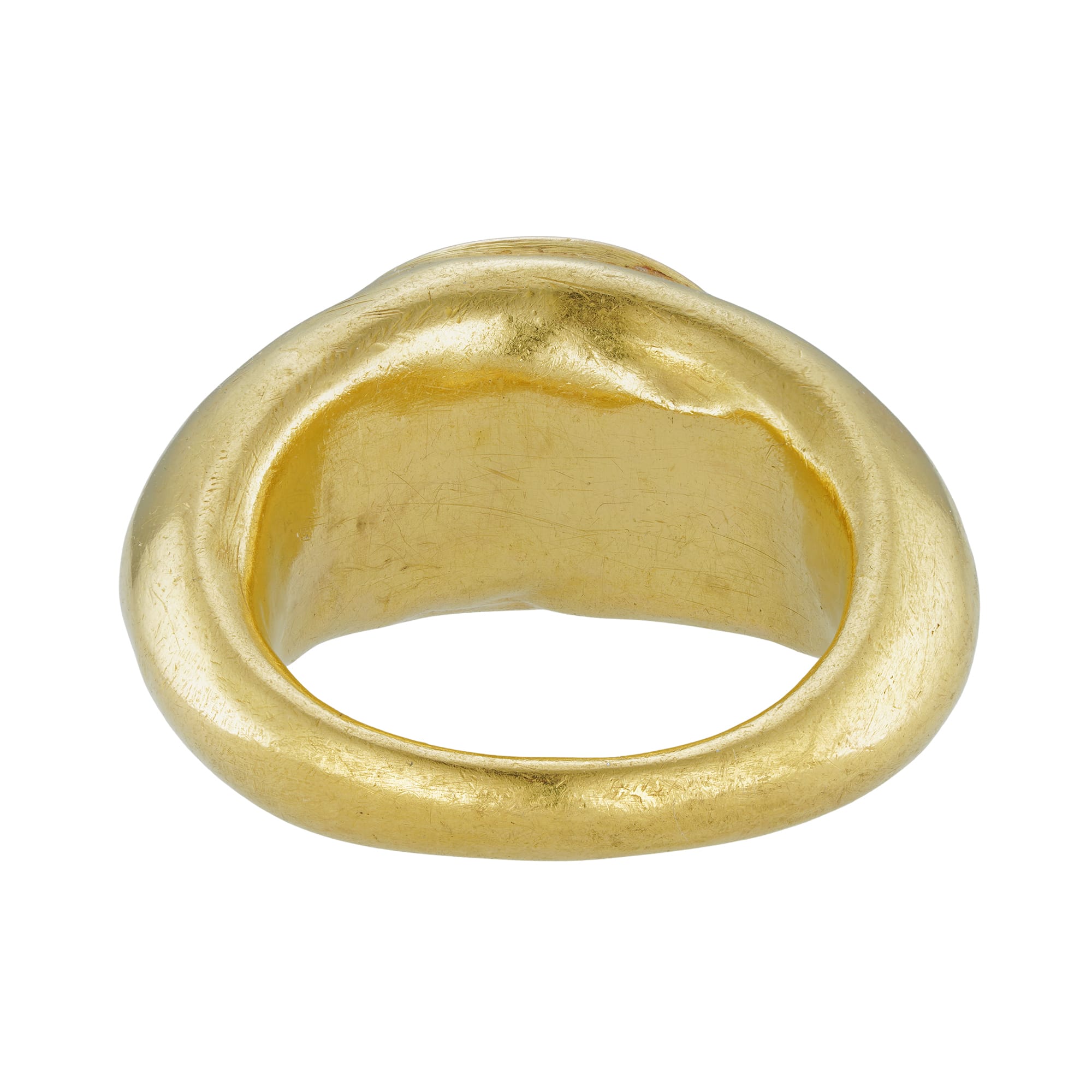 A remarkable Roman intaglio ring. Sculptural and lustrous, this ring is rendered in hypnotic yellow gold while the stunning intaglio depicting a Roman emperor is engraved in rose quartz. Intaglio, a technique where the design is carved into a gemstone and leaves a hollow impression surrounded by an untouched background, dates back to antiquity. Traditionally worn by men, these rings used to symbolise power, social status or, as this stunning example, political inclination. Today this unique ring can still be worn as a fashionable and timeless accessory, and a marvellous nod to ancient culture.