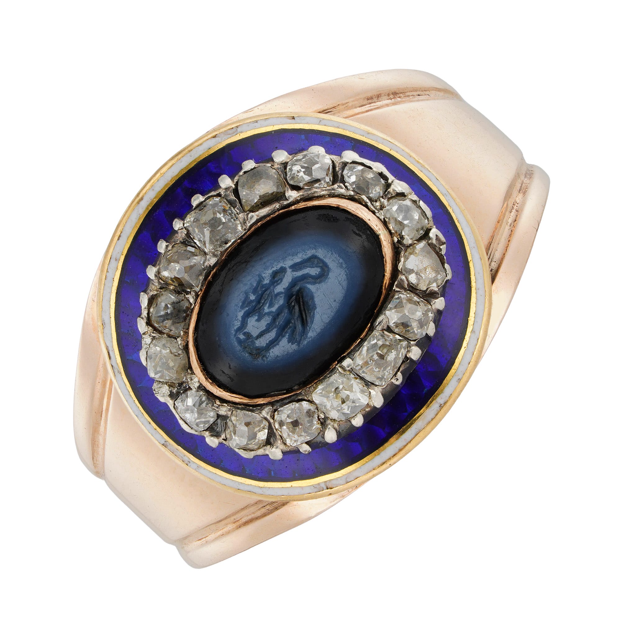 More informationA George III diamond and enamel mourning ring with Roman intaglio, the Roman oval-shaped nicolo intaglio depicting an ibis and a lizard symbolising Thoth, the Egyptian deity responsible for the judgment of the dead and the lizard, Roman symbol of death and re-birth, circa 1st-2nd century AD, surrounded by a frame of fifteen small old-cut diamonds estimated to weigh ¾ carat in total, surrounded by blue guilloche enamel within white enamel border, all mounted in silver and gold to tapering shoulders with ridged shank, c. 1800, measuring 2.1×1.4cm, size O ½ , gross weight 4.7g,