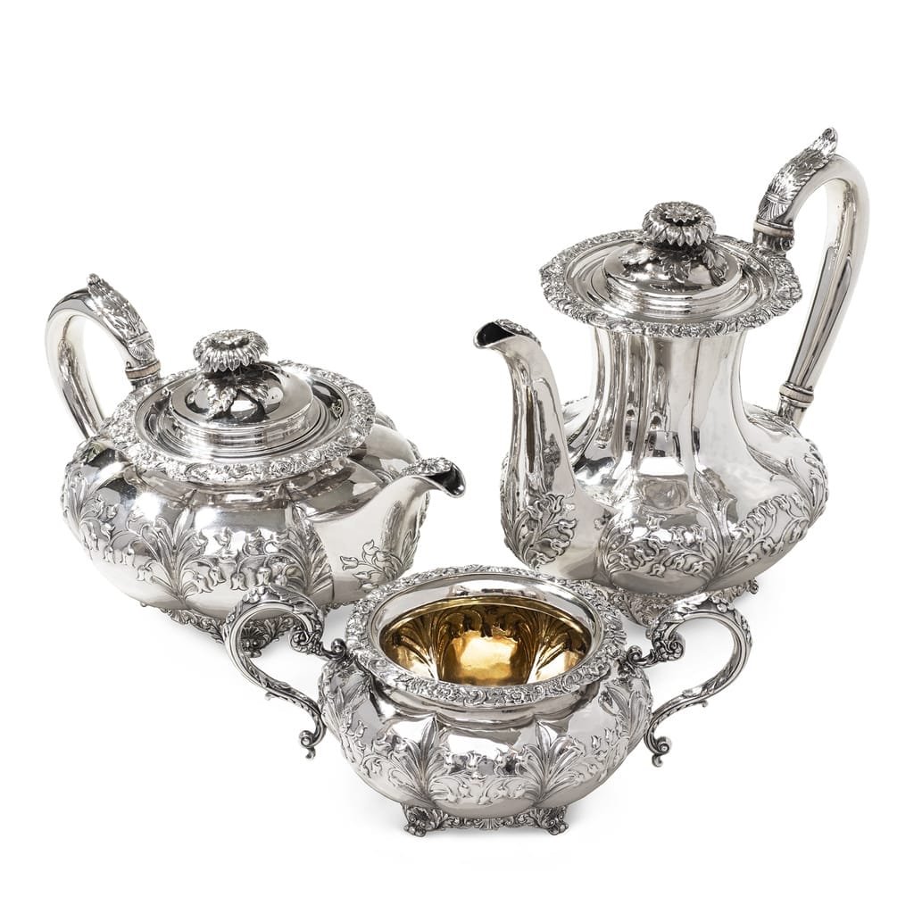 More informationAntique three piece sterling silver tea and coffee set, comprising of a tea and coffee pot, sugar bowl, the bodies are decorated with floral repousse work, on to an applied scroll and shell base,the handles decorated with applied leaf forms, the hinged lids to the tea and coffee pots have floral and leaf finials, teapot and sugar bowl hallmarked London 1829, (George IV), WB sponsor mark, coffee pot hallmarked London 1846, (Victorian), sponsor mark WH, total weight 65 ozs.