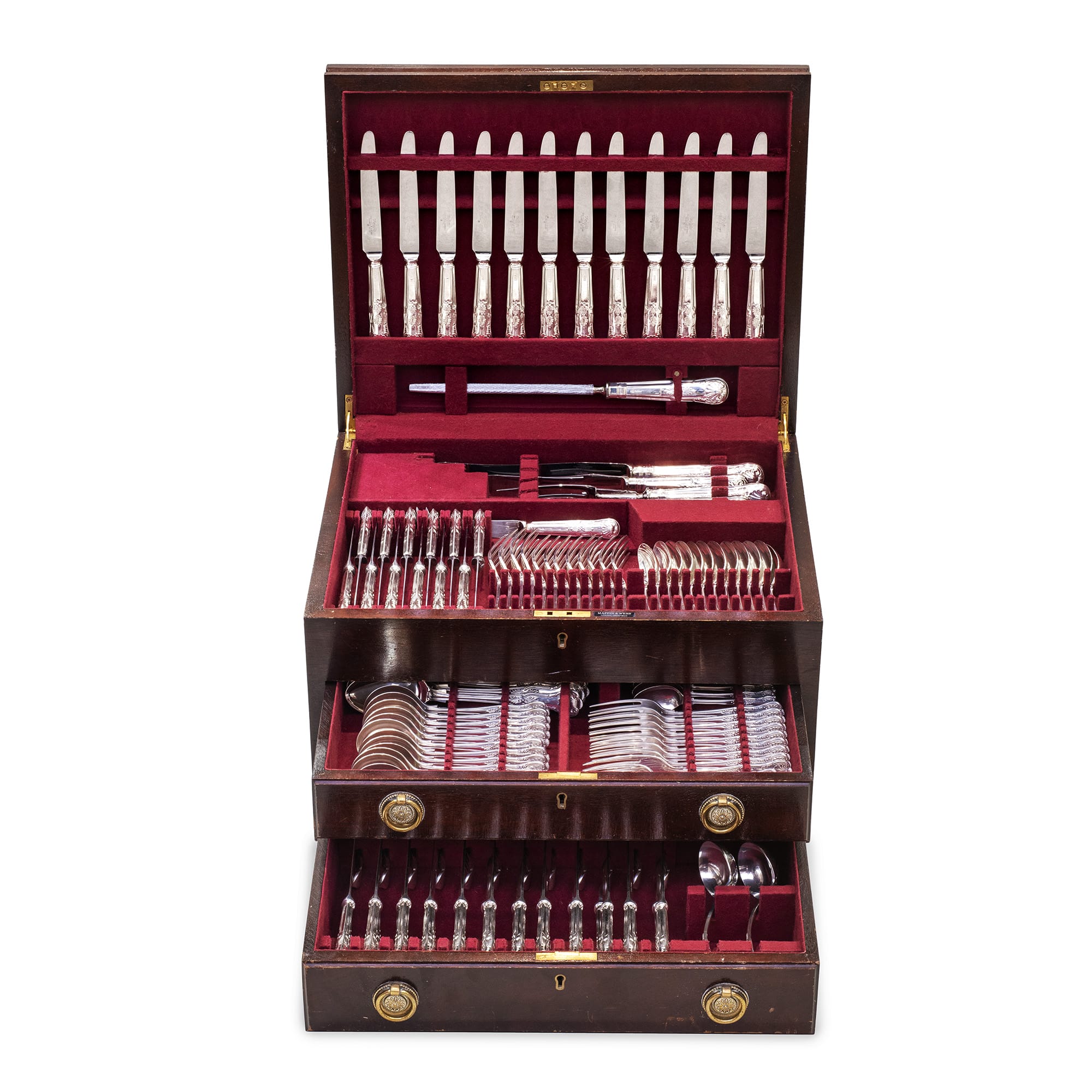 An Elizabeth II canteen of silver King’s Pattern cutlery, consisting: a 12-person 7-piece dinner set, 12 fish sets, 12 coffee spoons, 2 sauce ladles, a pair of fish servers, six table spoons, a carving set, and one cheese knife, all ...