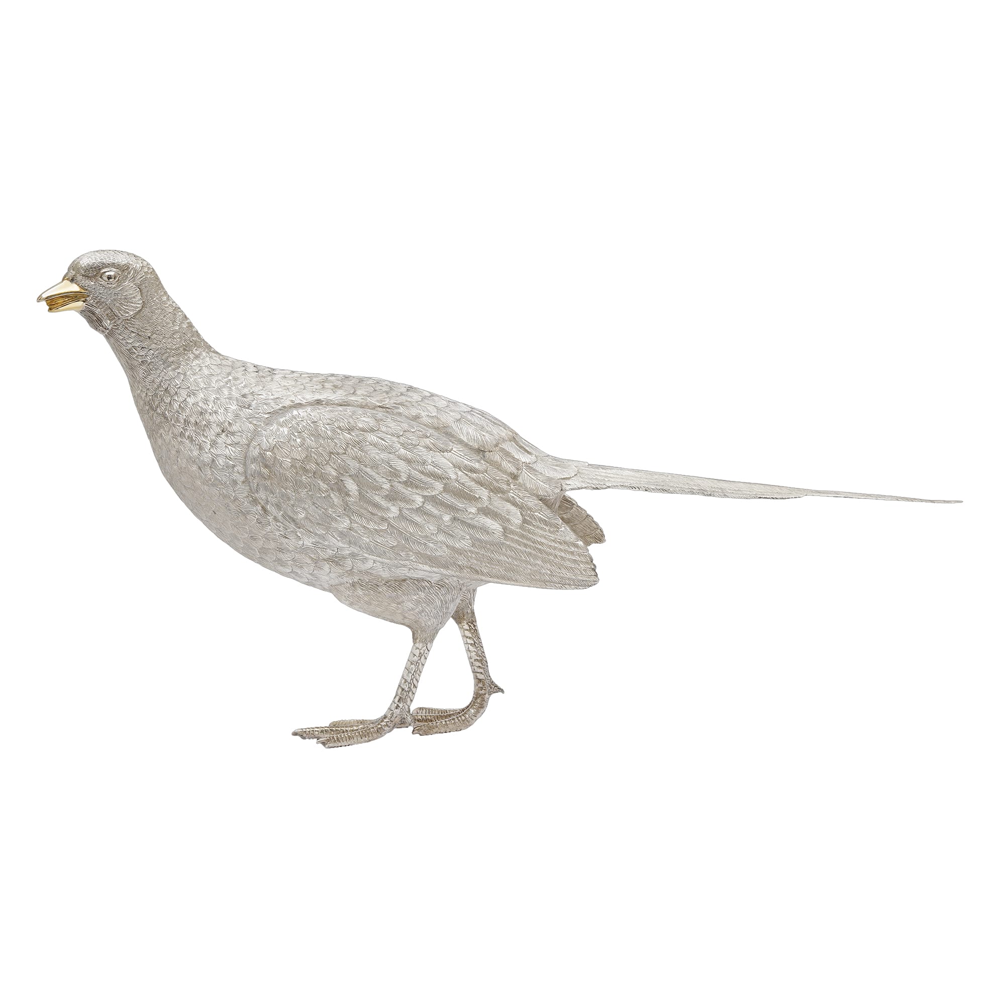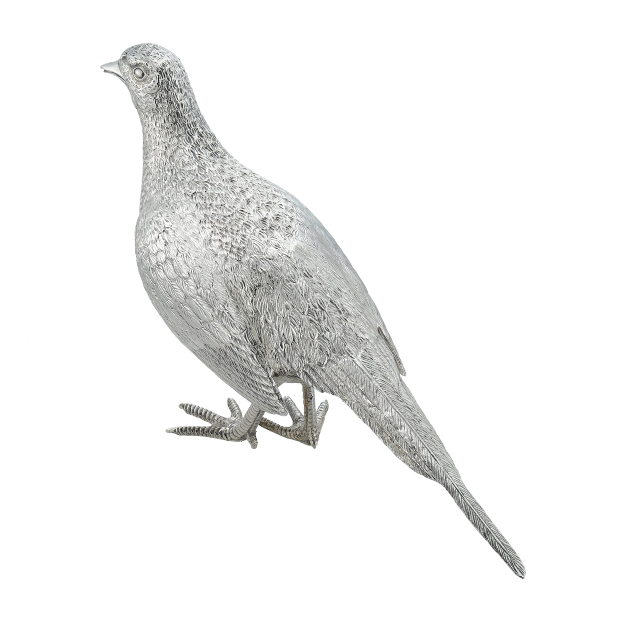 An Elizabeth II Silver Hen Pheasant, the life-sized large pheasant with carved feathers, bearing hallmarks for London, maker’s mark William Comyns. Measuring 47 cm long, gross weight 85 troy ounces.