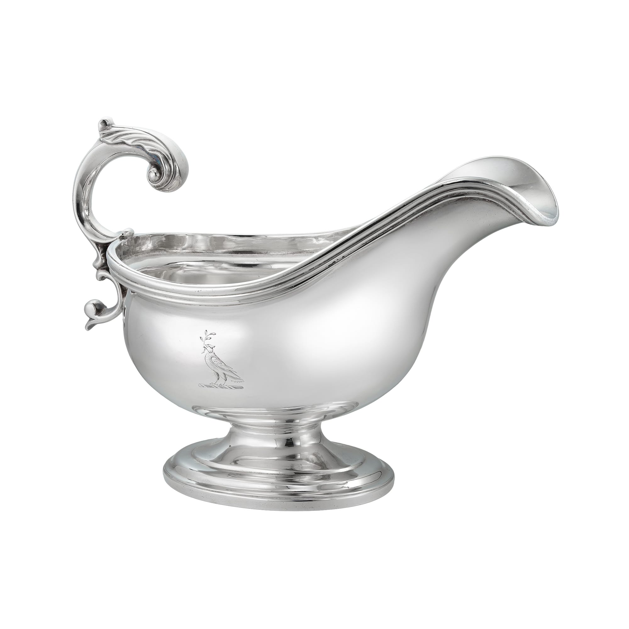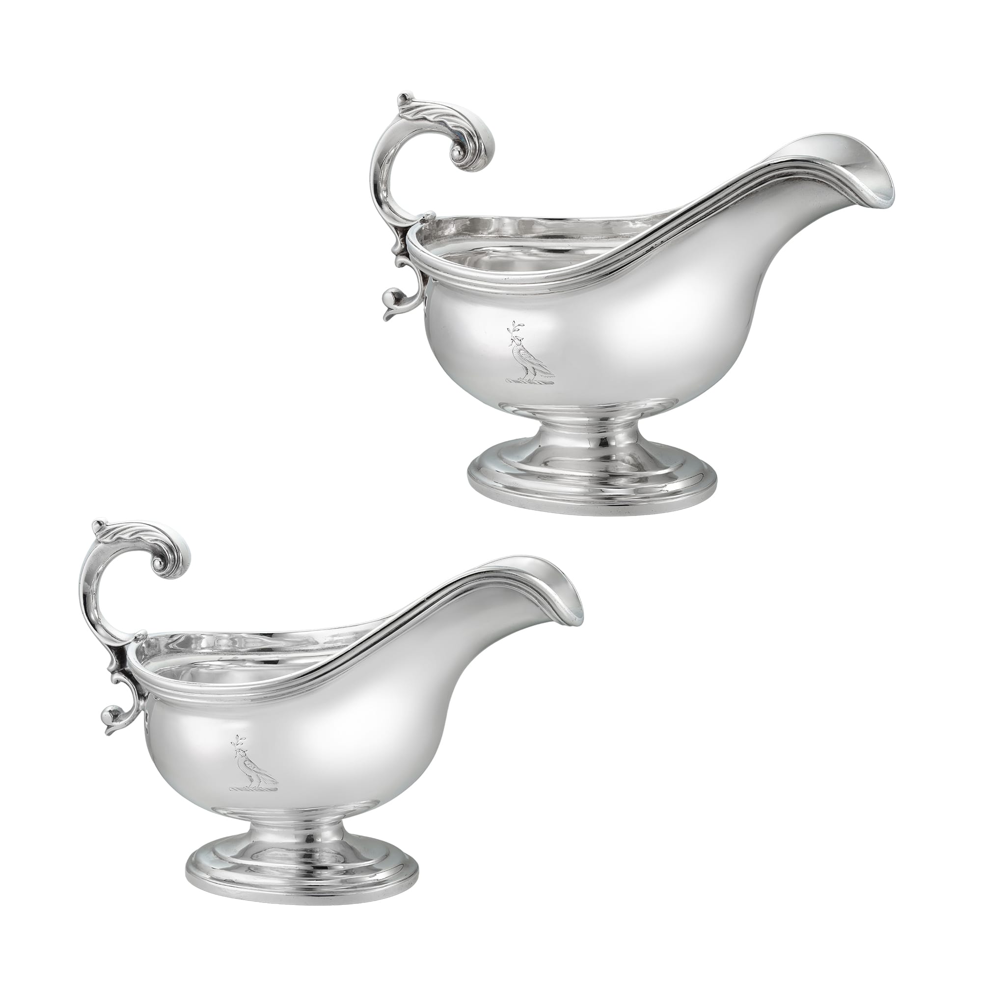 More informationA pair of George IV silver sauceboats by Richard Sibley, with acanthus scroll handle and reeded rim, the side engraved with family crest, all to an oval pedestal foot, hallmarked sterling silver, London 1824, bearing Richard Sibley’s sponsor mark, each measuring approximately 19 x 10.5 x 13 cm, gross weight 33 troy ounces.