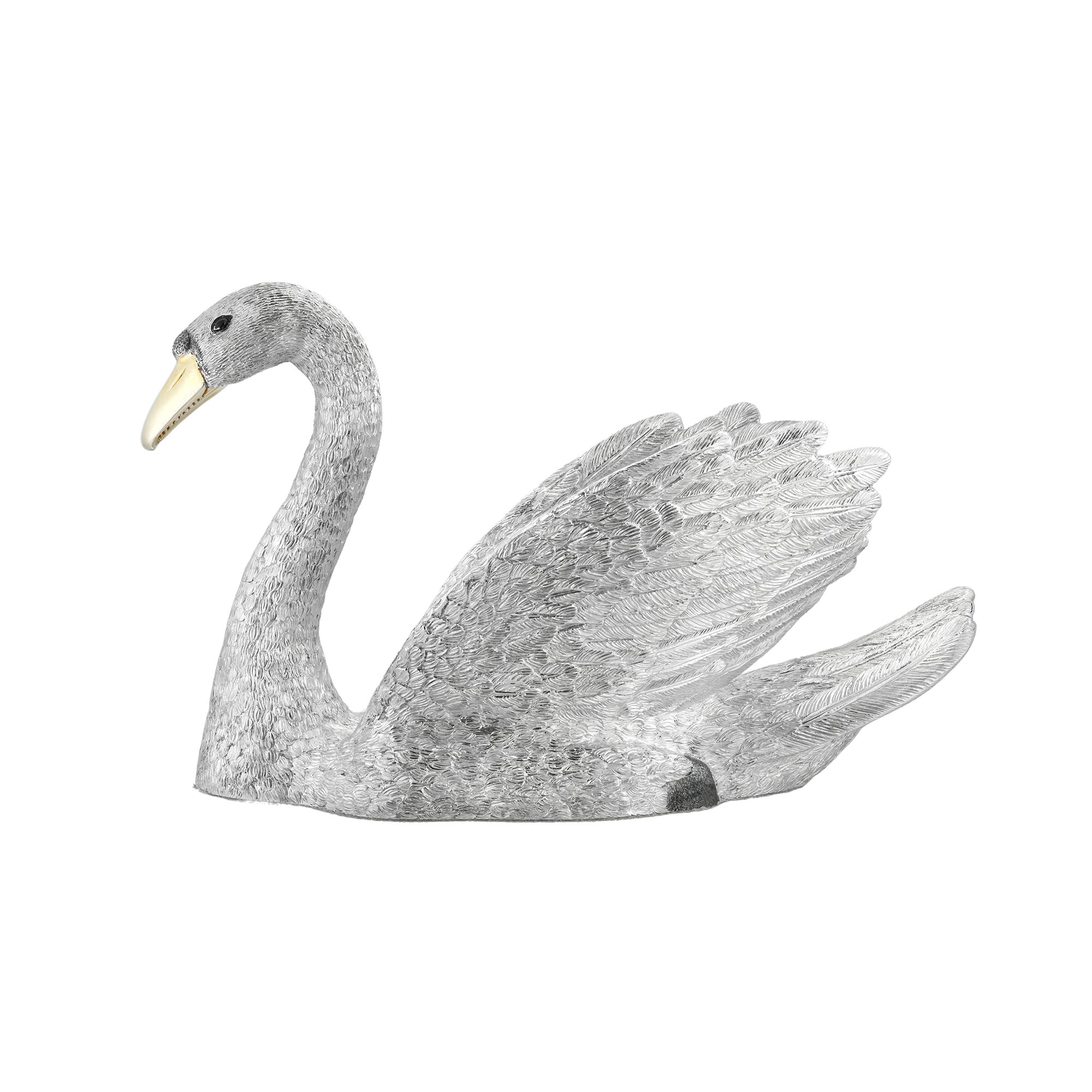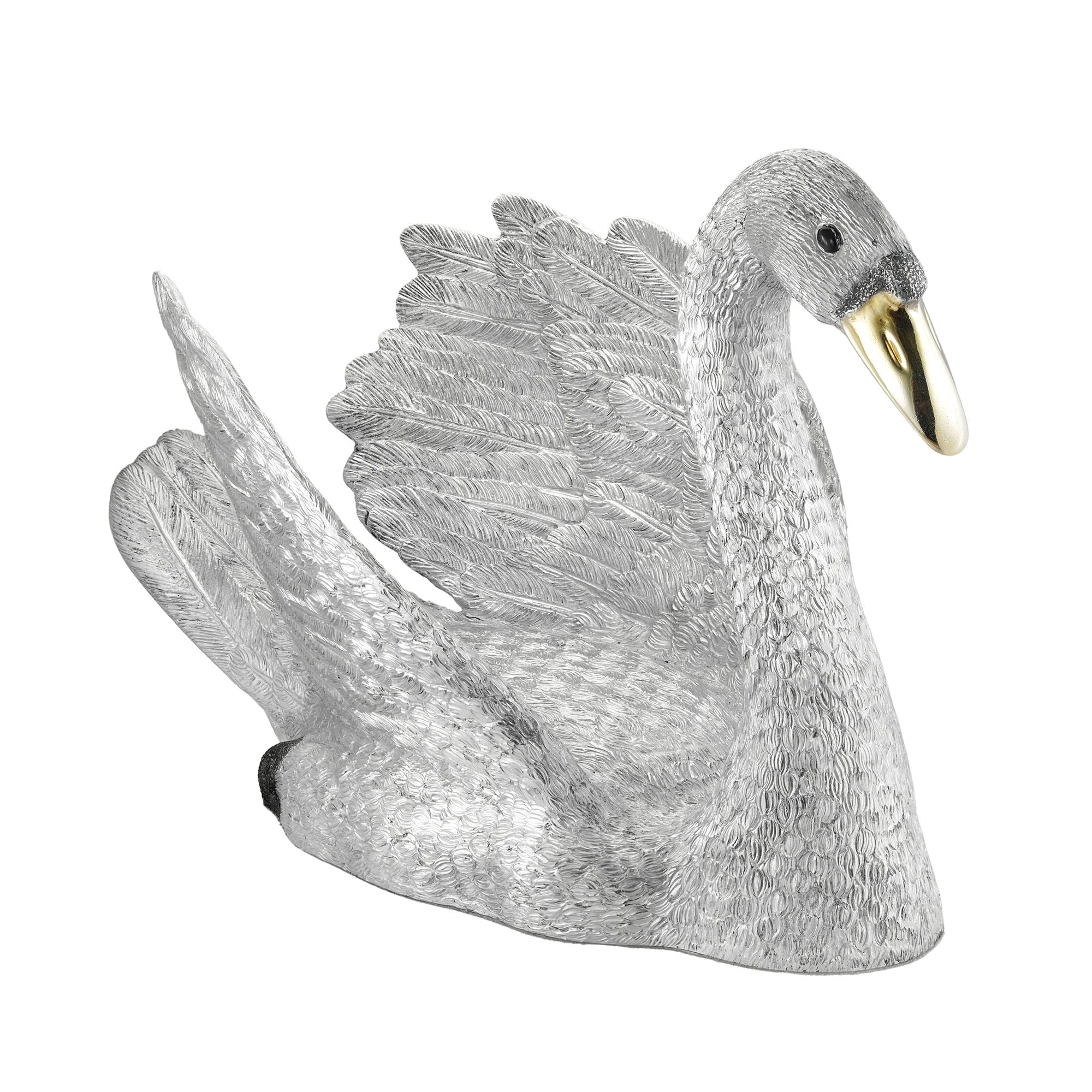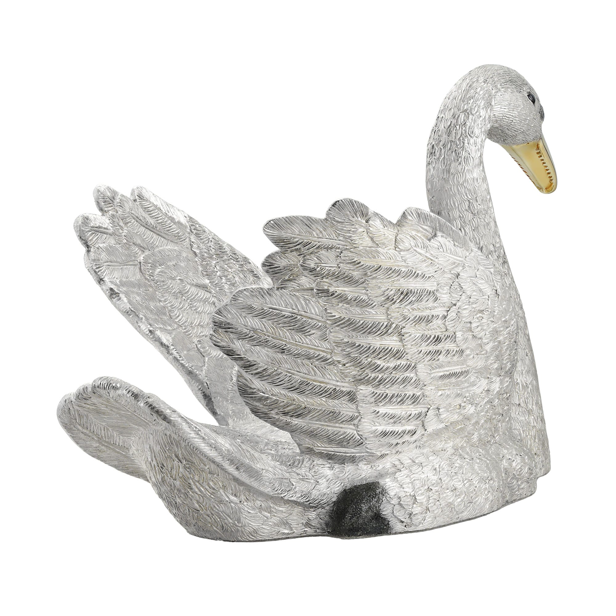 A Charles III silver swan, the male swan with realistic and detailed hand chased feathers, with gilded beak, William Comyns, London, 2023, gross weight 59 troy ounces, measuring approximately 20 x 15 x 11.5 cm.