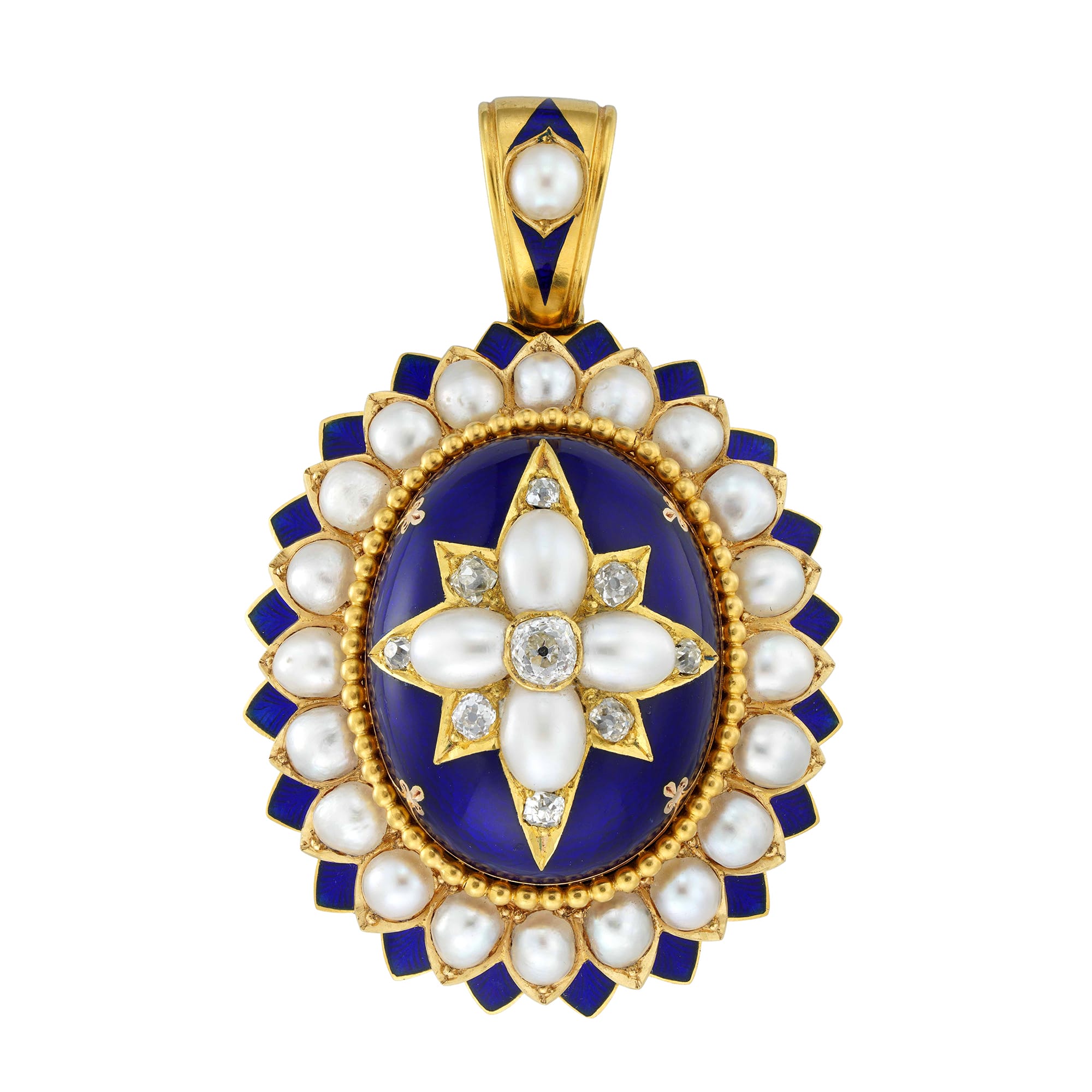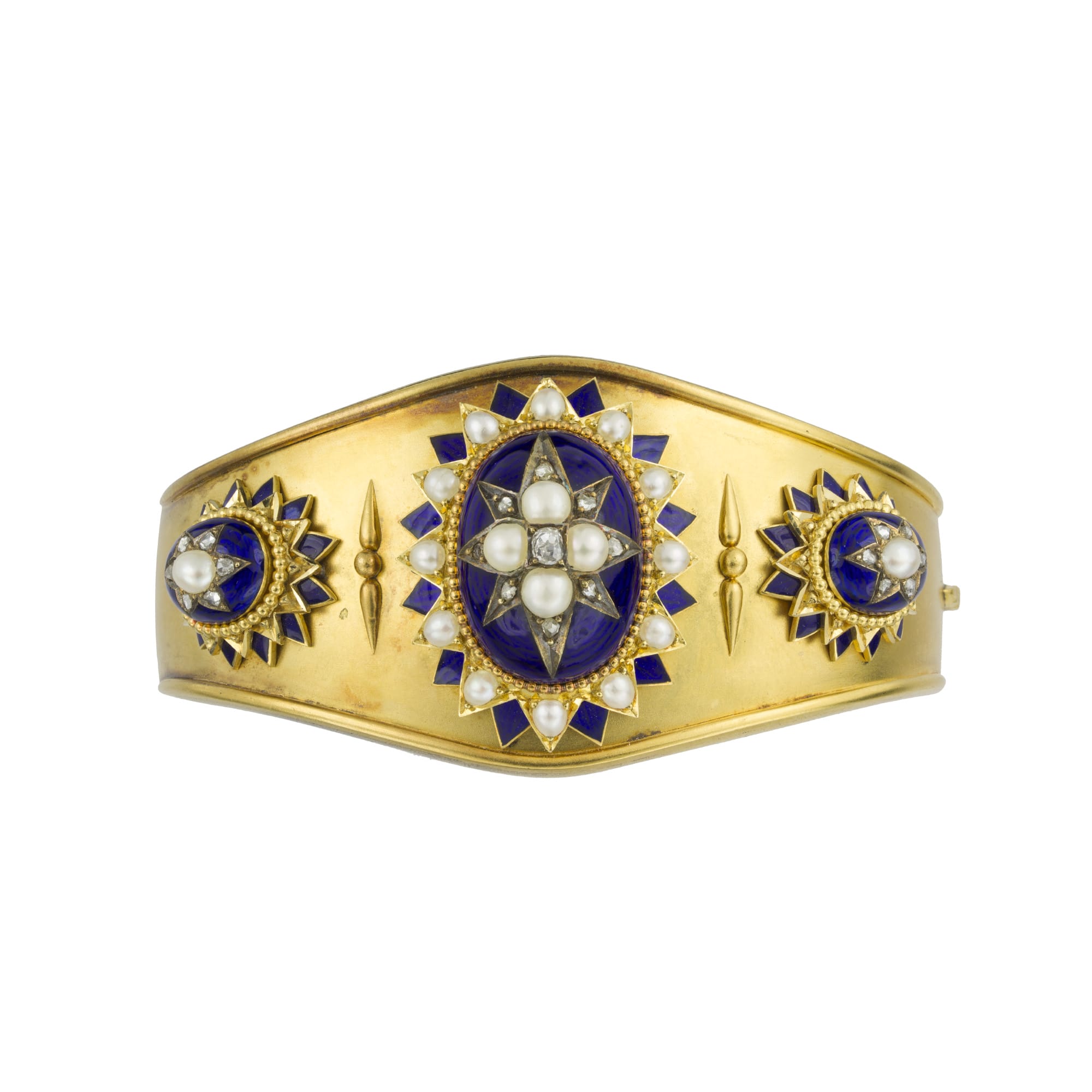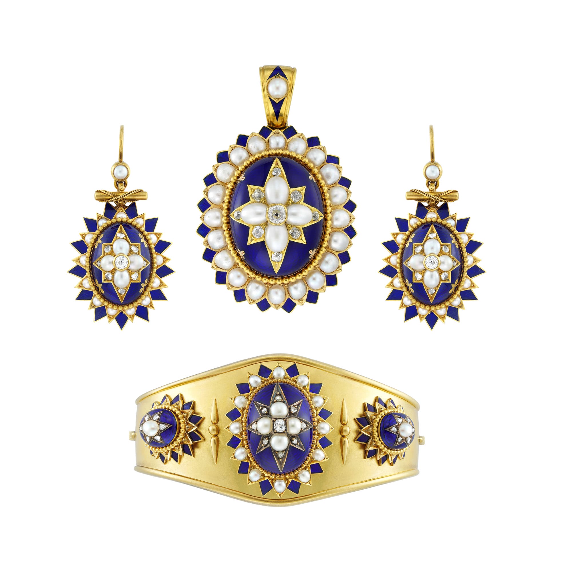 An ornate and detailed Victorian set. This set features a matching necklace, earrings, and bangle bracelet. Each piece features a royal blue enamel oval set with a star of diamonds and pearls. Further pearls and blue enamel form the boarder to the central piece. The diamonds are sparkling, and the pearls are lustrous, both providing a luxurious complement to the yellow gold and blue enamel. This piece exemplifies High Victorian style, and worn together, would look striking and dramatic paired with an evening gown.