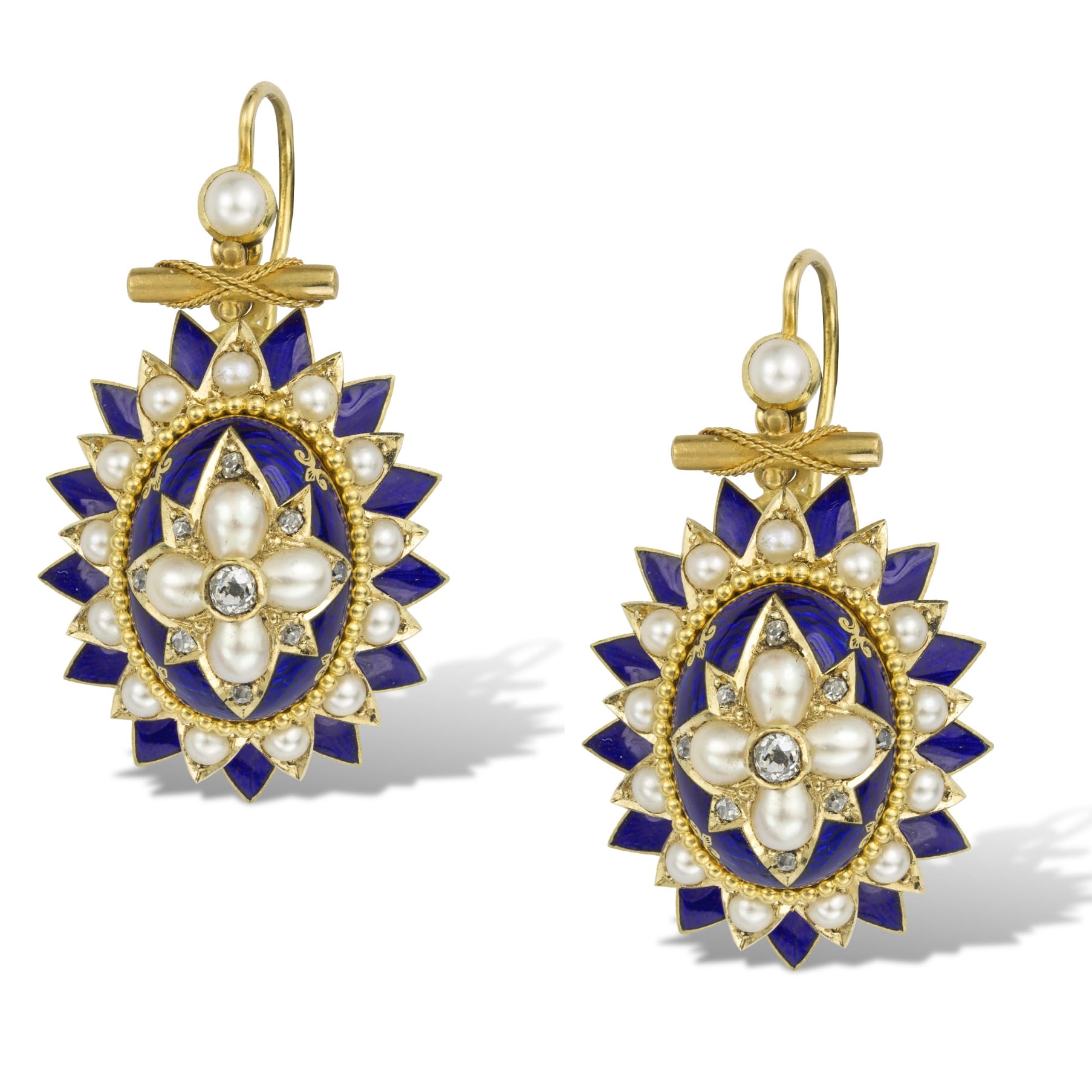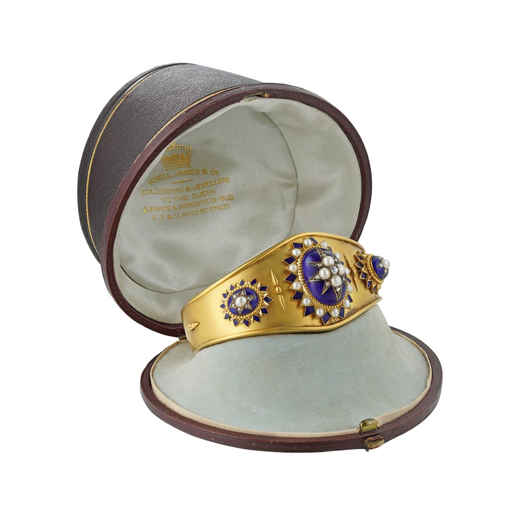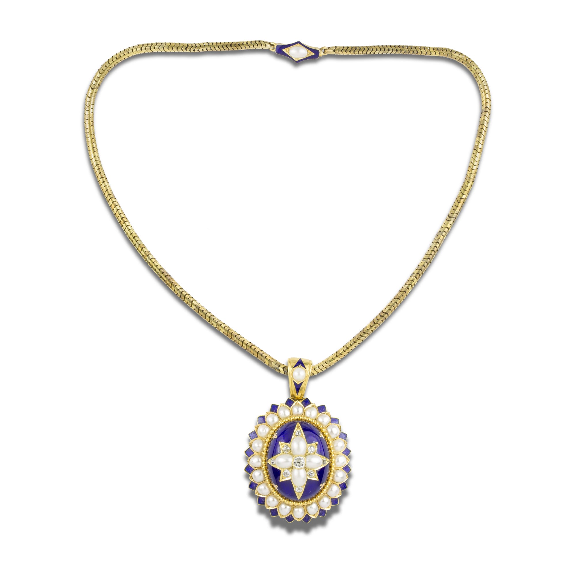 More informationA mid-Victorian half pearl, diamond and blue enamel suite, the suite consisting of a necklace, a bracelet and a pair of earrings, each set to the centre with an old cut diamond surrounded by four half-pearls, embellished with rose-cut diamonds on blue enamel dome, surrounded by a cluster of half pearls within blue-enamel border, all set to yellow gold mount, the necklace suspended by snake chain with half-pearl and enamel clasp, the matching bracelet with gold cuff fitting, in fitted cases by Howell James & Co circa 1860, the pendant measuring approximately 5.5 x 3.6cm, the earrings measuring approximately 4.5 x 2.5cm, the bracelet 5.4cm in diameter, gross weight 121.4 grams.