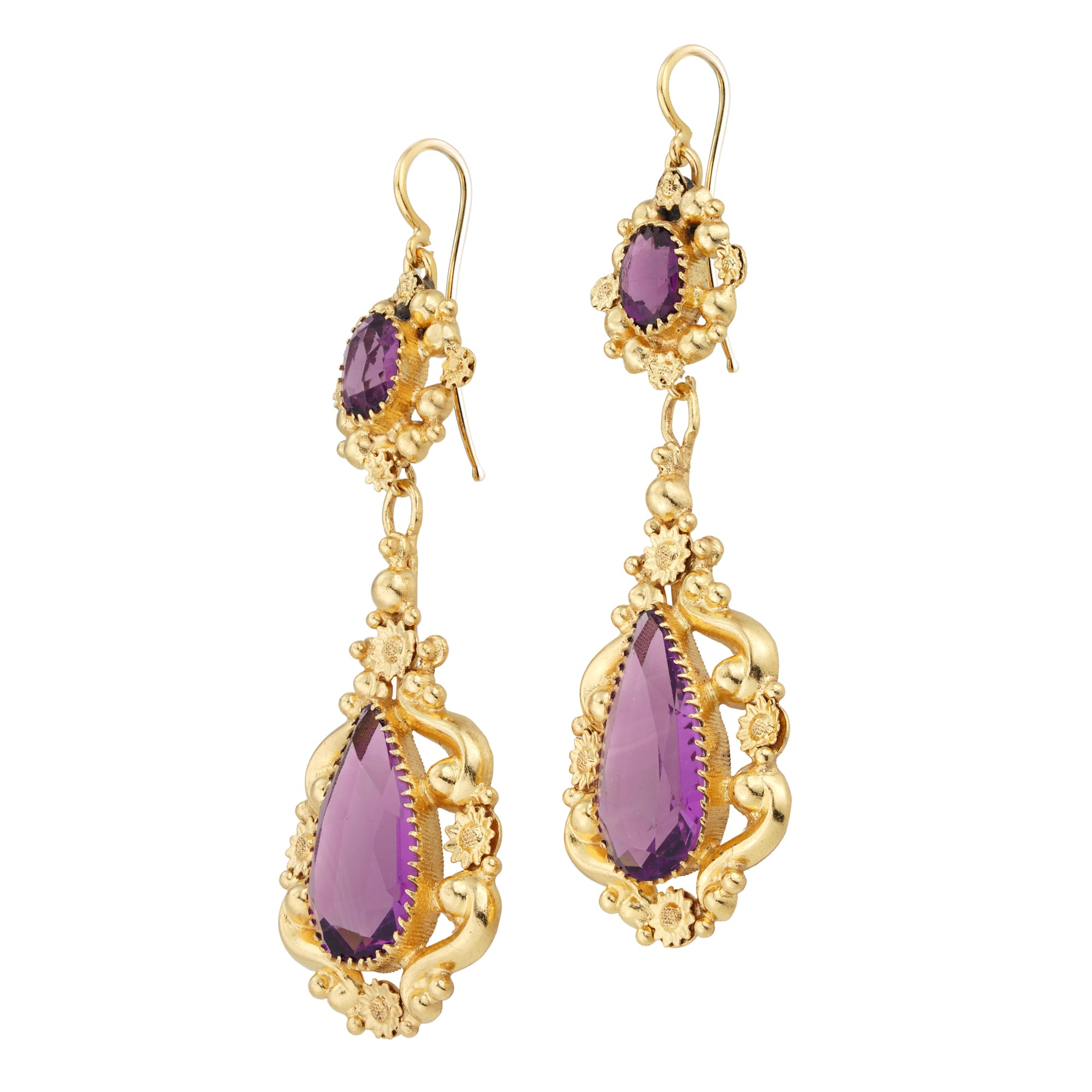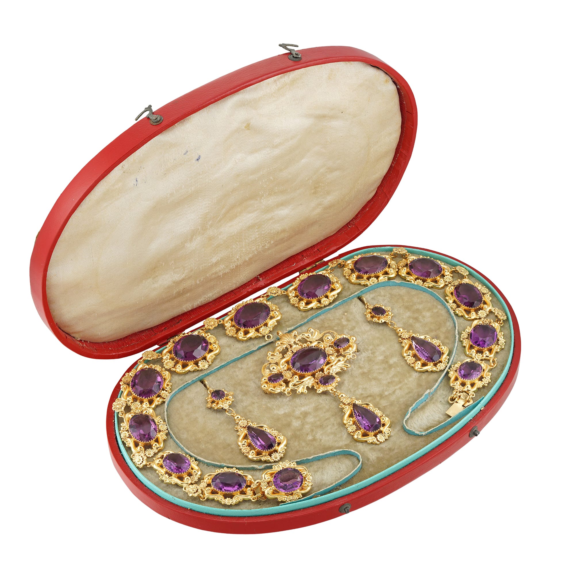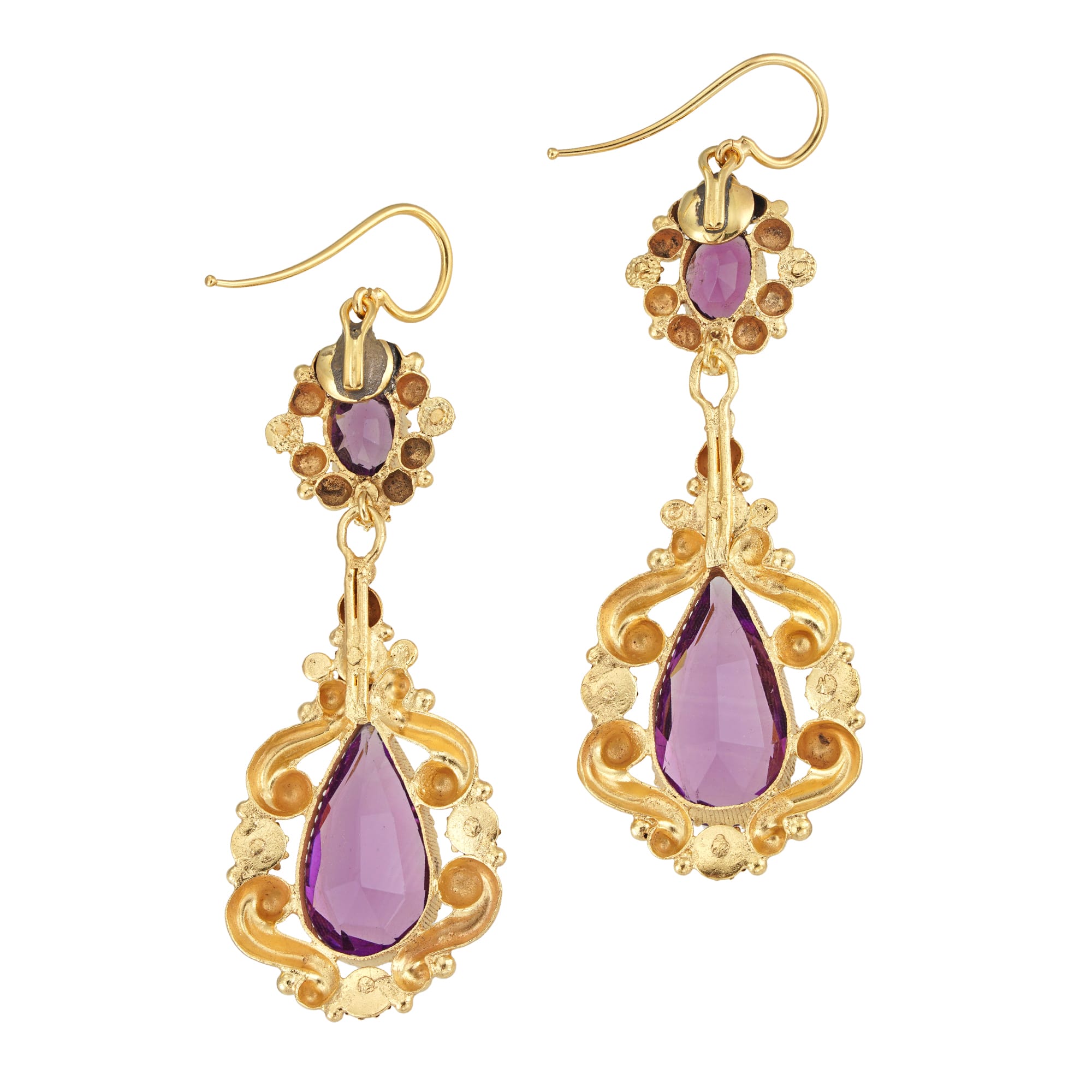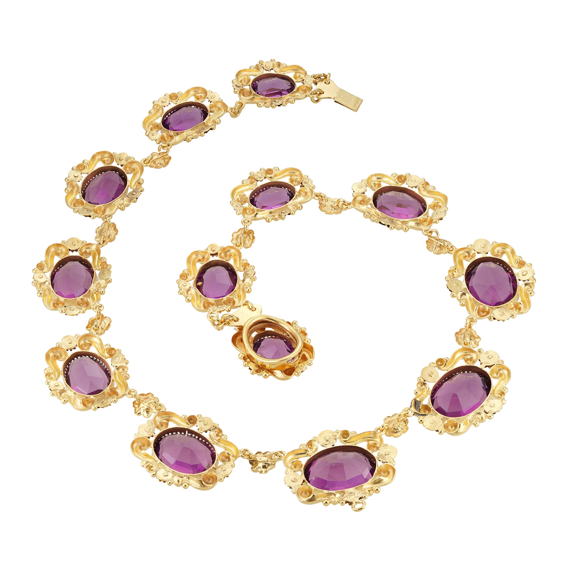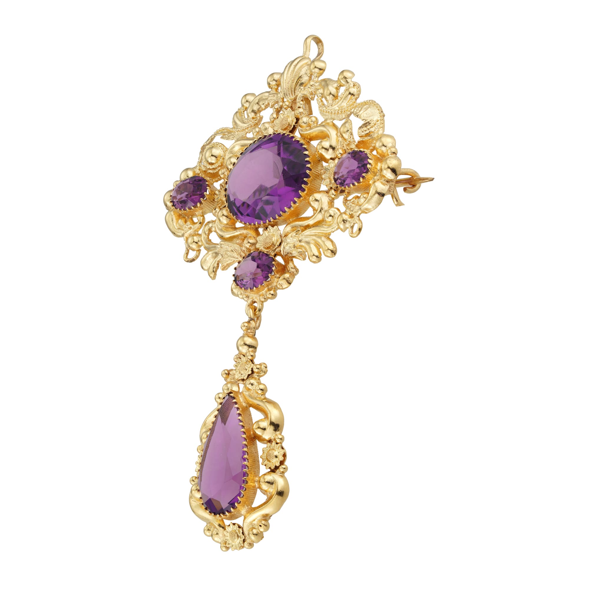 A Regency purple paste and yellow metal parure, consisting of necklace, pendant/brooch and a pair of earrings, the necklace consisting of thirteen graduating from the centre oval links with hidden clasp, the detachable pendant/brooch with a rhombic-shaped top set with one large and three smaller oval stones, suspending a pear-shaped drop, the earrings, each set with an oval-shaped top suspending a pear-shaped drop, with wire fittings, all set with purple faceted paste stones and mounted in yellow metal with repousse scroll and floral designs, circa 1830, the necklace measuring approximately 16 inches long, the pendant/brooch measuring approximately 3×2 inches and the earrings measuring approximately 2.25 inches long, circa 1830, gross weight 82 grams,