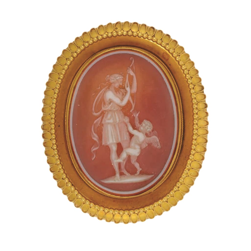 An exquisite cameo suite by Joseph Mayer. Mayer was a nineteenth century antiquities collector and goldsmith, who collected and drew inspiration from antiquities. This set exemplifies Mayer’s passion for neoclassical imagery, featuring a wonderful brooch with a cameo depicting Diana and Cupid. Diana is recognizable from the bow she carries, which Cupid also reaches towards. The earrings feature a further goddess, depicted in profile leaning against a plinth. The cameos are fine white on pink stone, framed by Roman-style gold borders and decoration.