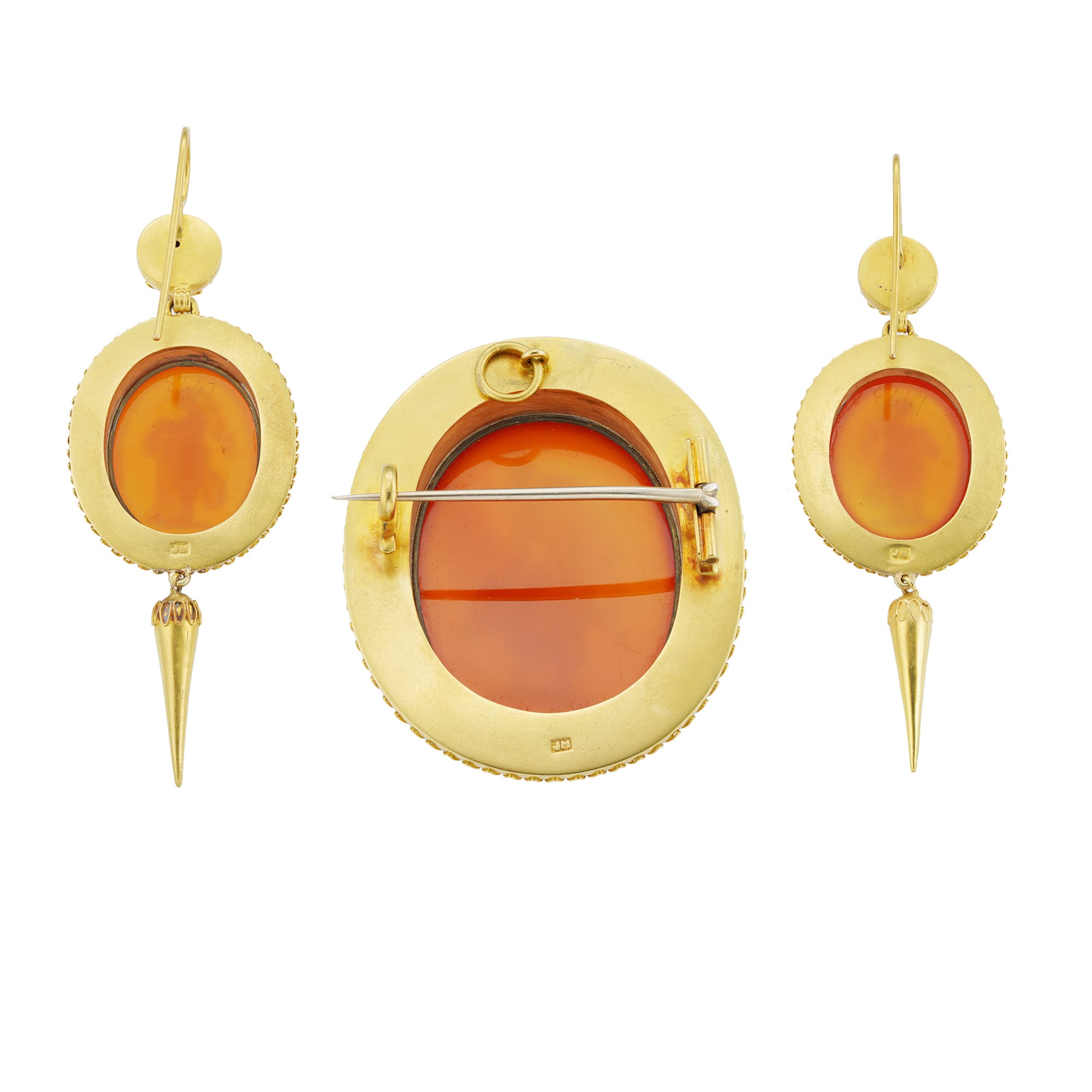 A Victorian cameo and gold suite by Joseph Mayer, the brooch set to the centre with an oval cameo measuring approximately 32 x 24 mm, the earrings each set with a cameo measuring approximately 19 x 14 mm, suspended to ...