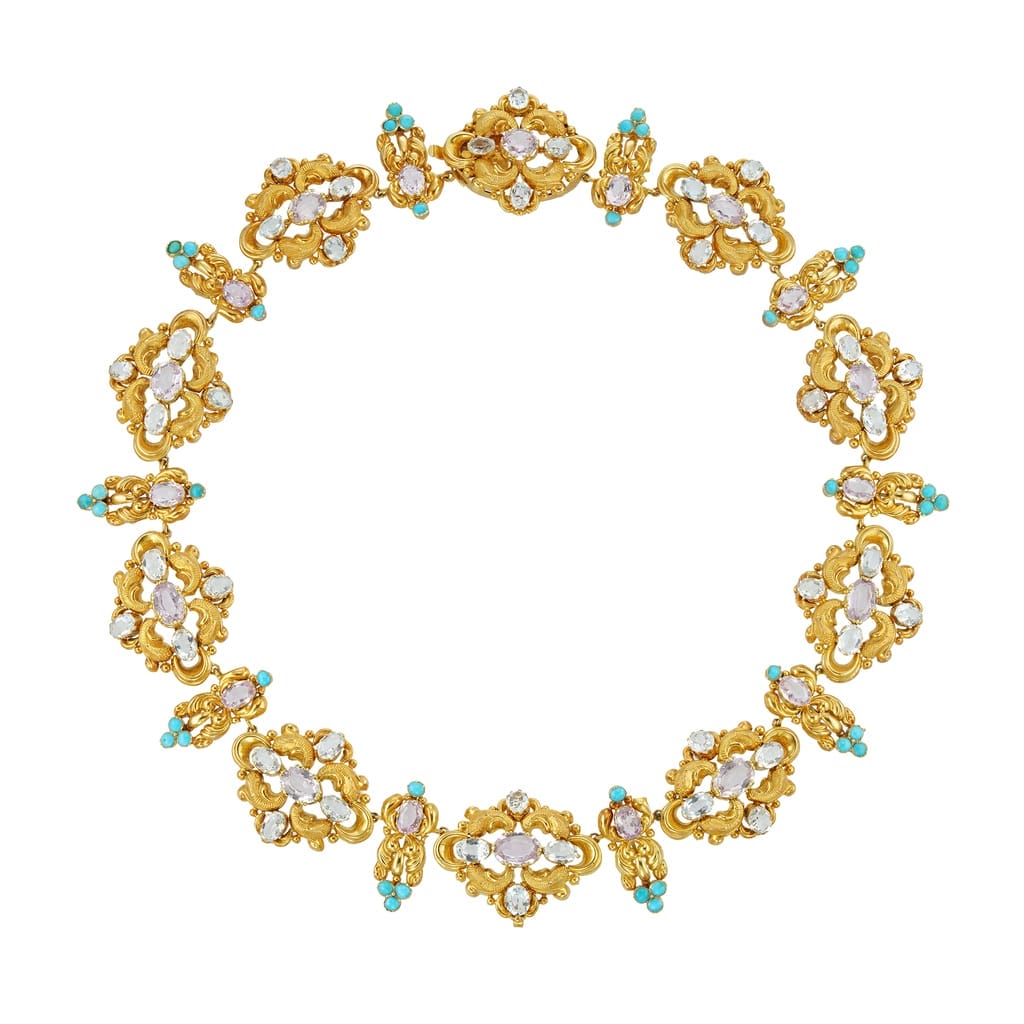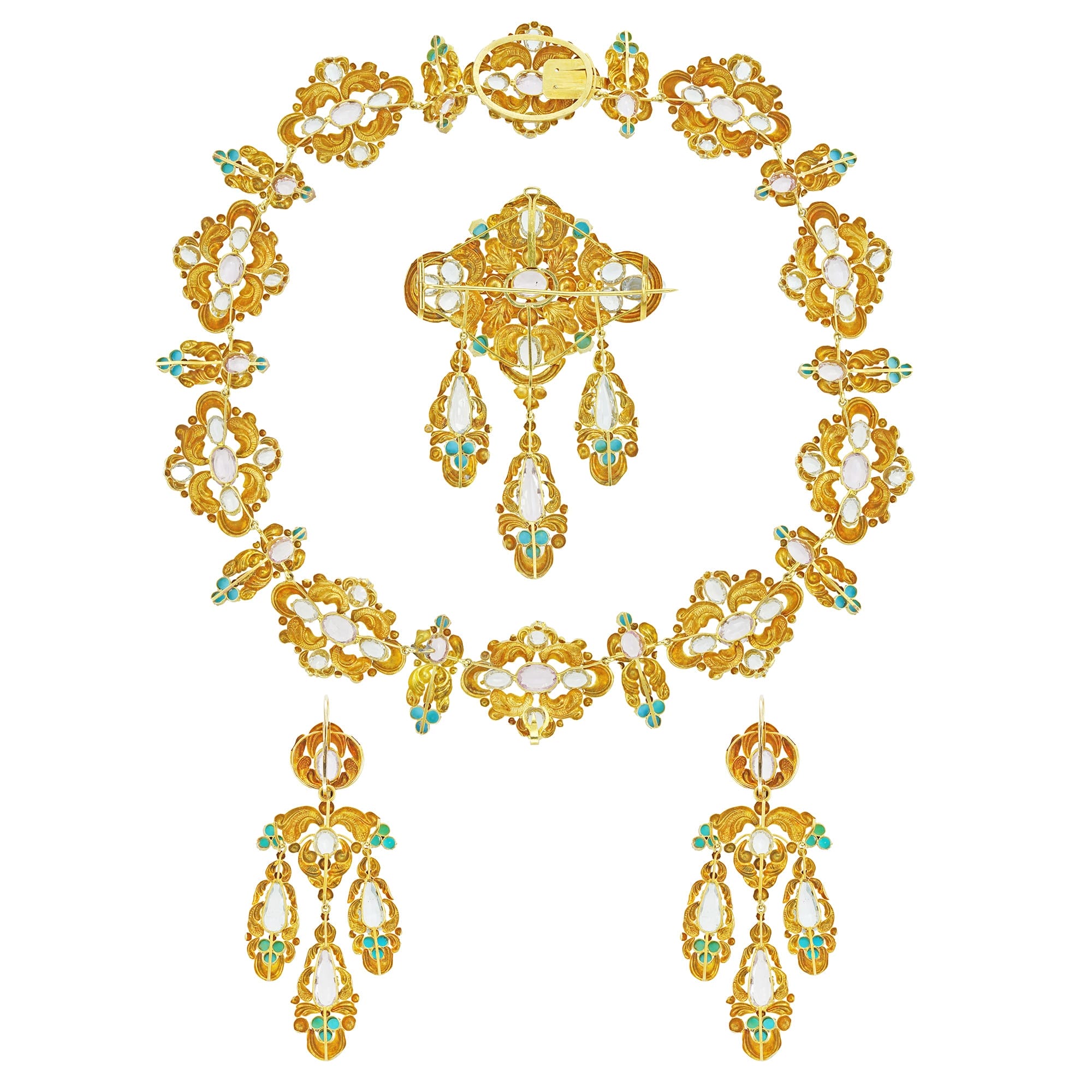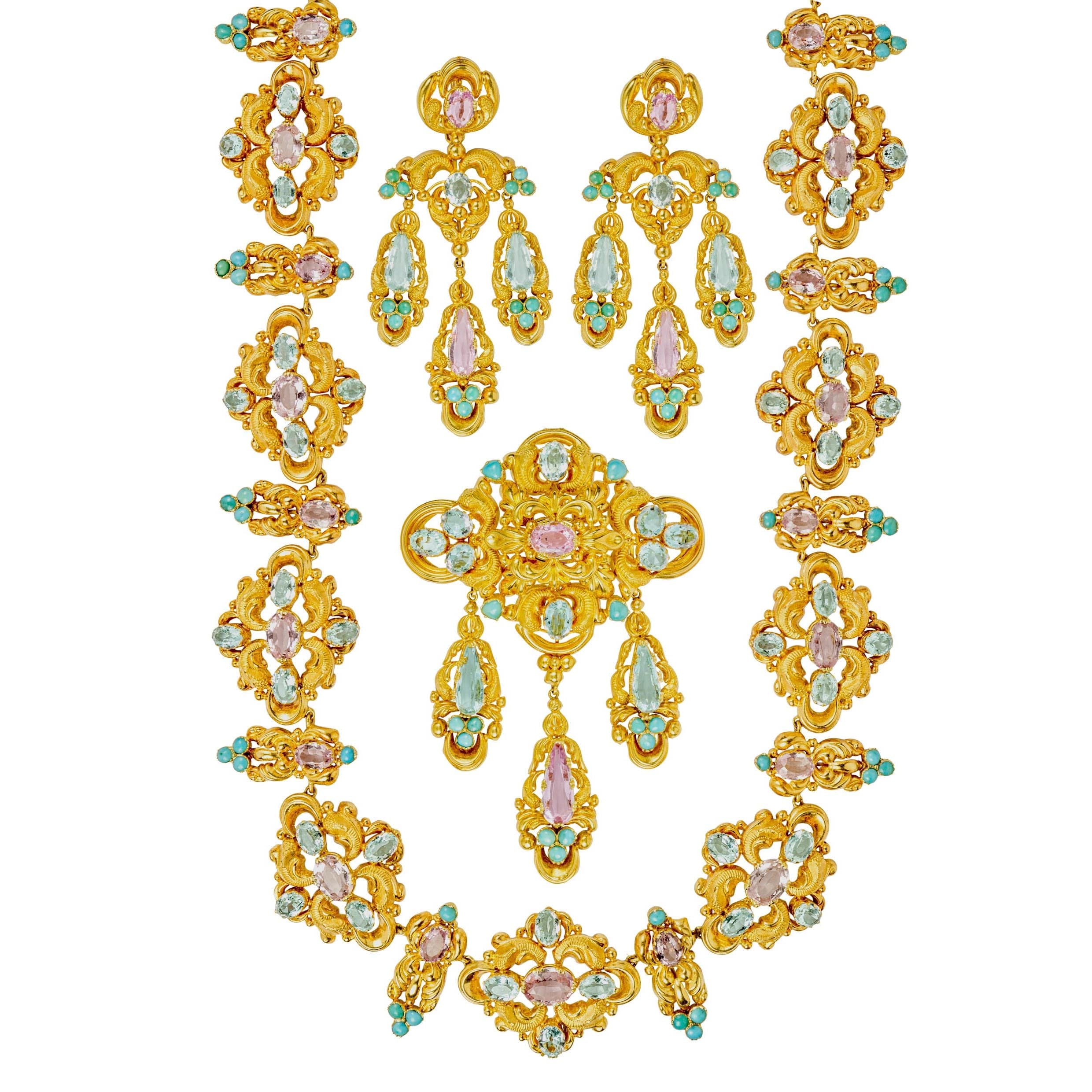 A stunning Georgian demi parure. This suite features a matching brooch, necklace, and pair of earrings, each featuring ornate scrolled yellow gold set with pink topaz, pastel-hued aquamarine and cabochon-cut turquoise. Colourful and exuberant, this exceptional suite captures the elegance and ornate, Romantic styles of the 1820s. This set would look stunning paired with an evening gown, with the brooch pinned to the centre of the bodice as it would have been worn in the nineteenth century.