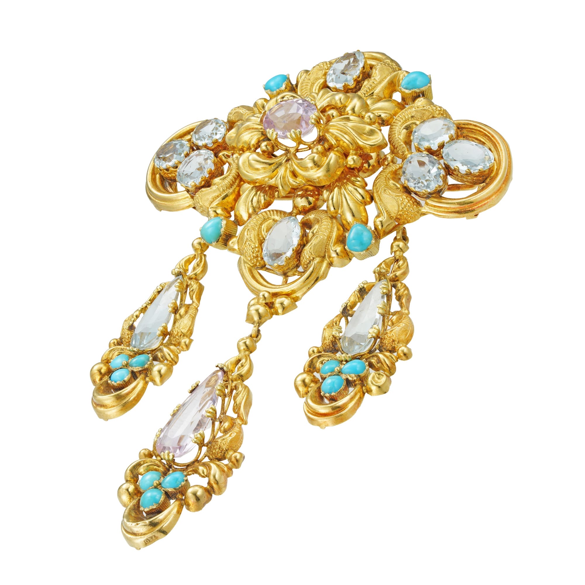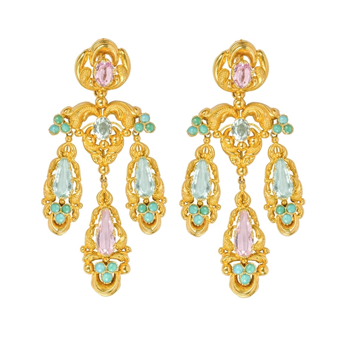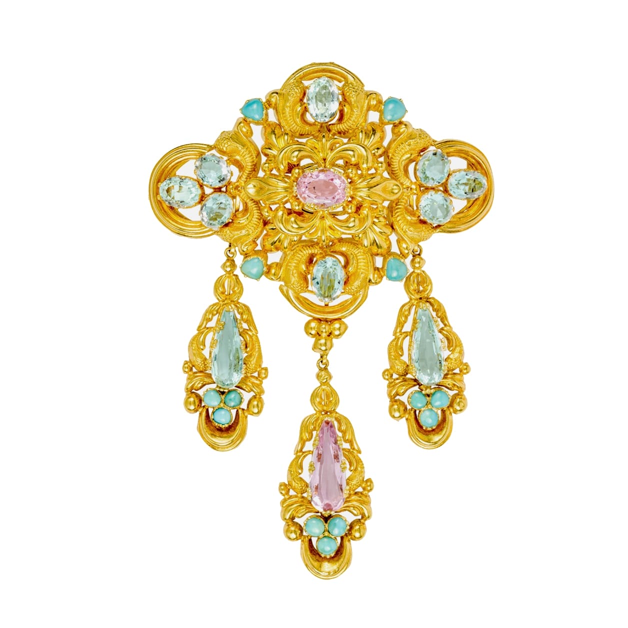 A stunning Georgian demi parure. This suite features a matching brooch, necklace, and pair of earrings, each featuring ornate scrolled yellow gold set with pink topaz, pastel-hued aquamarine and cabochon-cut turquoise. Colourful and exuberant, this exceptional suite captures the elegance and ornate, Romantic styles of the 1820s. This set would look stunning paired with an evening gown, with the brooch pinned to the centre of the bodice as it would have been worn in the nineteenth century.