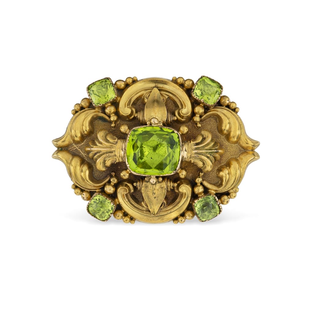 A stunning early Victorian parure. This three-piece suite features a matching set of necklace, earrings, and brooch. This parure is exquisitely ornate, made in a style emblematic of the early Victorian period, when inspiration came from the Medieval and Renaissance periods. The bright, pale green peridot contrasts wonderfully with the rich yellow gold setting of this parure. The chain is detailed, and the settings of the peridot on the necklace, earrings, and brooch are regal and ornamental. All pieces in this set can be worn together for a dramatic and sumptuous look, or each piece can be donned separately.