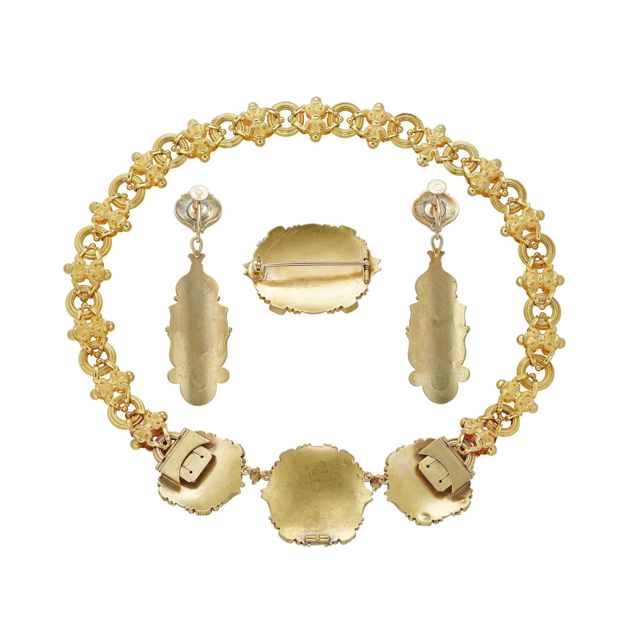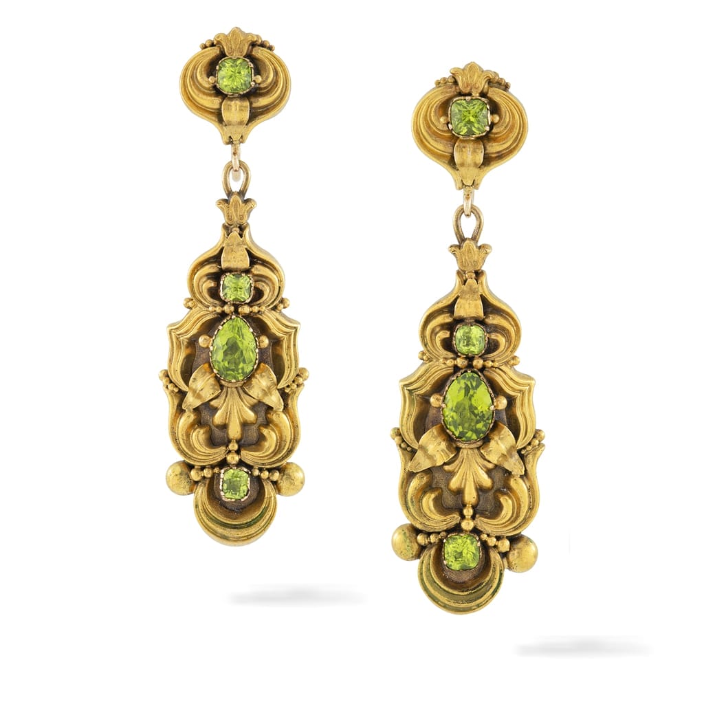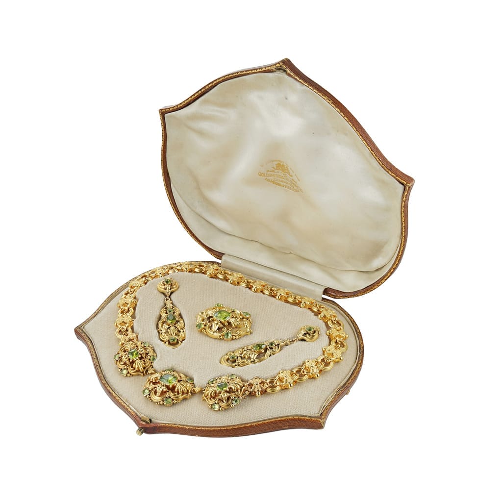 An early Victorian peridot and gold parure in the Knight pattern, the necklace consisting of three plaques each set with five cushion shape faceted peridots set in a stamped gold eclectic design surround, attached to a chain consisting of sixteen round links alternating with foliate design links in-between, the oval-shaped brooch set with five cushion shape faceted peridots on a matching eclectic design background and the earrings of similar design each set with three cushion and one pear-shape faceted peridots, the peridots weighing a total of 12.73 carats, all rubover set in yellow gold mounts, circa 1840, the necklace 48.5cm long and 1.1cm wide with the central element to be approximately 3x3cm size, earrings 6.4cm long, the brooch measures 2.7×3.9cm, gross weight 76.3 grams, with original fitted box.