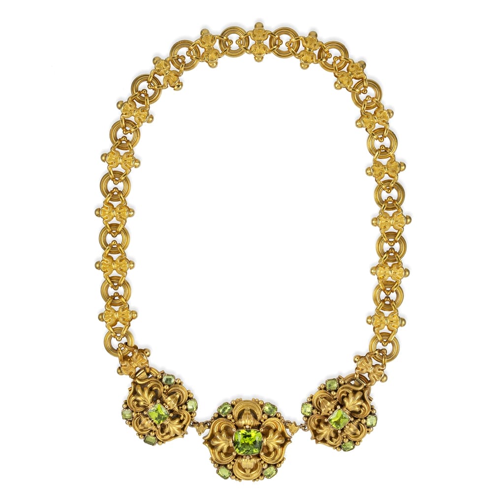 An early Victorian peridot and gold parure in the Knight pattern, the necklace consisting of three plaques each set with five cushion shape faceted peridots set in a stamped gold eclectic design surround, attached to a chain consisting of sixteen ...