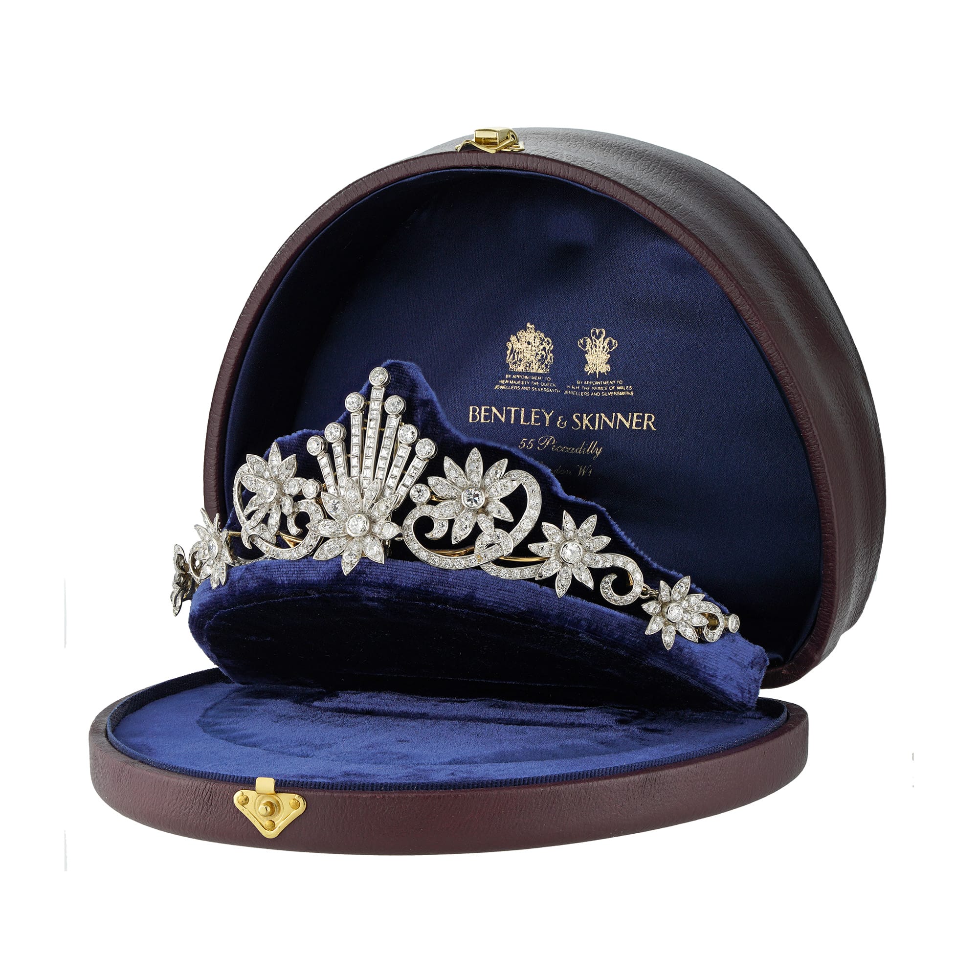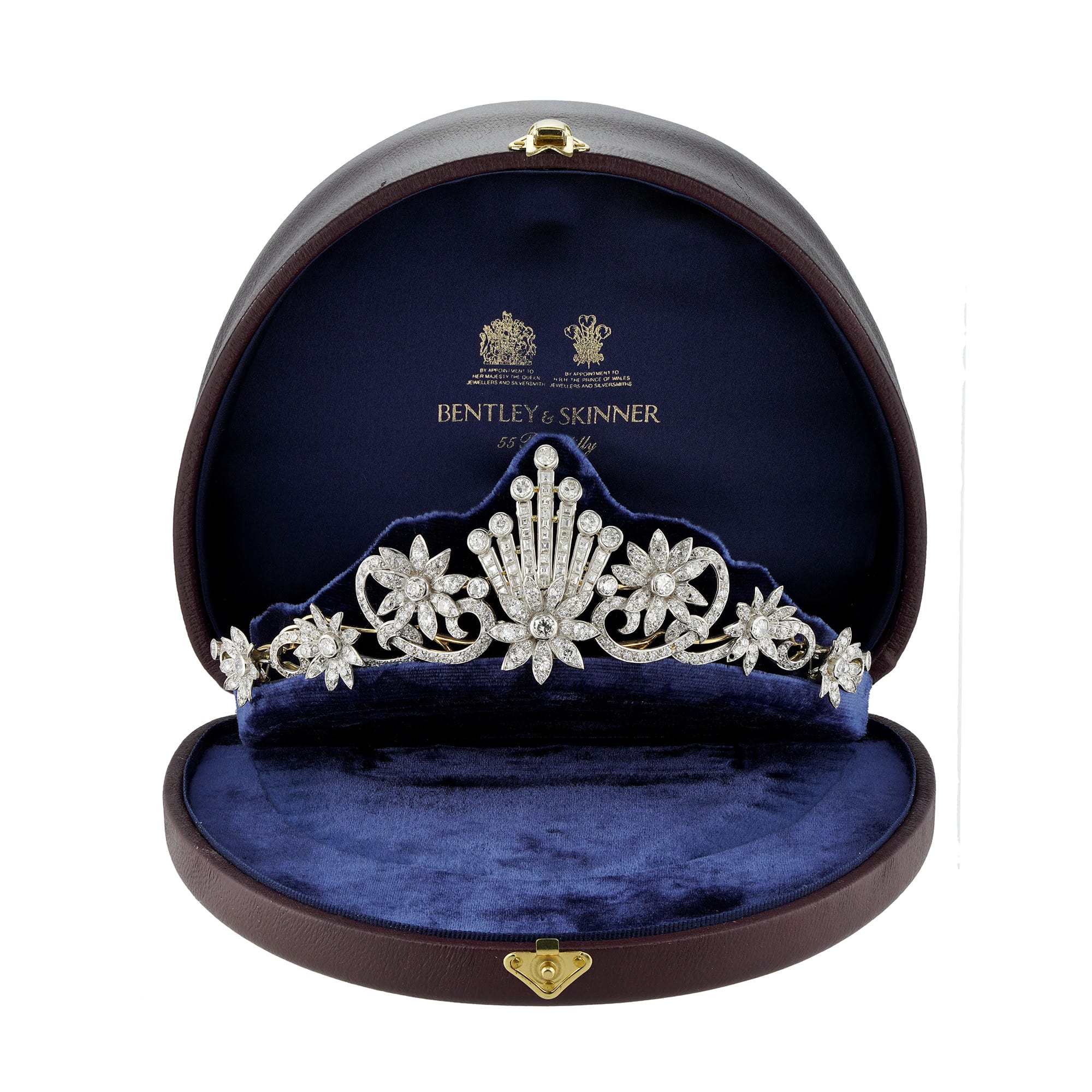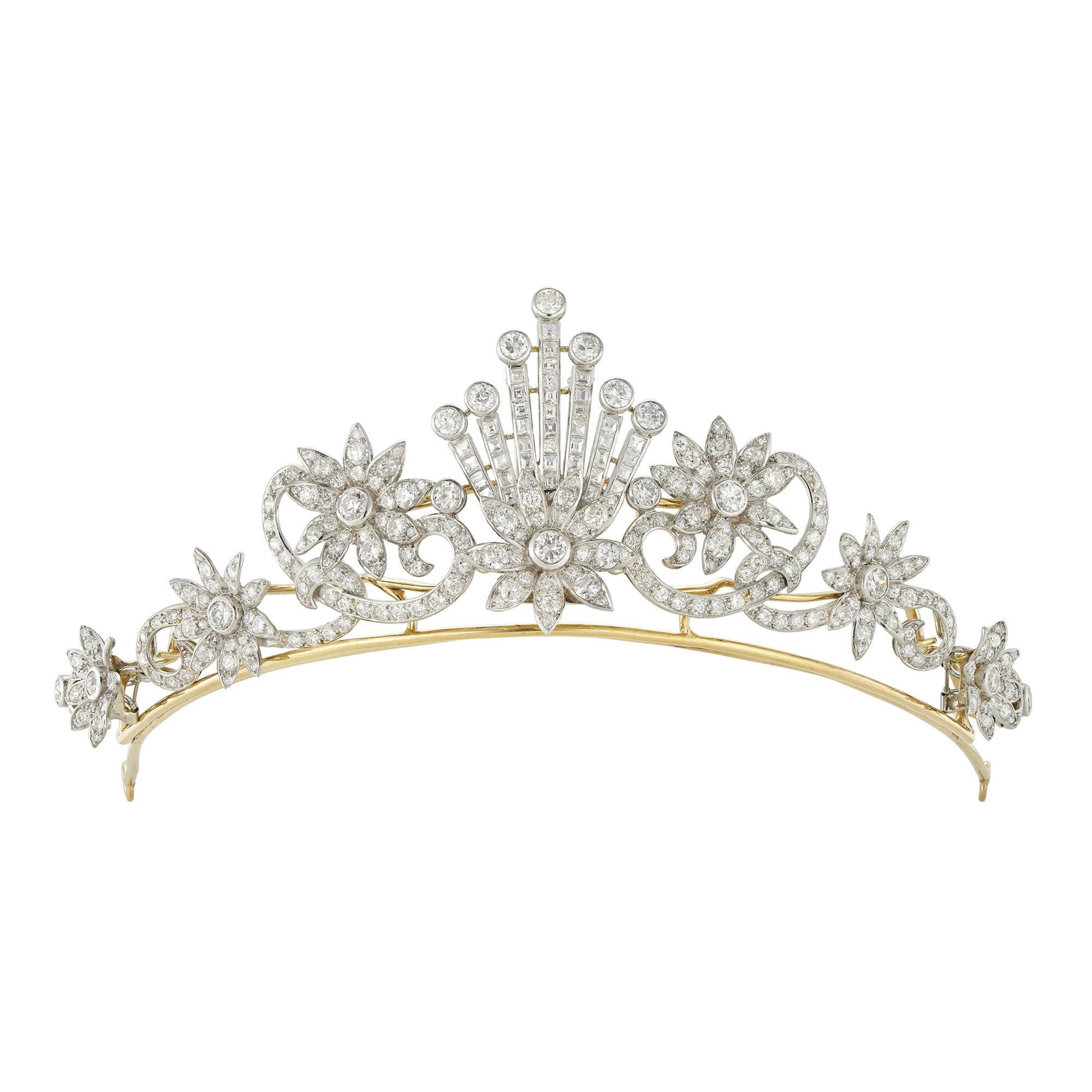 A regal early-20th century diamond-set tiara. In the heart of this radiant tiara lies a blossoming diamond flower, adorned with seven resplendent rows of diamonds gracefully culminating in a brilliant round diamond. Adorning its sides are cascading scrolls and delicate floral motifs, weaving together to craft a sublime and inherently feminine design. Dating back to the 1930s, this tiara exudes versatility, transforming into equally enchanting earrings and a necklace, embodying timeless elegance in its every facet.
